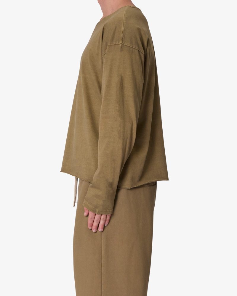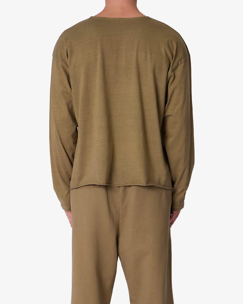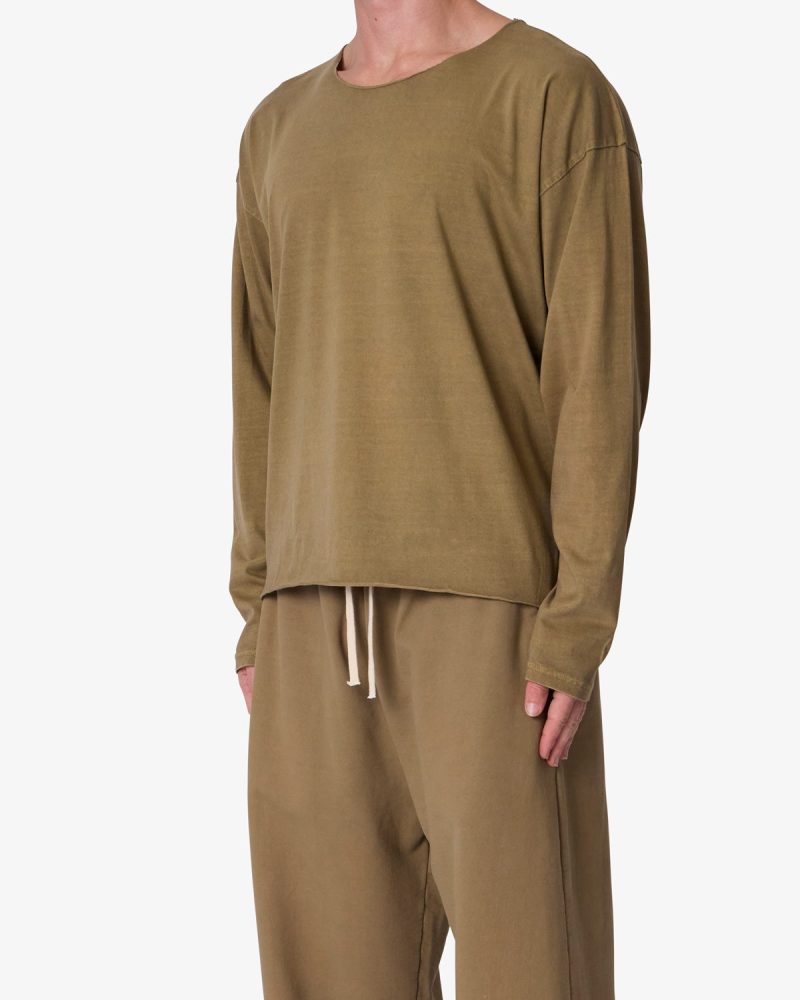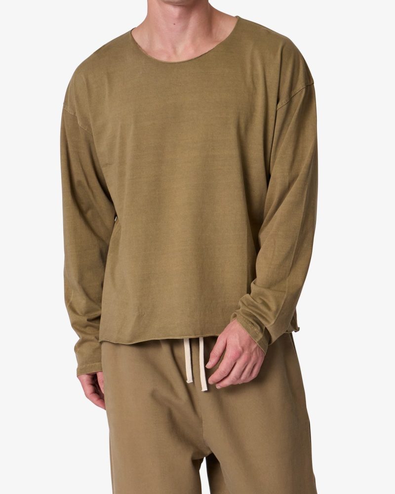 the Long Sleeve Tee features a relaxed fit with a dropped shoulder design. standard hem detail at the wrists. raw edge at the collar and bottom opening. and is finished in a garment washed cotton fabric.