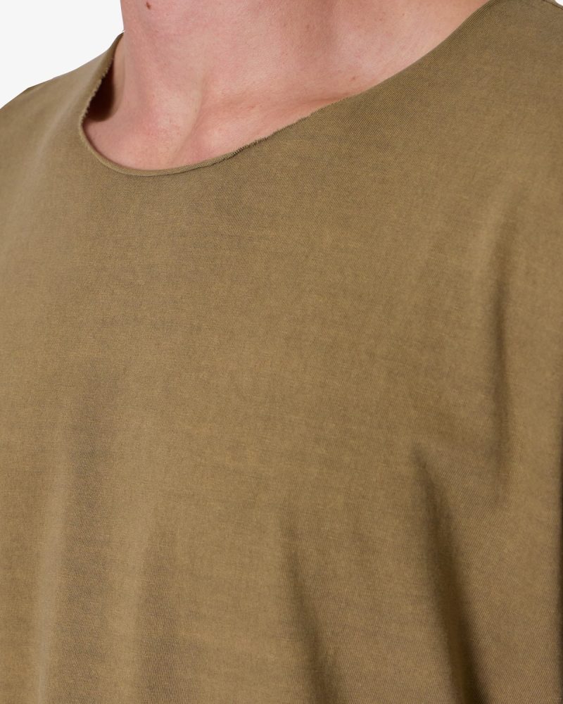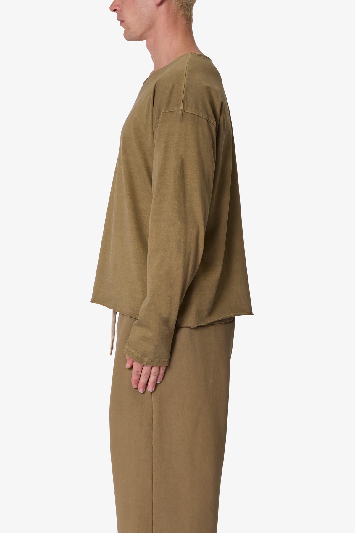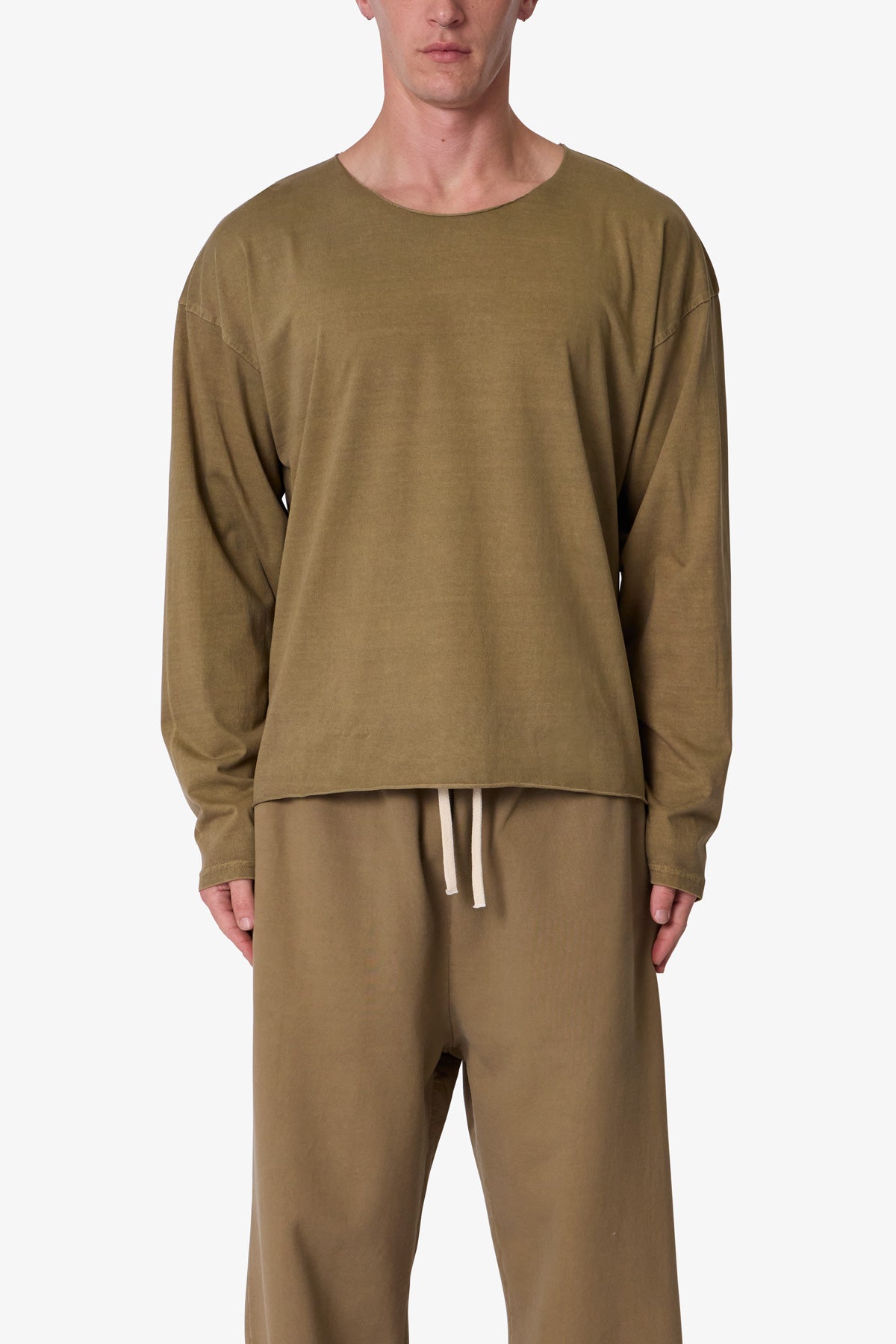 the Long Sleeve Tee features a relaxed fit with a dropped shoulder design. standard hem detail at the wrists. raw edge at the collar and bottom opening. and is finished in a garment washed cotton fabric.