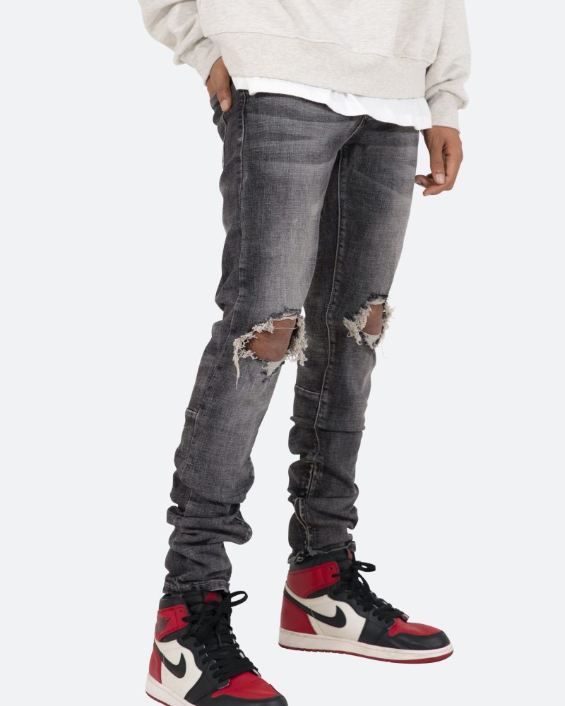 developed in los angeles. the grey m1 stretch denim is designed with a relaxed fit through the thigh that tapers from the knee to the ankle. featuring distress details at the knee and thigh. finishing off with a 10 concealed zipper on the inseam for a carefully optimized fit.