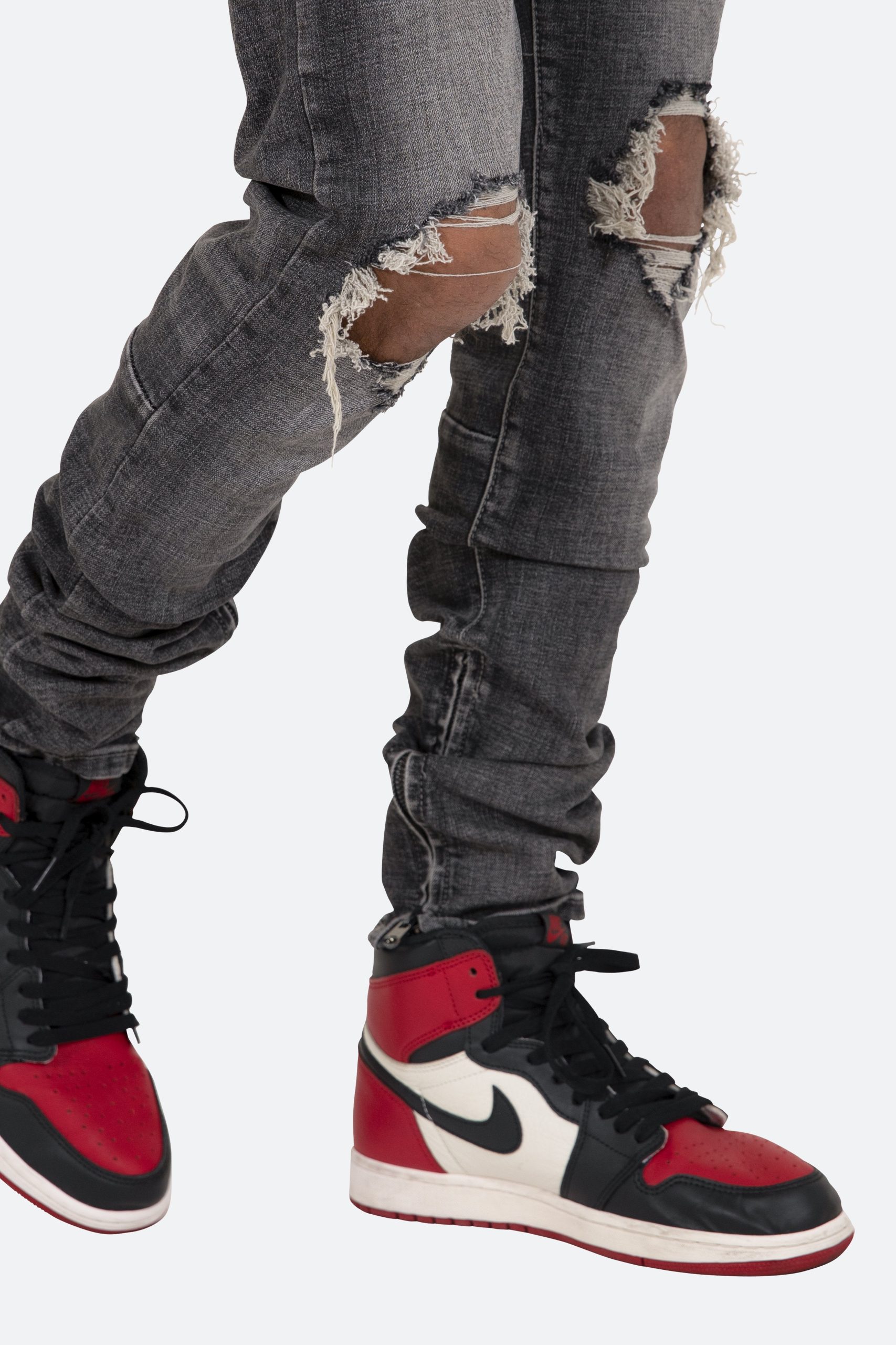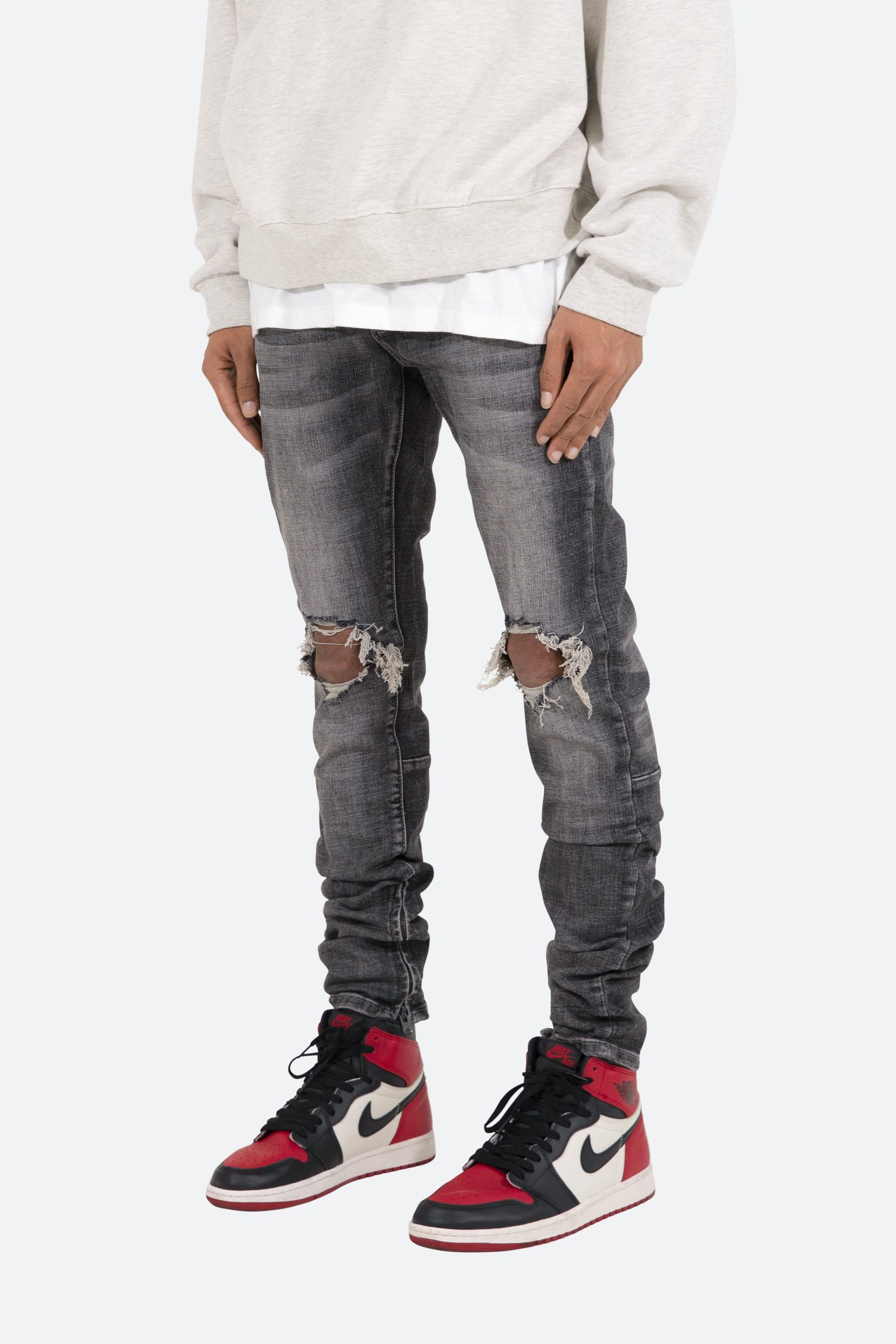 developed in los angeles. the grey m1 stretch denim is designed with a relaxed fit through the thigh that tapers from the knee to the ankle. featuring distress details at the knee and thigh. finishing off with a 10 concealed zipper on the inseam for a carefully optimized fit.