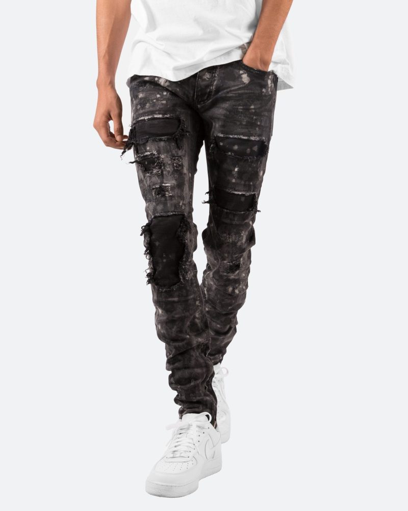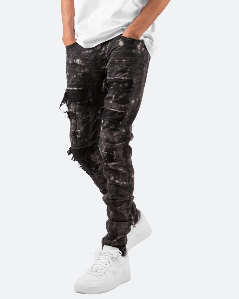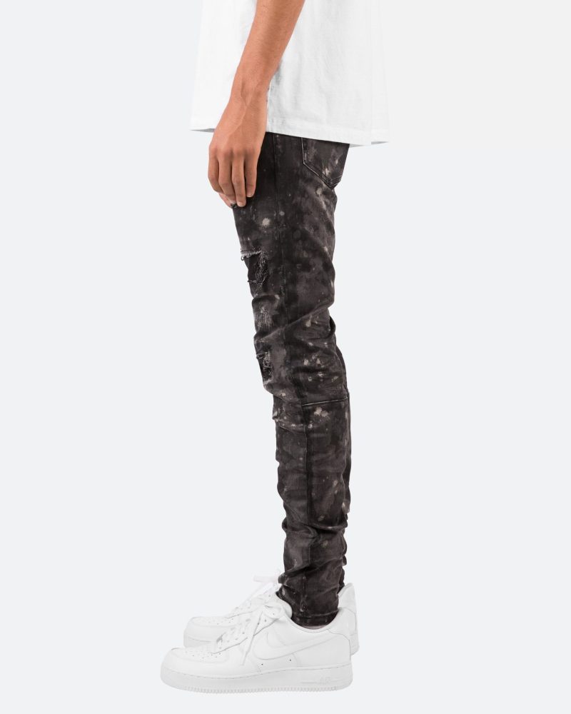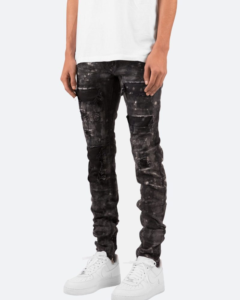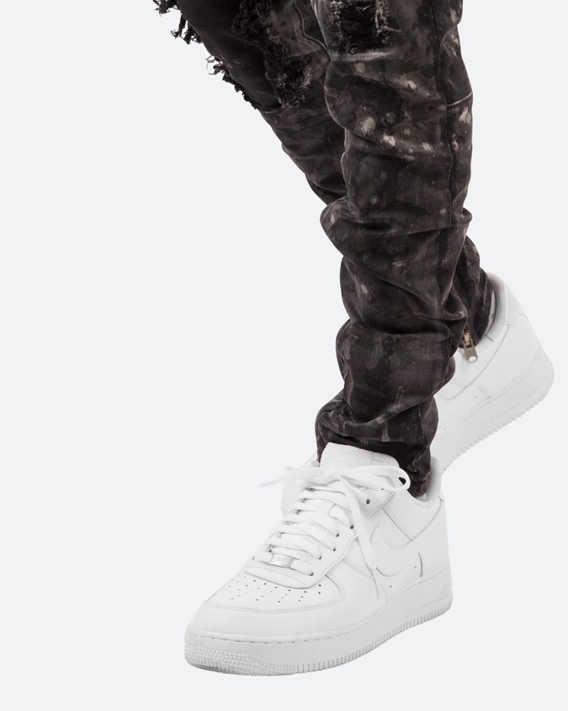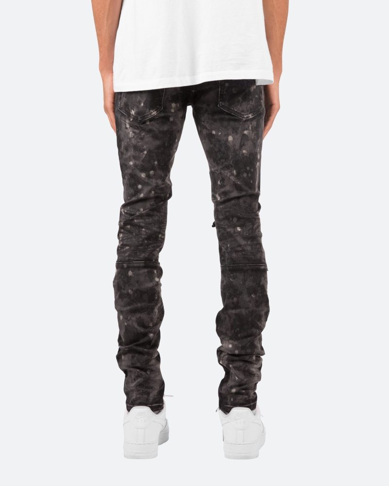 the M140 Stretch Denim is designed with a relaxed fit through the thigh that tapers from the knee to the ankle. featuring bleach detailing throughout with distressing and repairs. and is finished with a 10 concealed zipper on the inseam and a rear calf panel for a carefully optimized fit.