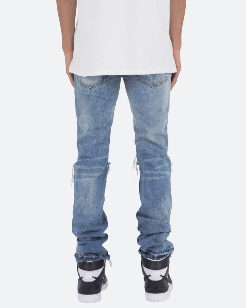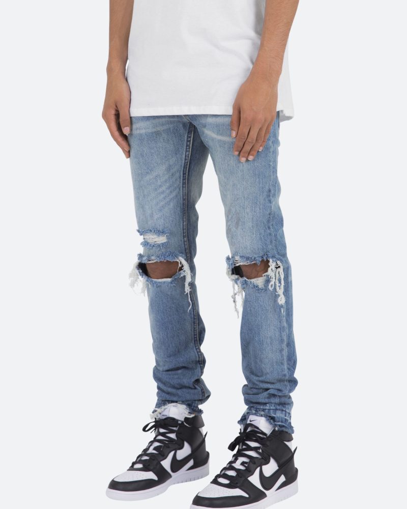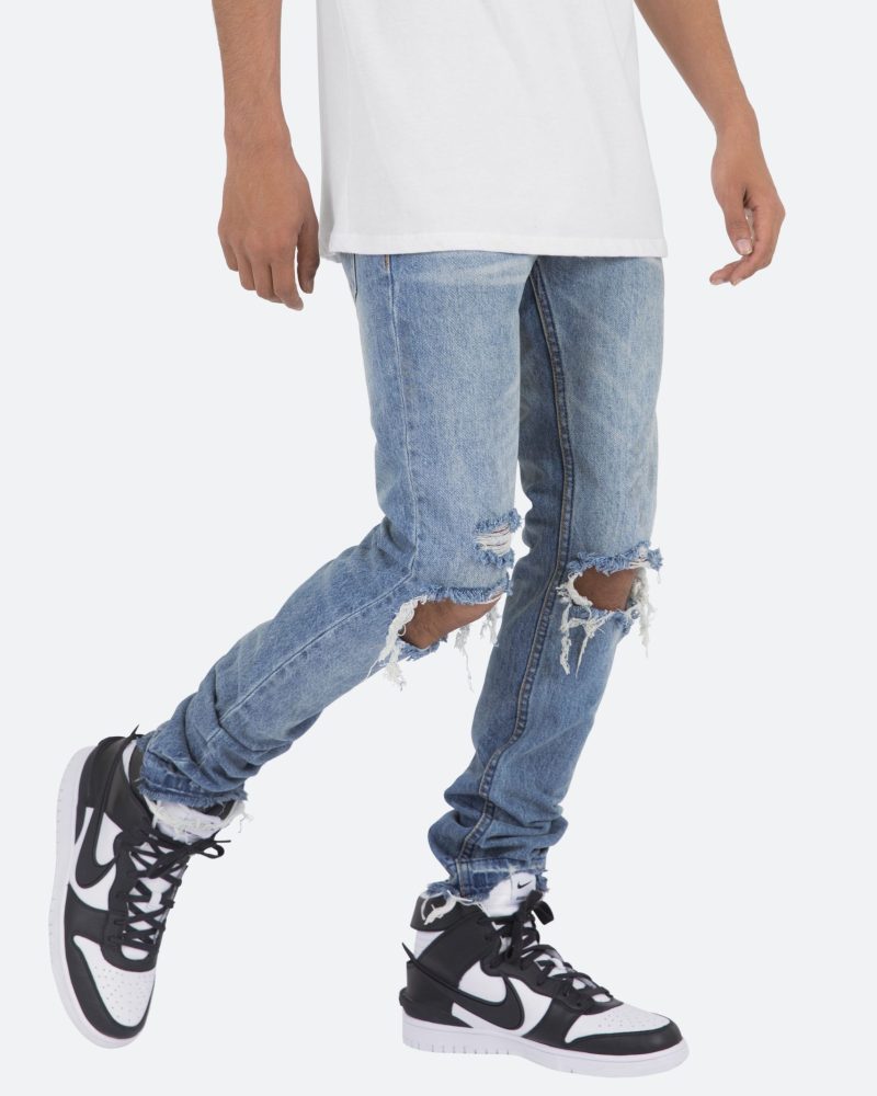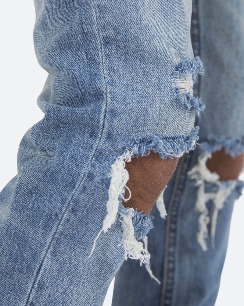 the M345 Denim is part of our new M300 line of zipperless M Denim. The M345 Denim features a relaxed fit through the thigh that tapers from the knee to the ankle. distressed details at the knees and finishes off with a traditional zipperless inseam.
