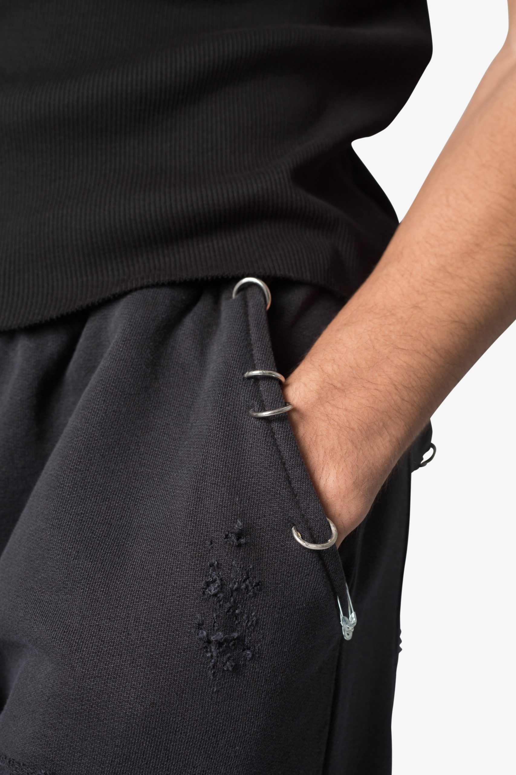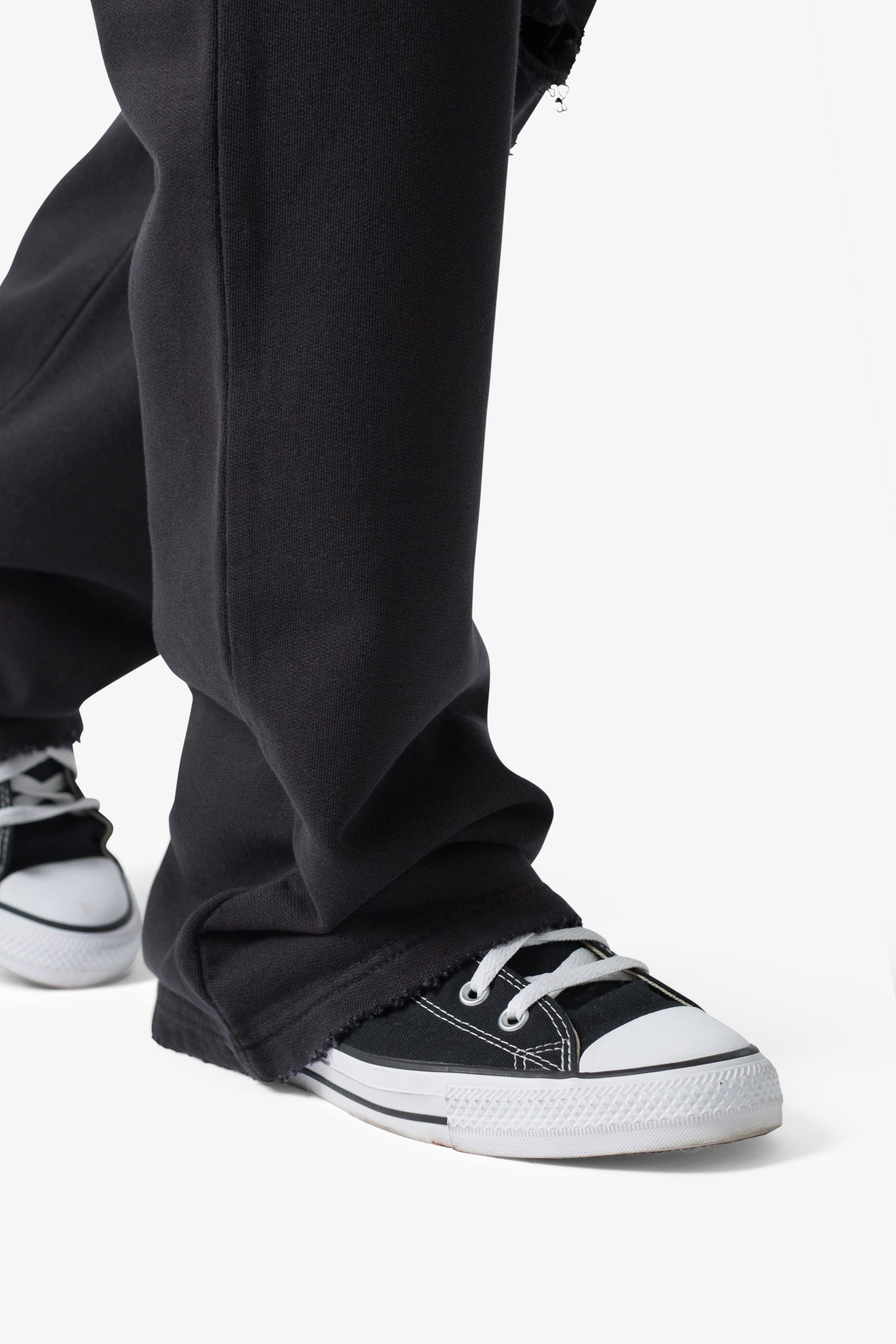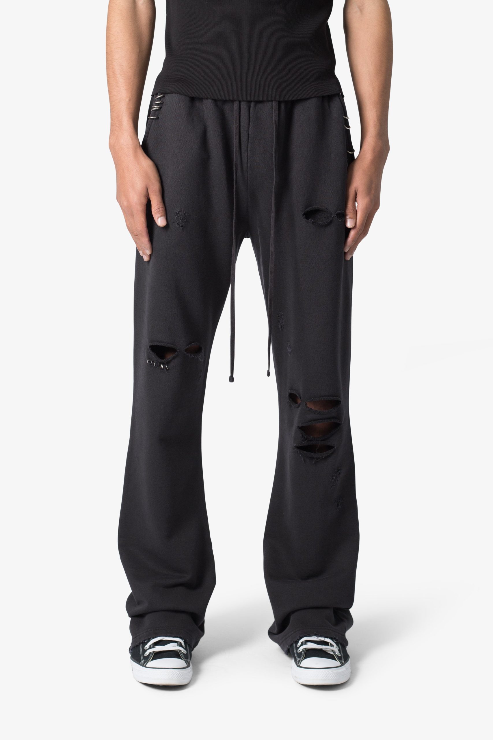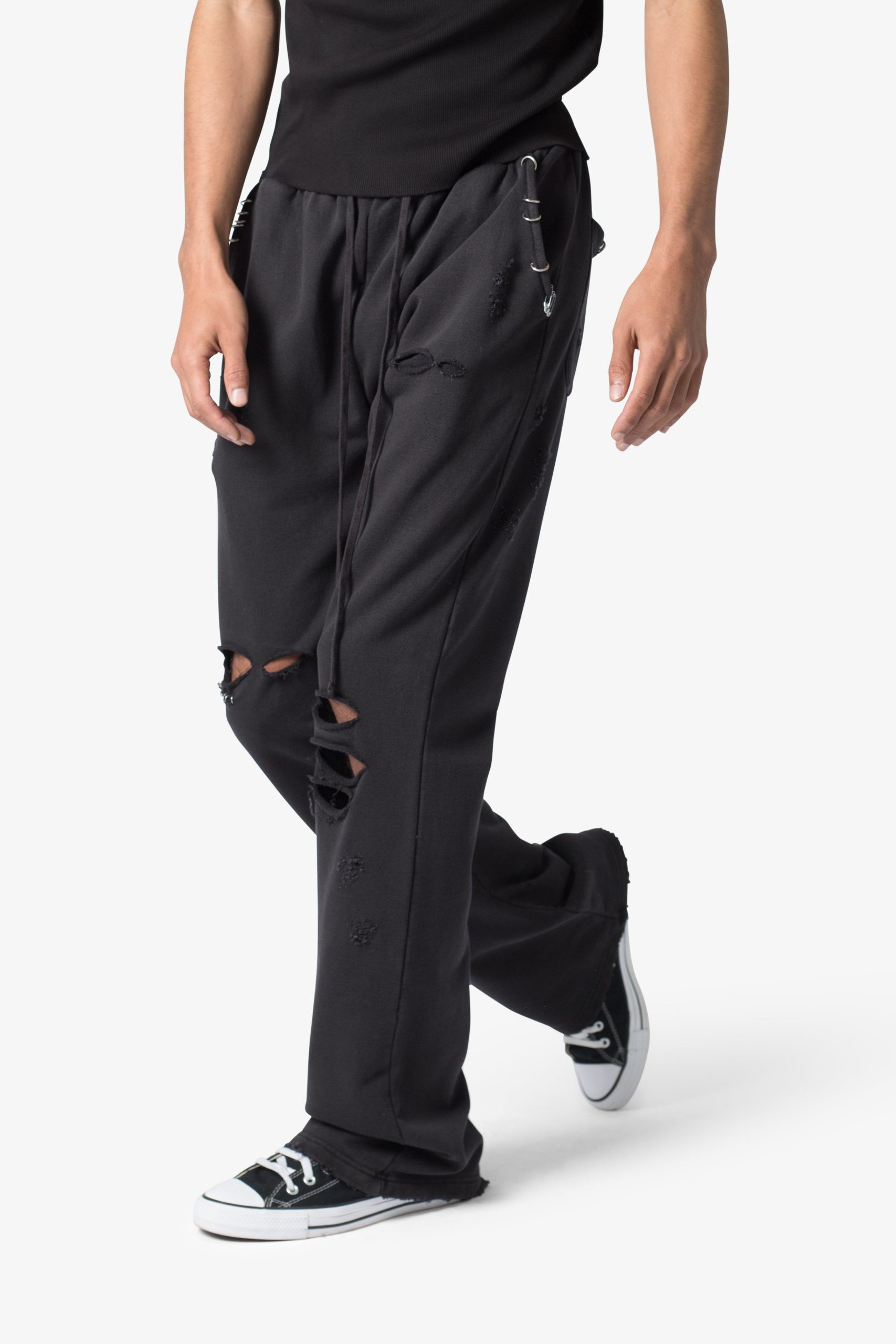 the Metal Ring Flared Sweatpants are designed with a relaxed. flared fit throughout. featuring an elasticized self waist. garment washed for improved hand feel. distressing details throughout. extended tonal drawcords. and finished with metal ring details at the pocket opening.