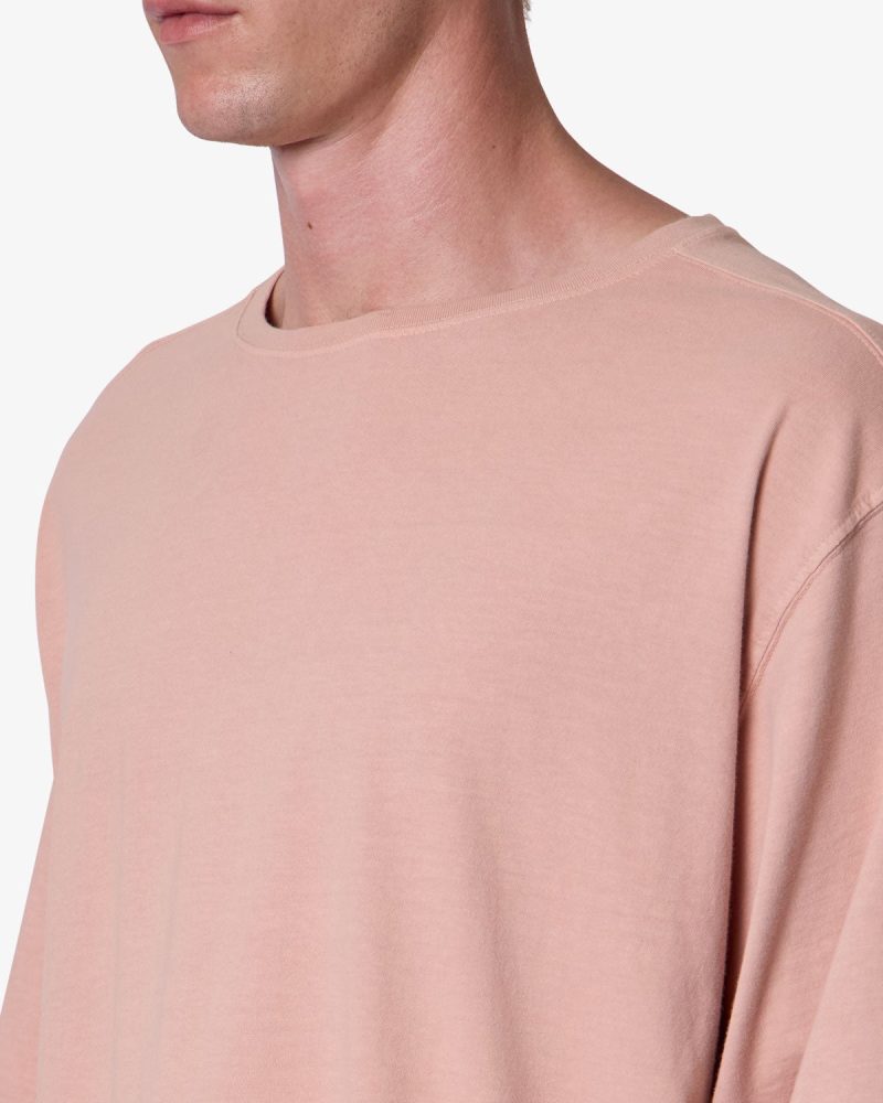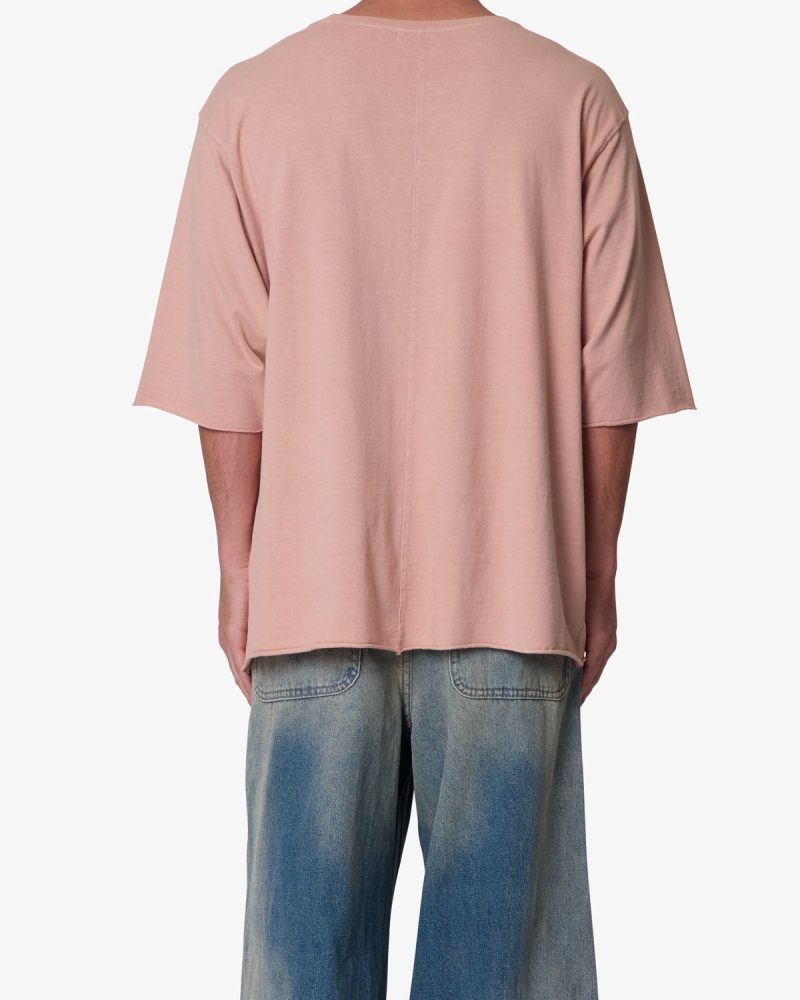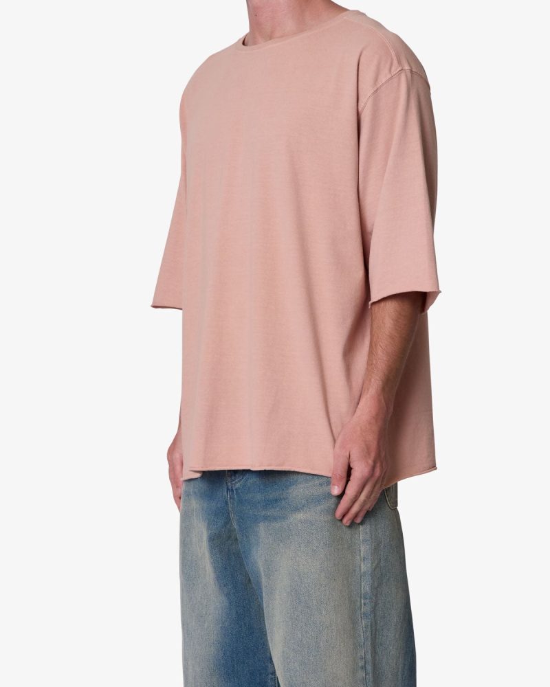 the OG Oversized Tee features a flat. raw. hem line and an extended sleeve length for a cropped. oversized fit. a center seam down the wearers back. and is finished in a garment washed cotton fabric.