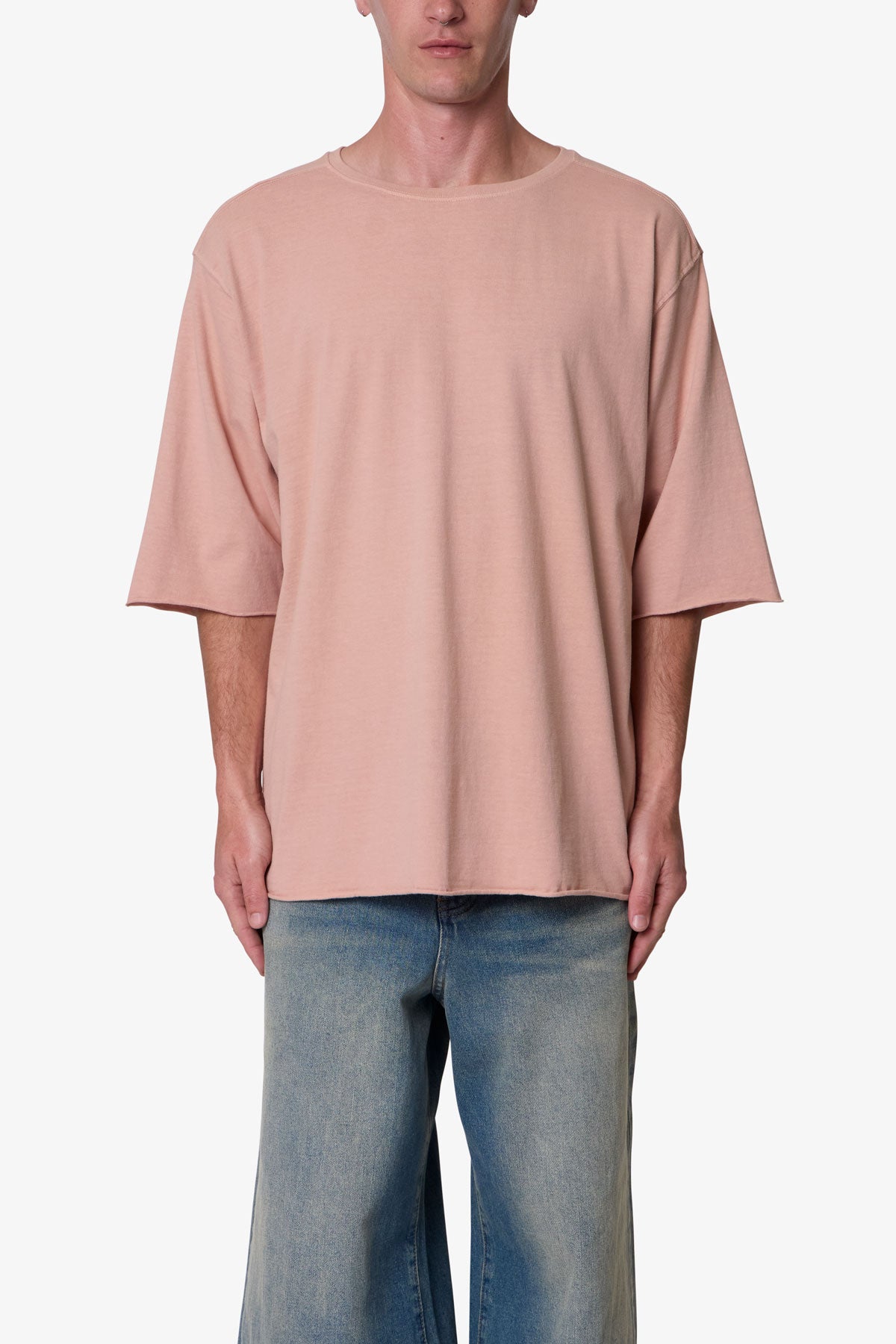 the OG Oversized Tee features a flat. raw. hem line and an extended sleeve length for a cropped. oversized fit. a center seam down the wearers back. and is finished in a garment washed cotton fabric.