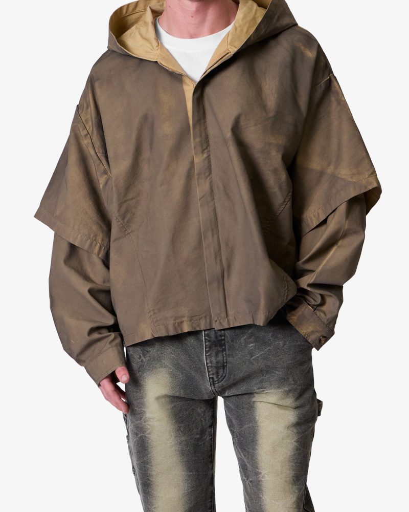 the Oiled Hunting Poncho Jacket is designed in a relaxed fit from a 100% cotton twill fabric. button closure at the wrists on the base layer. short sleeves on top of the base long sleeves for a layered appearance. and finished with an oil wash.