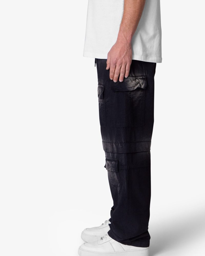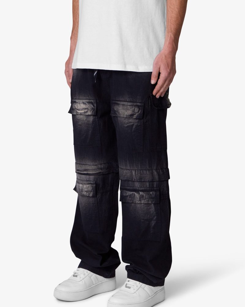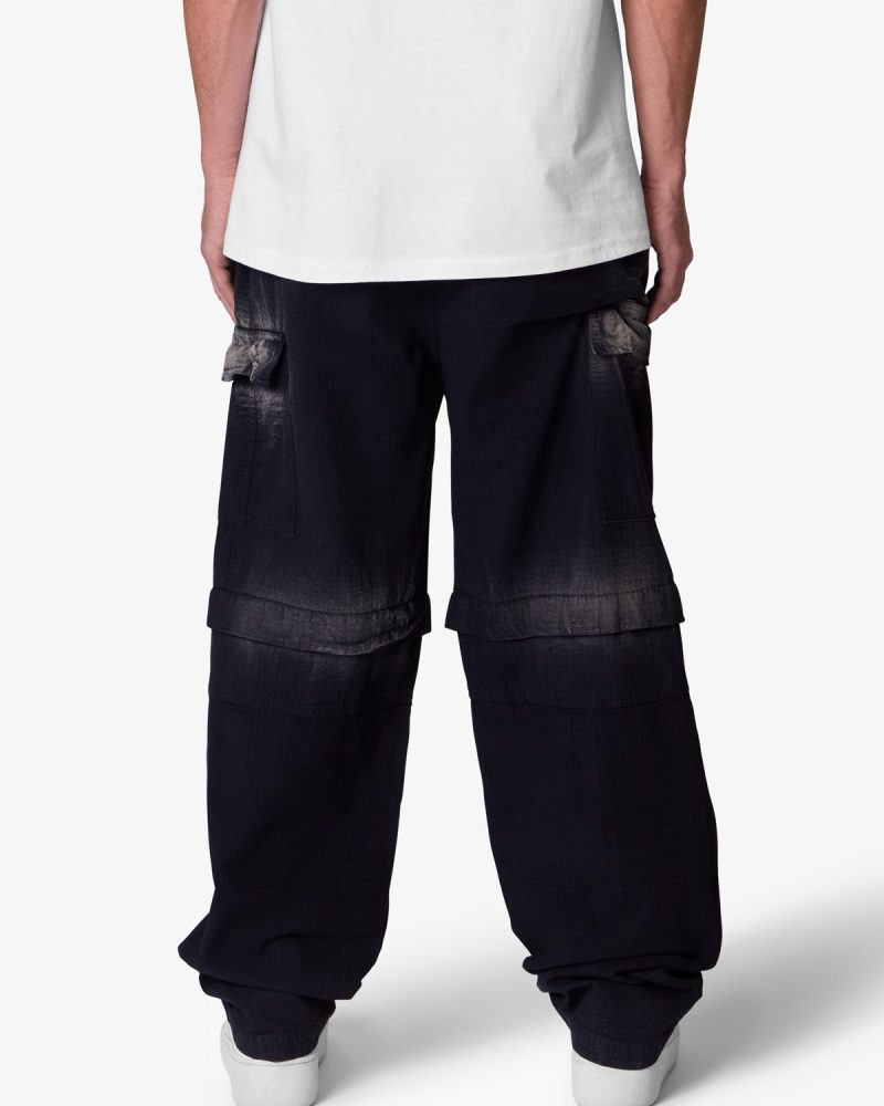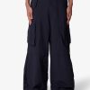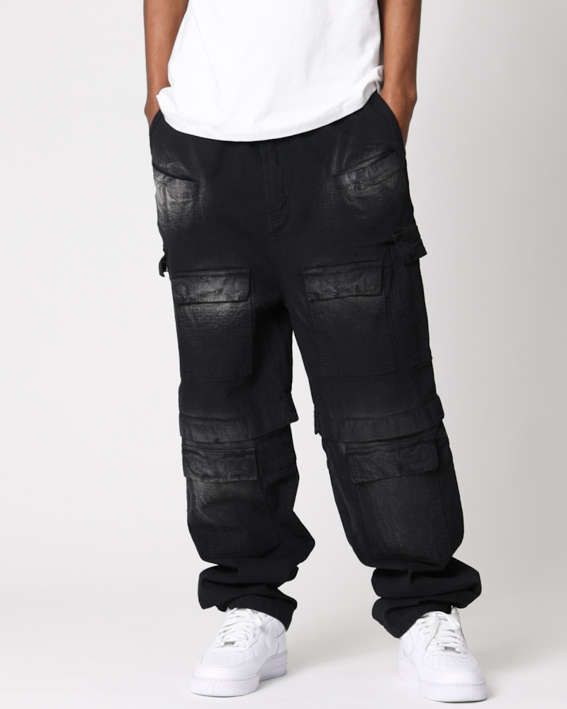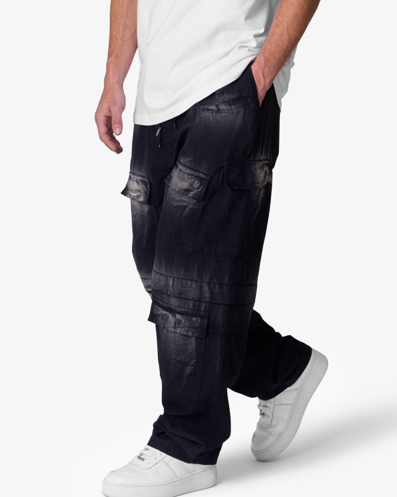 the Oversized Cargo Pants are designed with a new exaggerated oversized fit. constructed from a cotton ripstop fabric with a rinse wash. pp spray at the knees and thighs. tonal drawcord. cargo pockets throughout. and finished with an exaggerated waist that is intentionally large that allows for the waist to cinch for a custom fit.