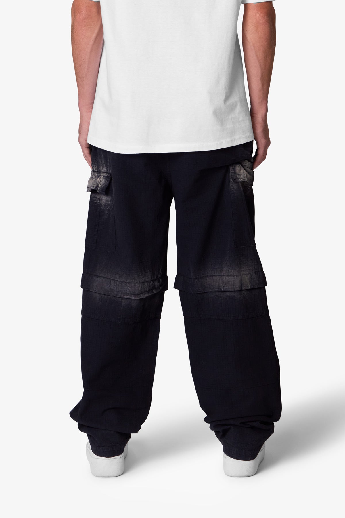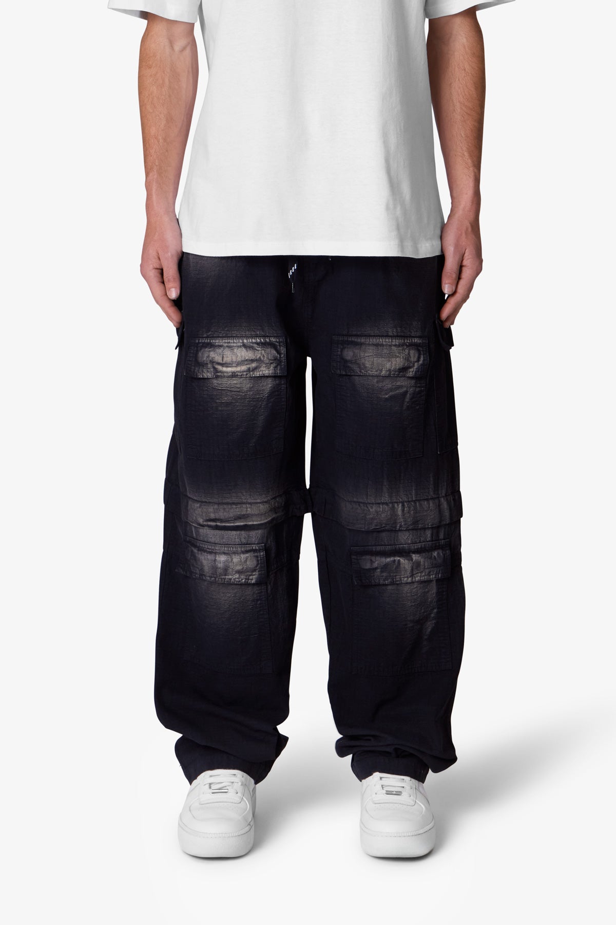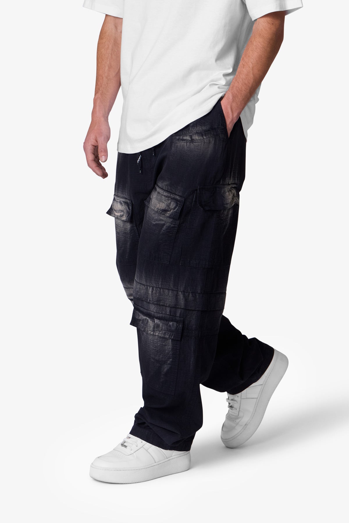 the Oversized Cargo Pants are designed with a new exaggerated oversized fit. constructed from a cotton ripstop fabric with a rinse wash. pp spray at the knees and thighs. tonal drawcord. cargo pockets throughout. and finished with an exaggerated waist that is intentionally large that allows for the waist to cinch for a custom fit.