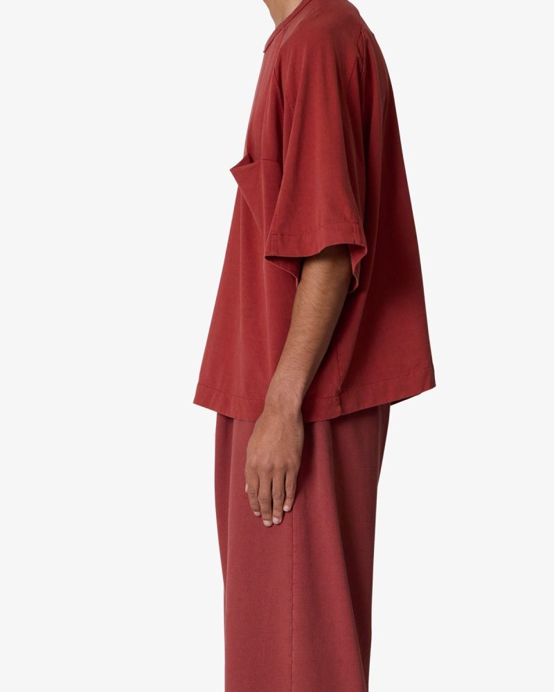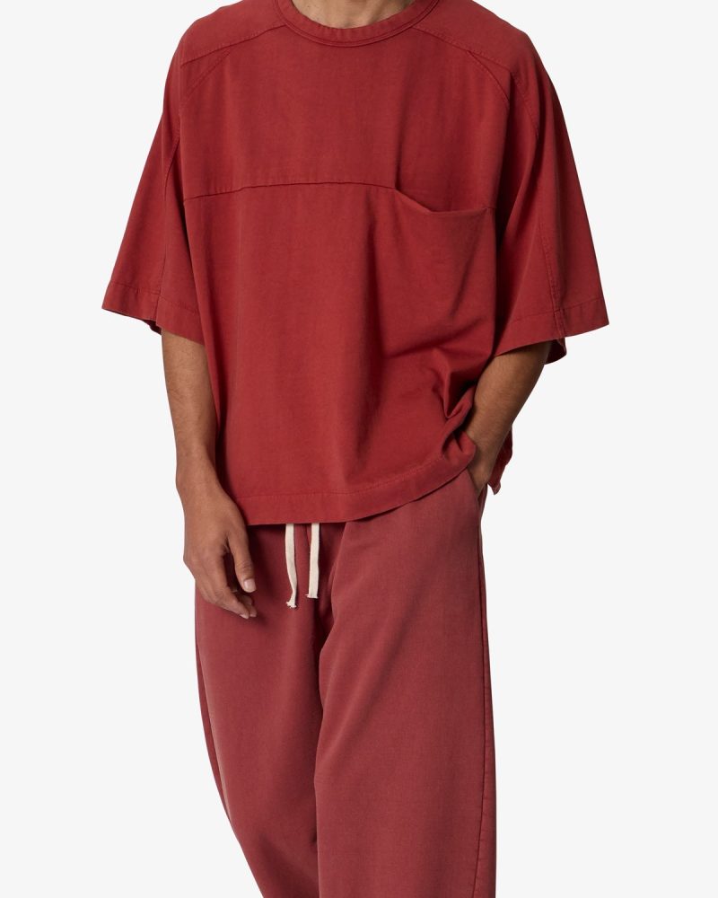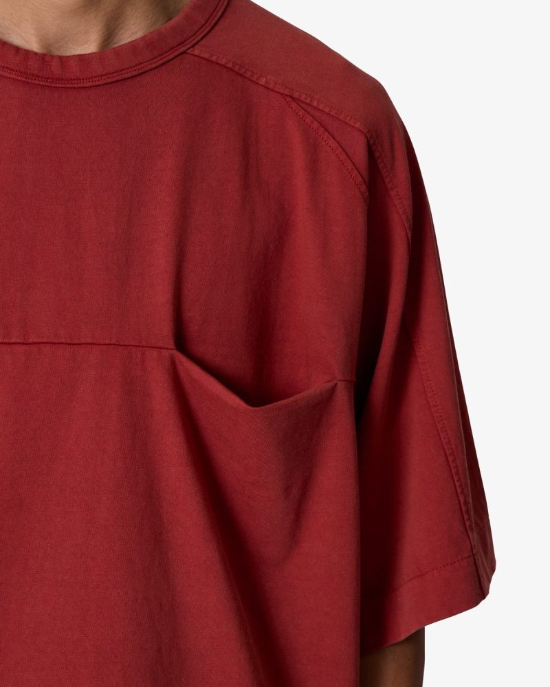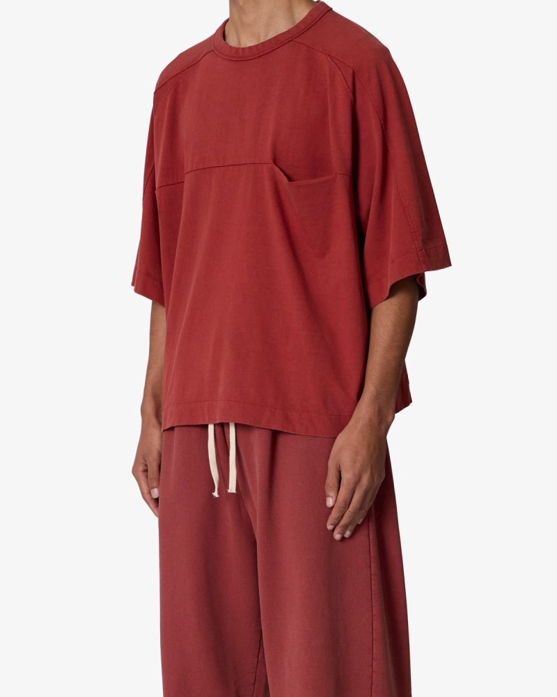 the Paneled Hidden Pocket Tee features a flat hem line and an extended shoulder seam for a relaxed. dropped shoulder fit. constructed from a washed cotton fabric. panel across the chest with an integrated pocket. and finished with an exaggerated oversized fit.