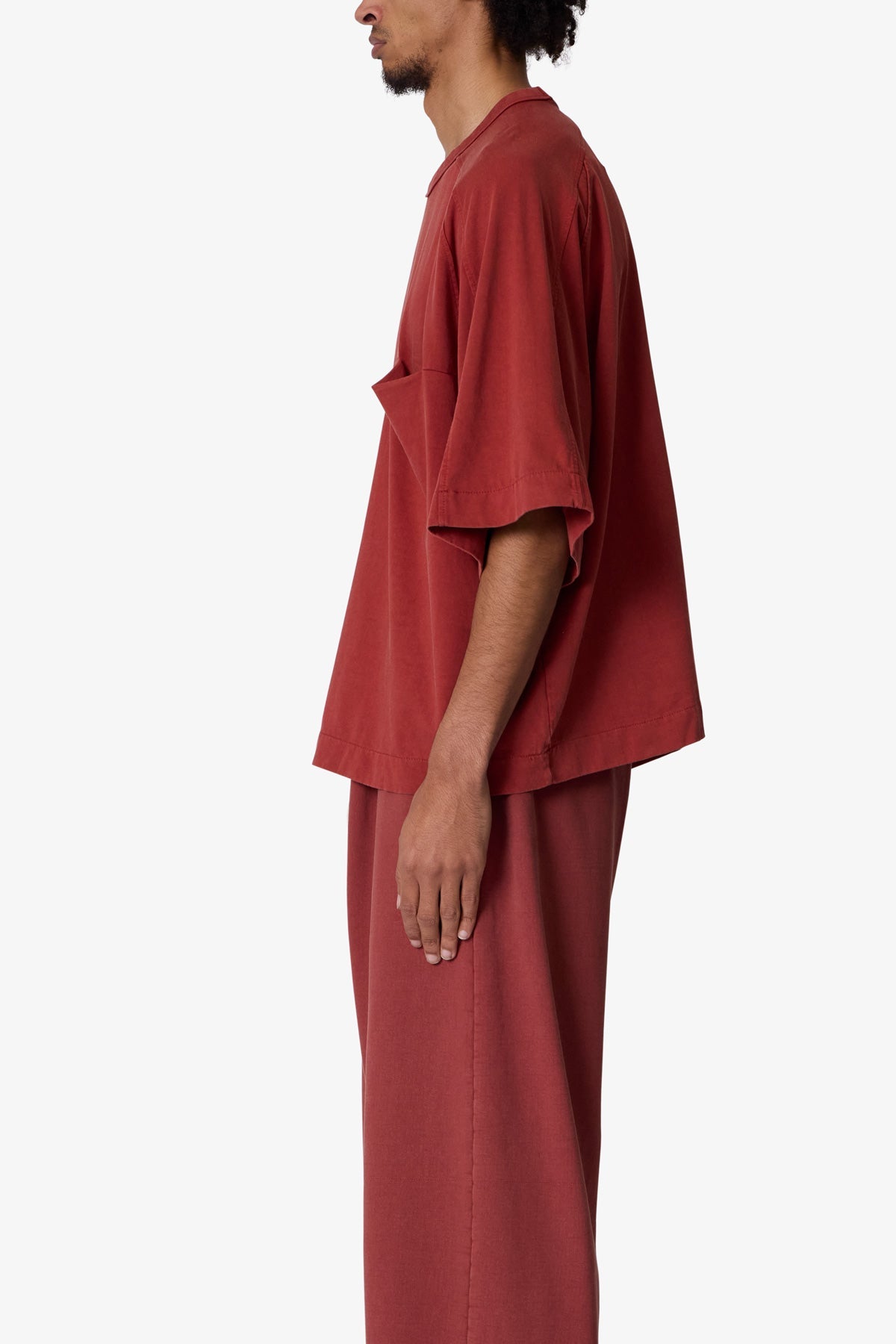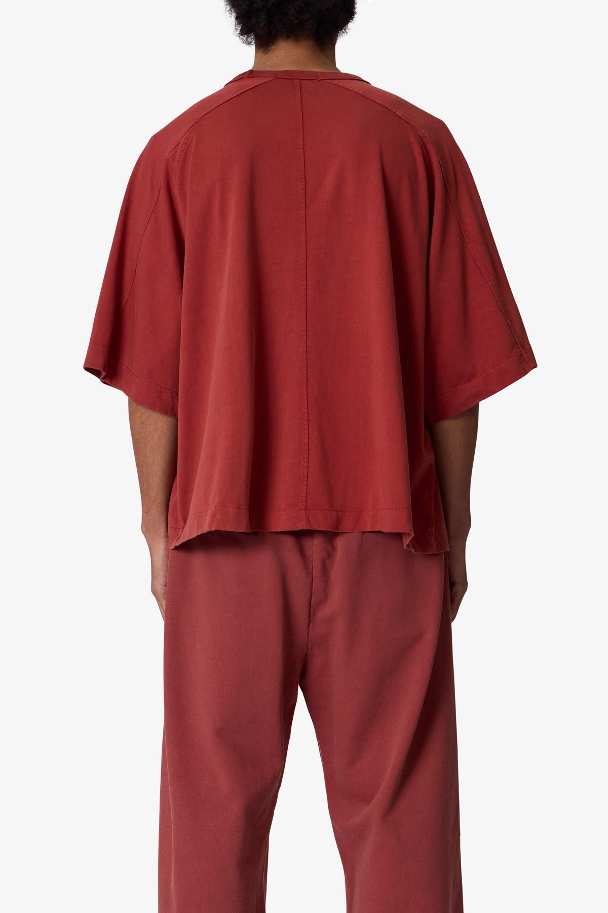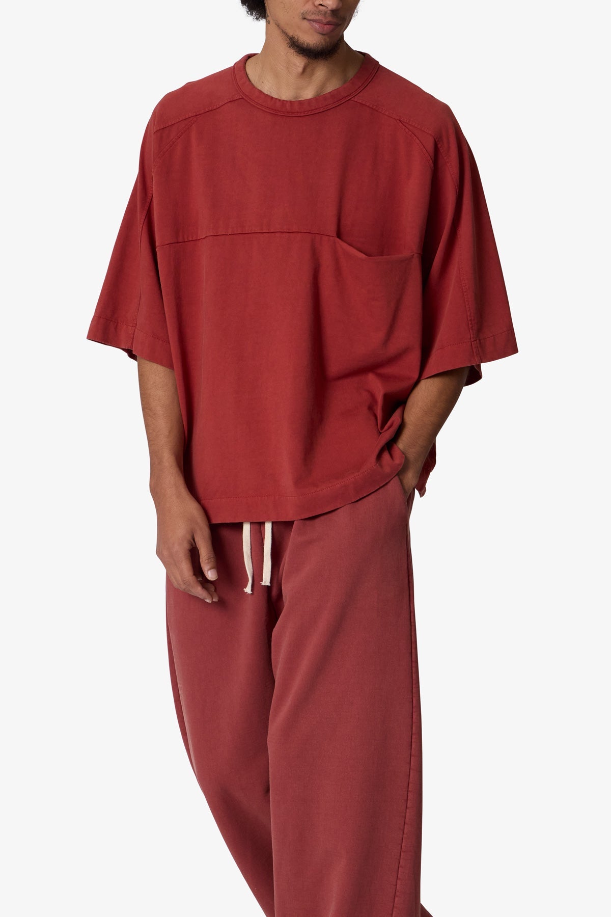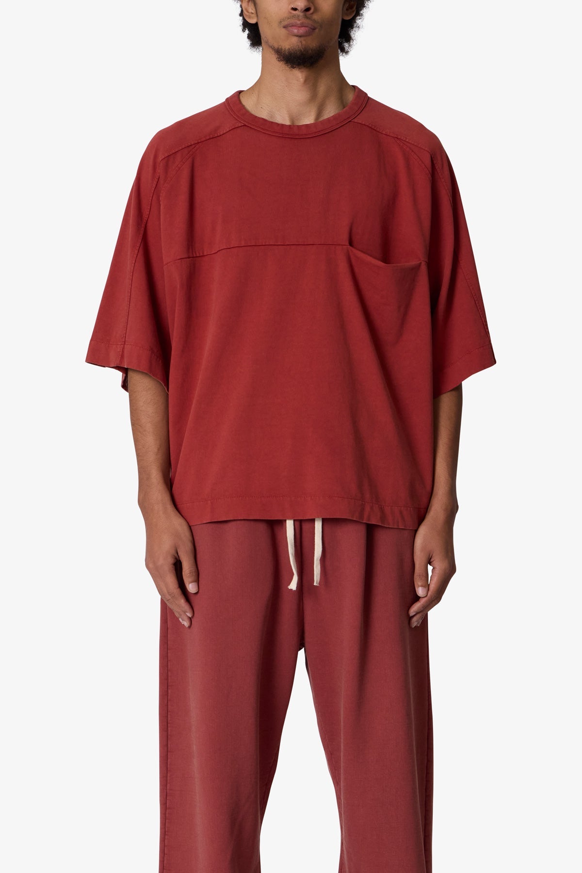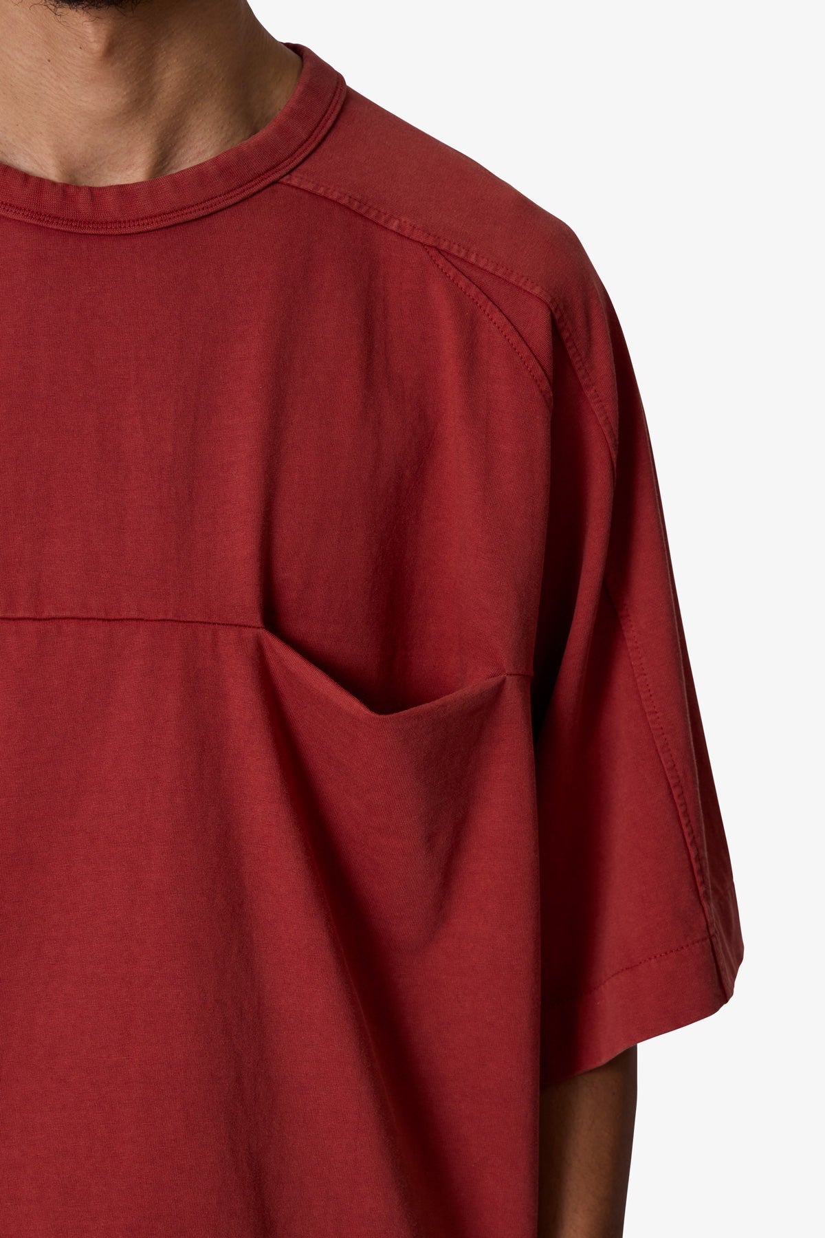 the Paneled Hidden Pocket Tee features a flat hem line and an extended shoulder seam for a relaxed. dropped shoulder fit. constructed from a washed cotton fabric. panel across the chest with an integrated pocket. and finished with an exaggerated oversized fit.