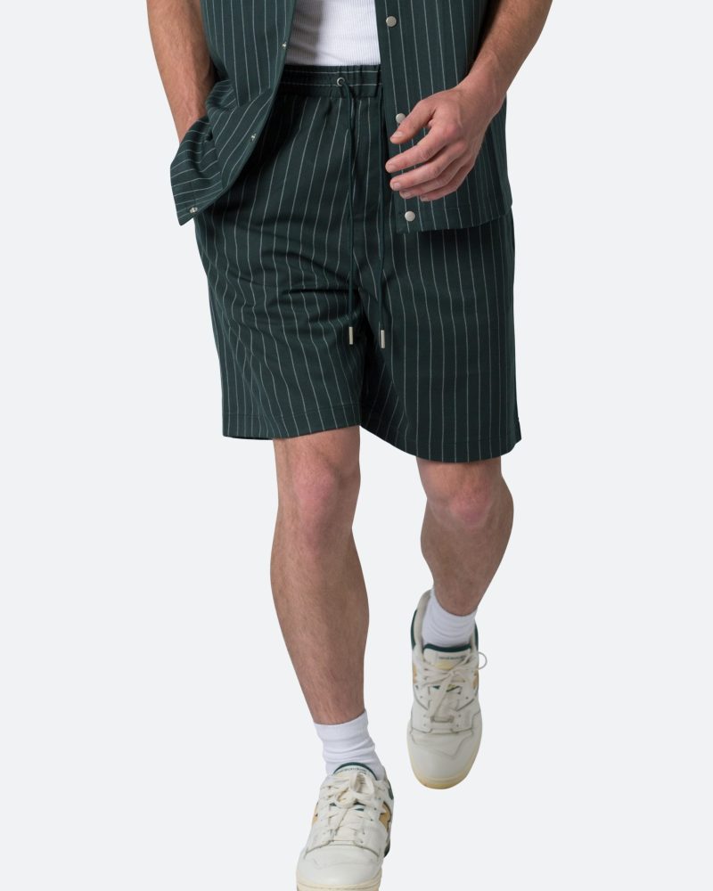 the Pinstripe Shorts are constructed from a custom developed fabric in a relaxed fit. The short feature an elasticized waist. welt pockets at the front. welt pockets in the back. jacquard pin striping. and finished with an elastic drawcord.