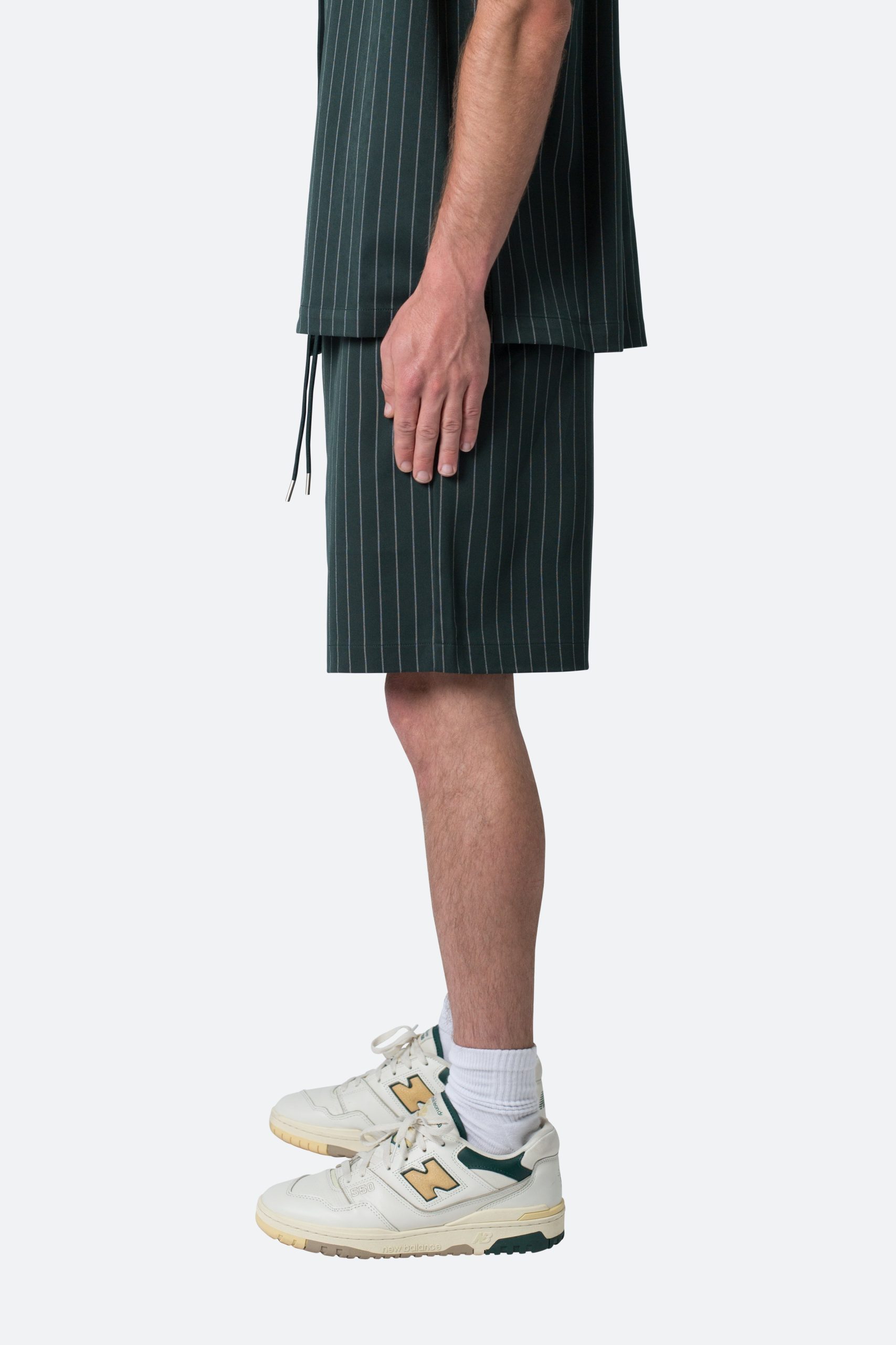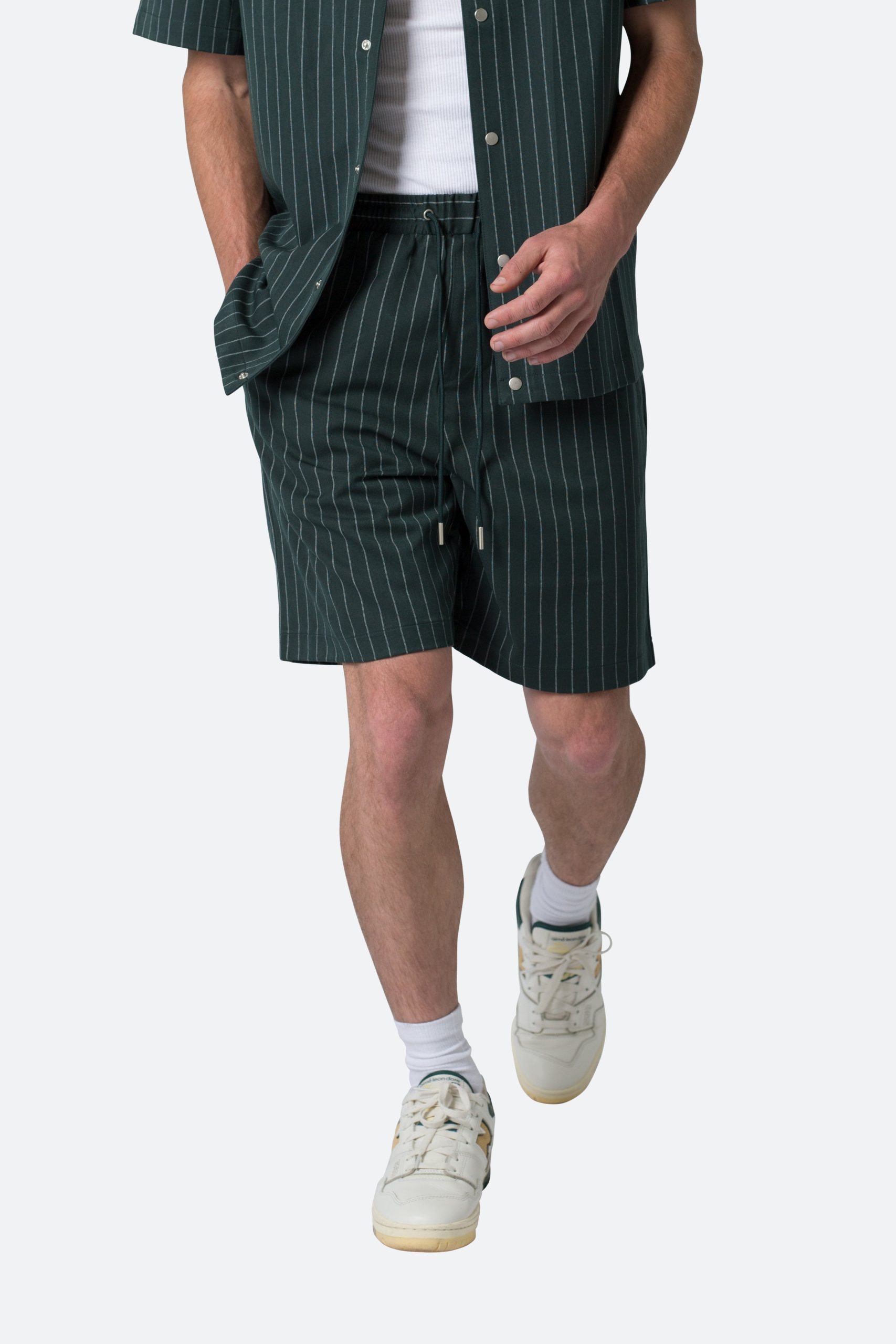 the Pinstripe Shorts are constructed from a custom developed fabric in a relaxed fit. The short feature an elasticized waist. welt pockets at the front. welt pockets in the back. jacquard pin striping. and finished with an elastic drawcord.