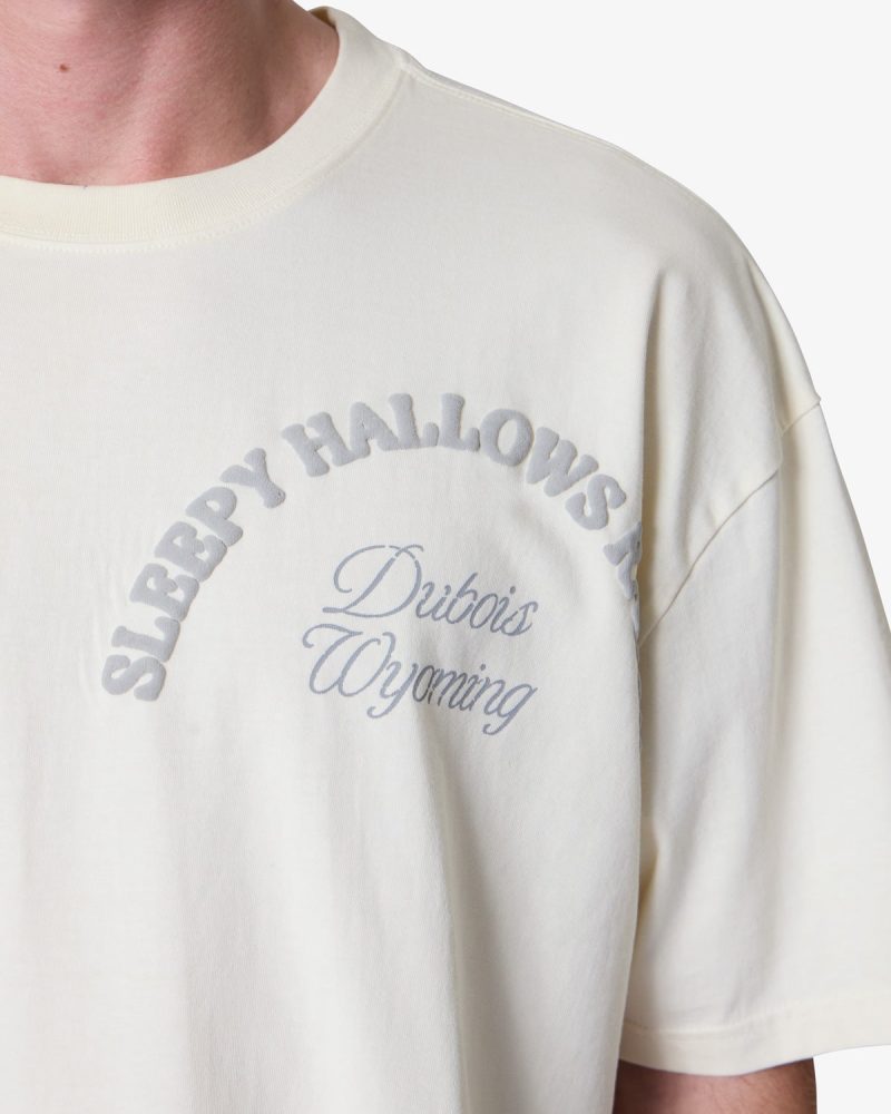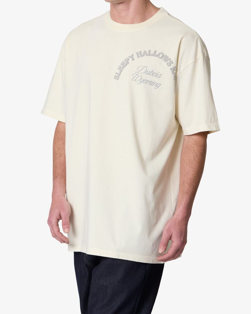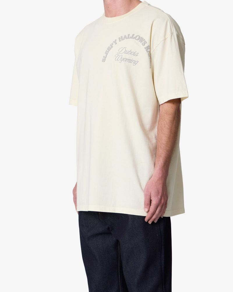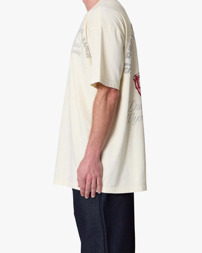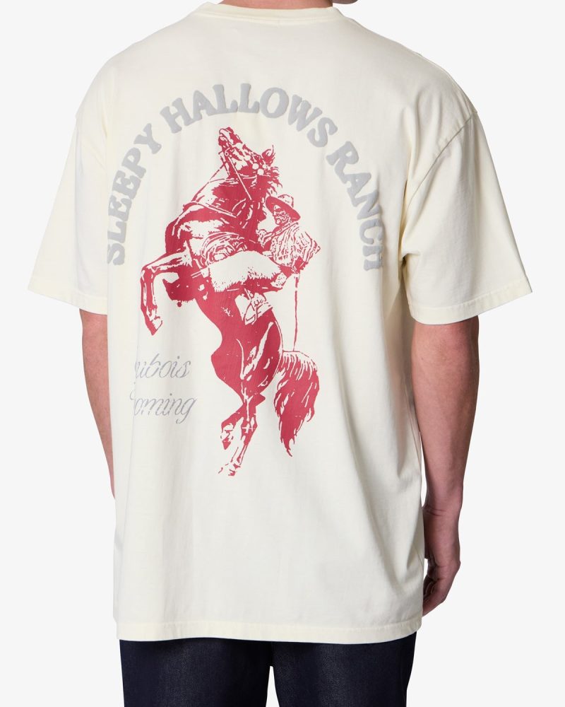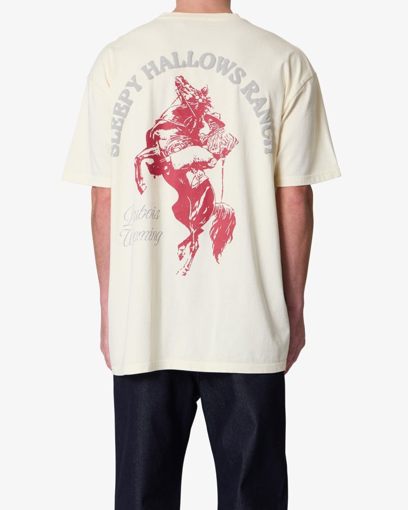 The Rearing Horse Tee features a relaxed and boxy fit. ribbing at the neck. a standard hem. printed graphics on the front and back. and finished with a garment dye for a vintage feel.
