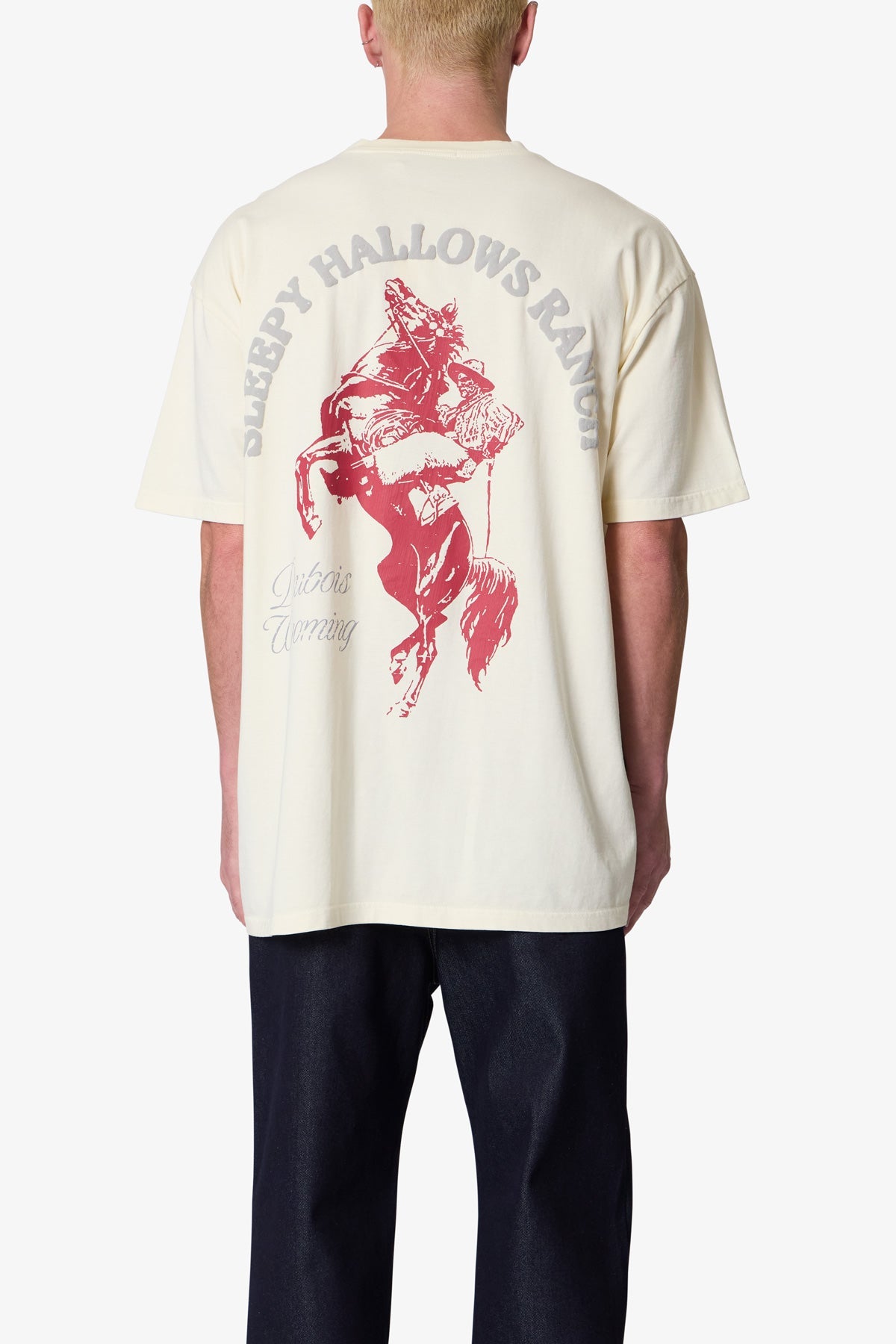 The Rearing Horse Tee features a relaxed and boxy fit. ribbing at the neck. a standard hem. printed graphics on the front and back. and finished with a garment dye for a vintage feel.