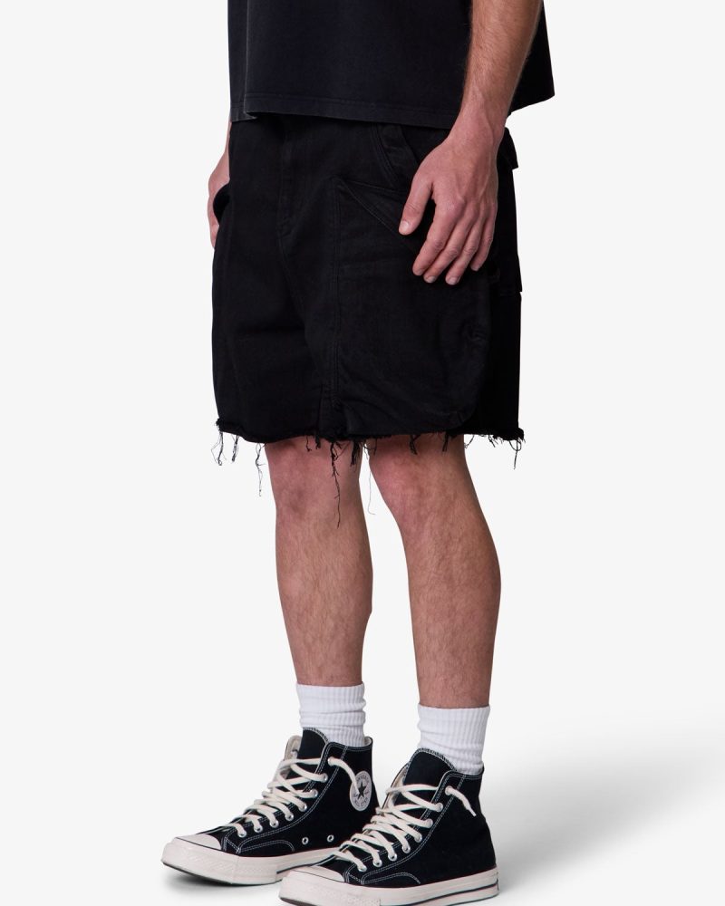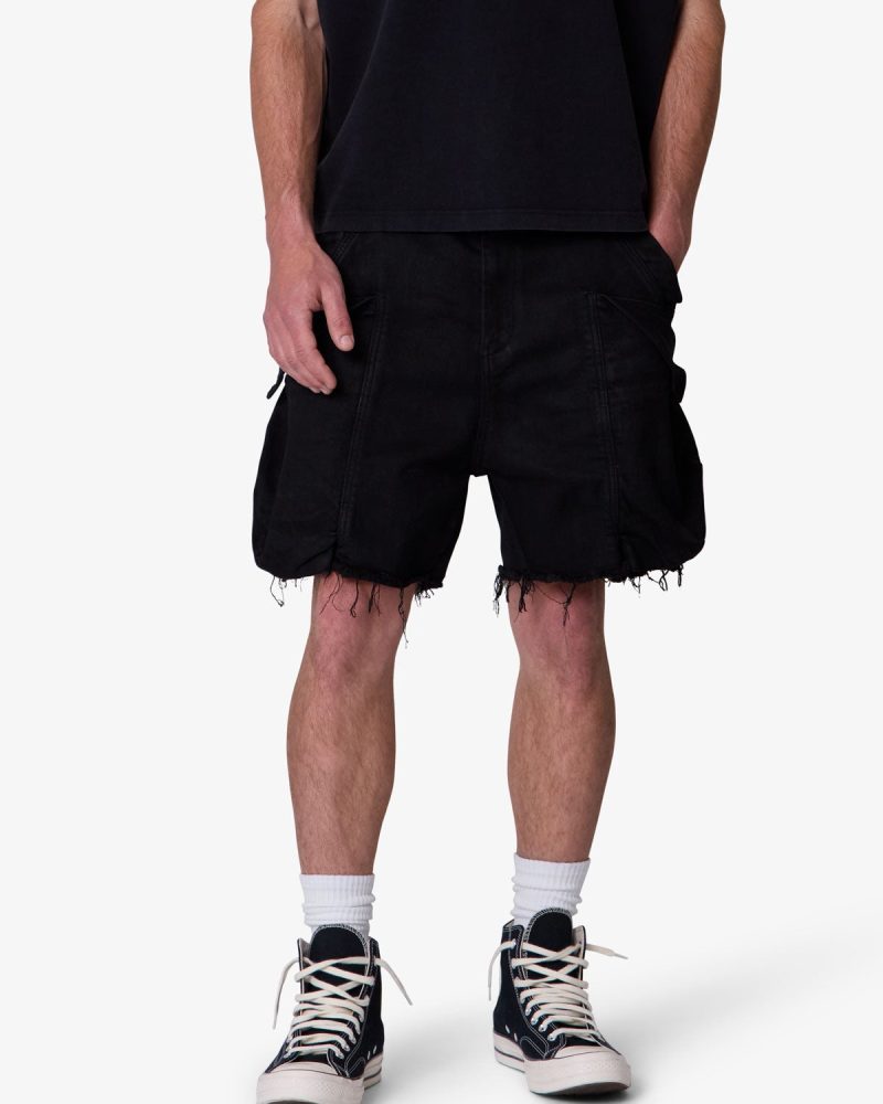 the Roughed Pocket Cargo Shorts are designed with a relaxed fit throughout. cargo pockets at the side seam. a button fly. and is finished with raw hem at the leg opening.