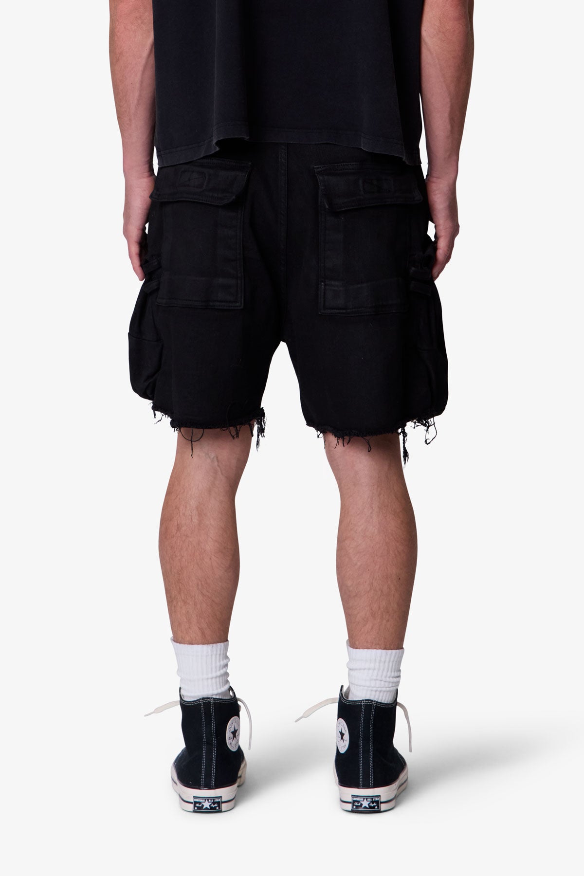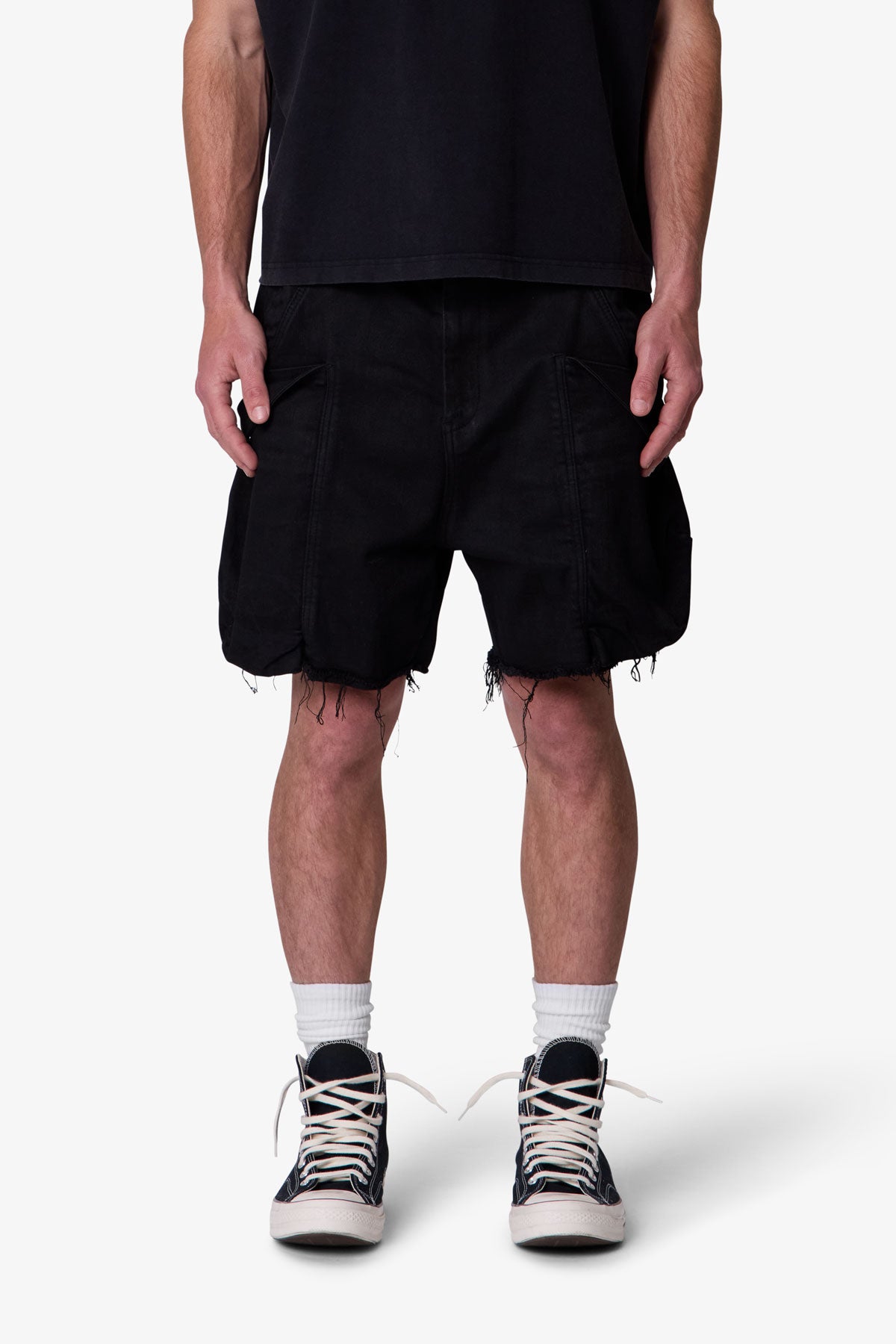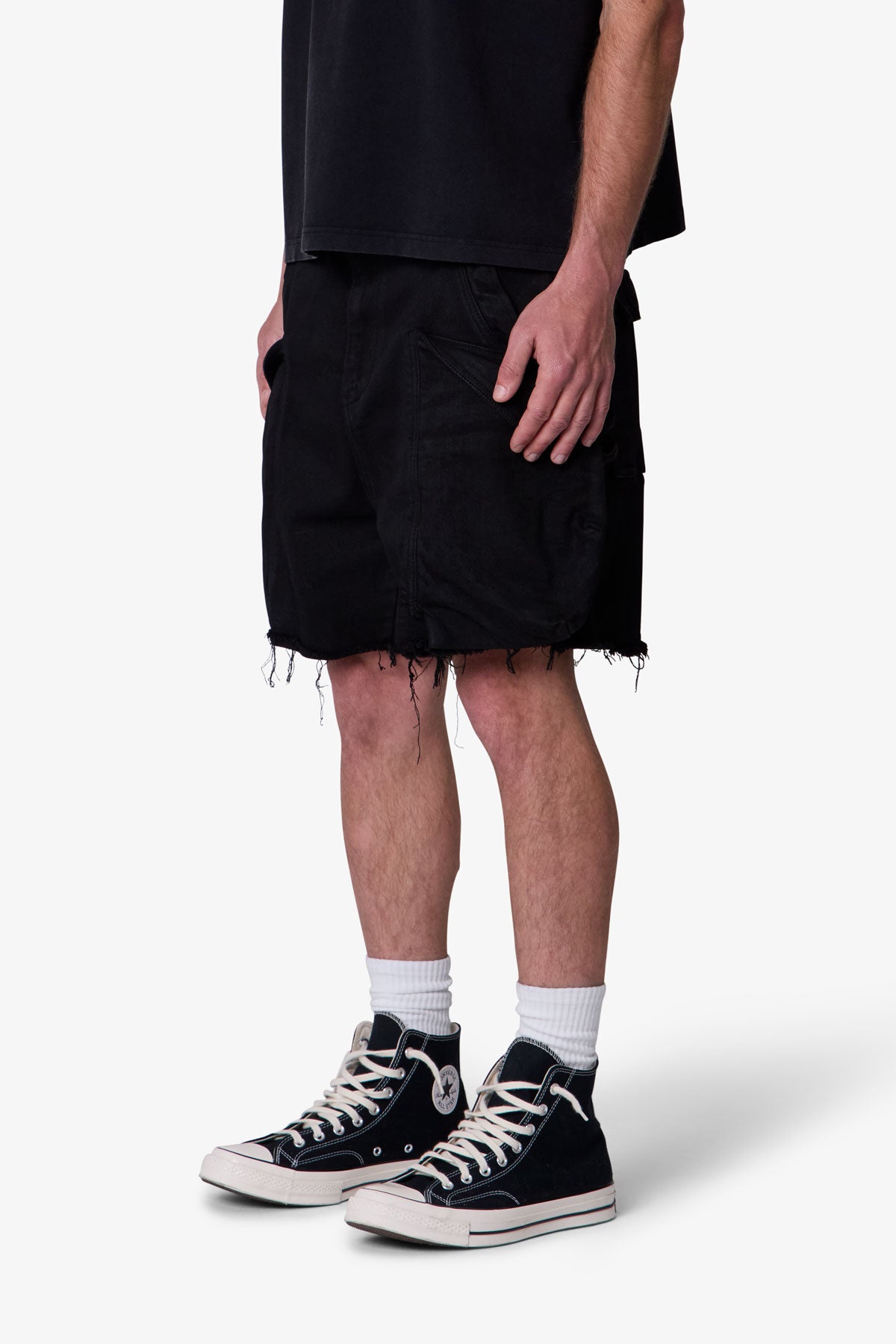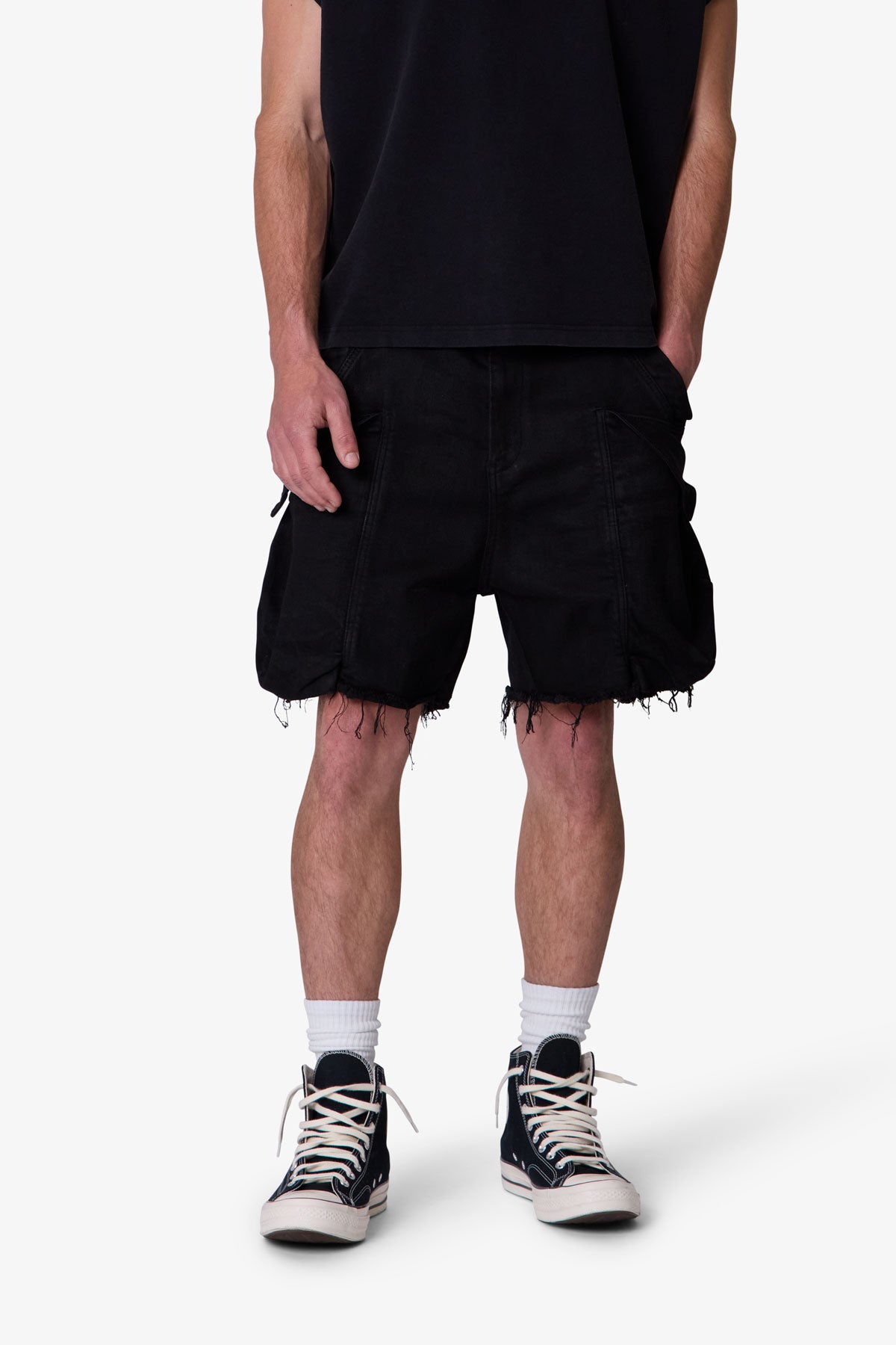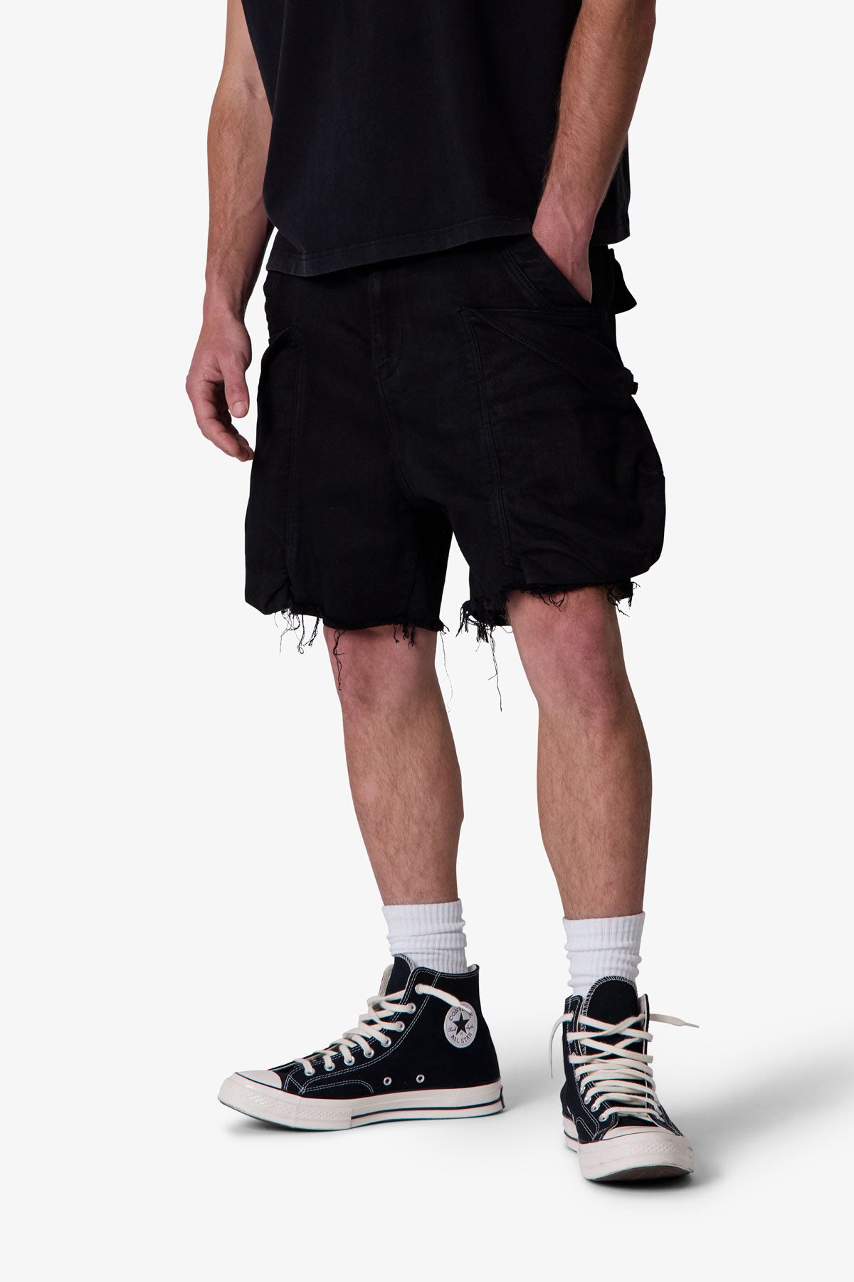 the Roughed Pocket Cargo Shorts are designed with a relaxed fit throughout. cargo pockets at the side seam. a button fly. and is finished with raw hem at the leg opening.