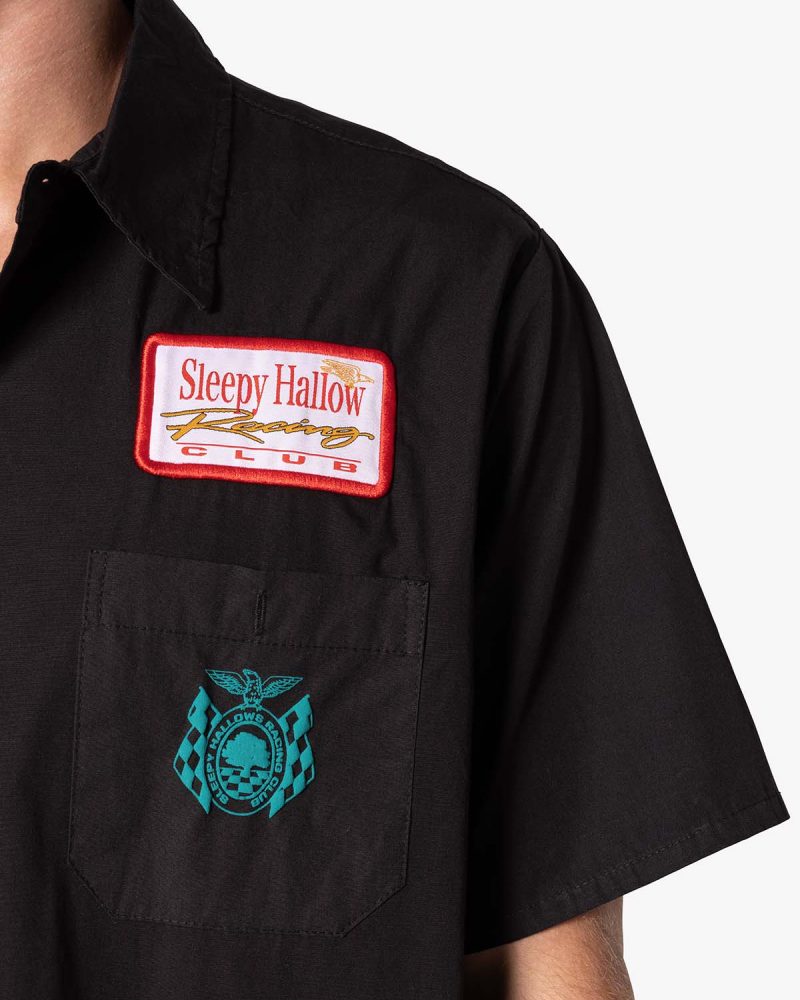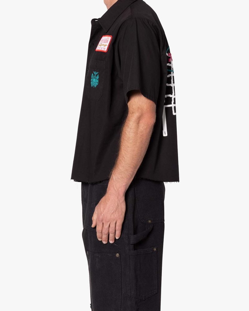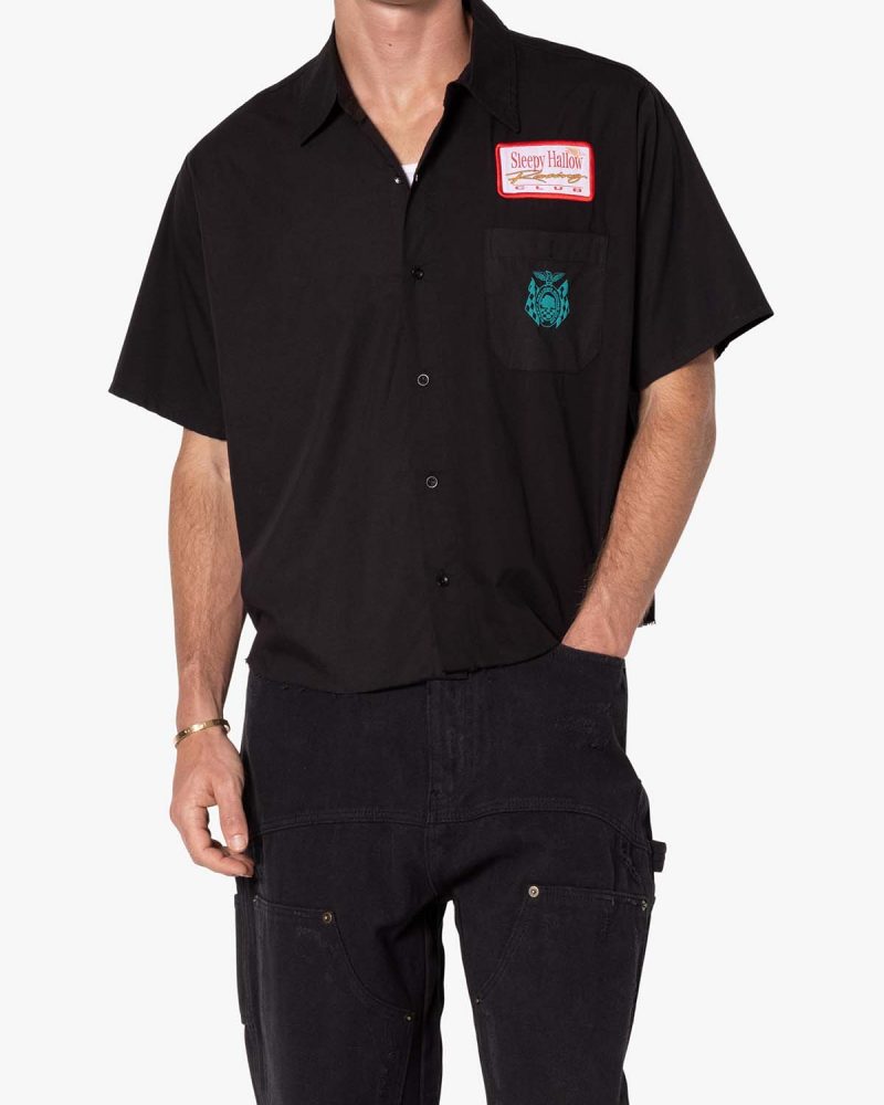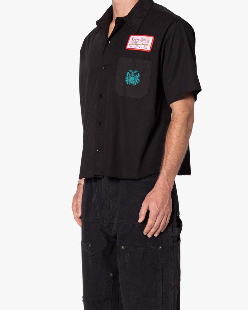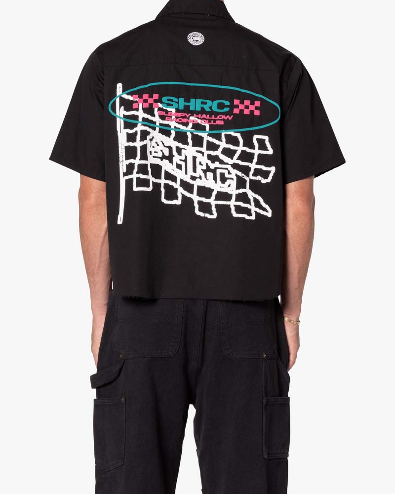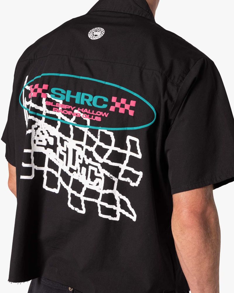 the SHRC Checkered Flag Cropped Shirt is made from a lightweight cotton fabric. The relaxed-fit shirt features a button placket. screen prints. embroidery. and patch details throughout. and is finished with a pocket on the chest.