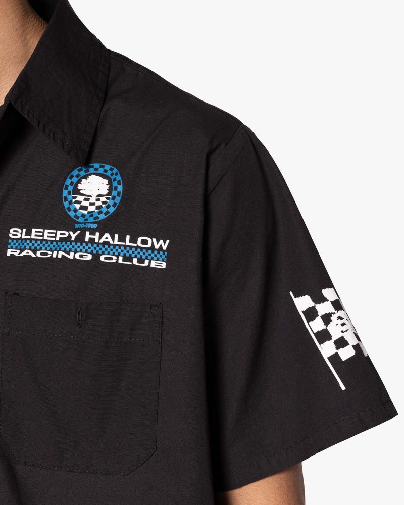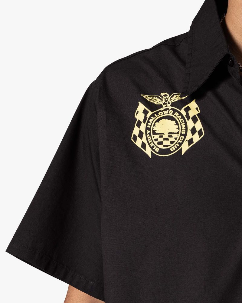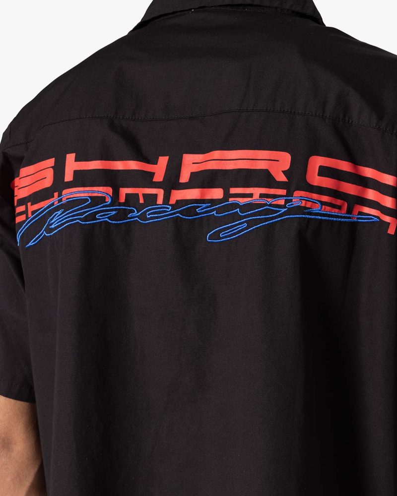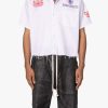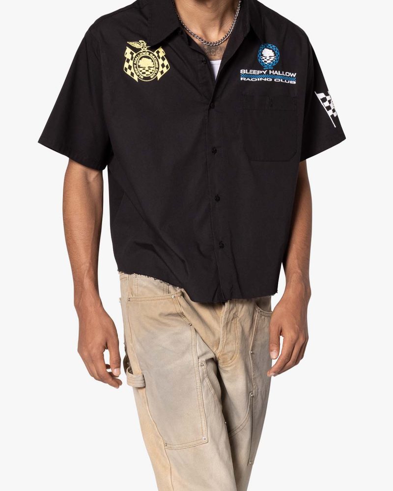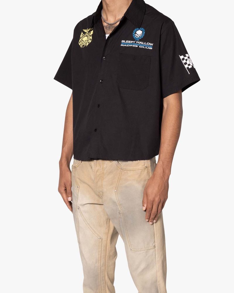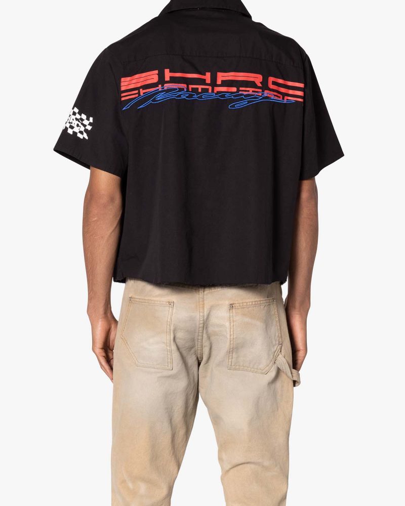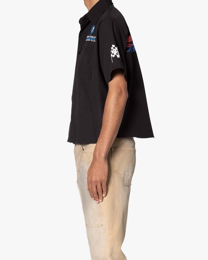 the SHRC Pit Crew Cropped Shirt is made from a lightweight cotton fabric. The relaxed-fit shirt features a button placket. screen prints. embroidery. and patch details throughout. and is finished with a pocket on the chest.