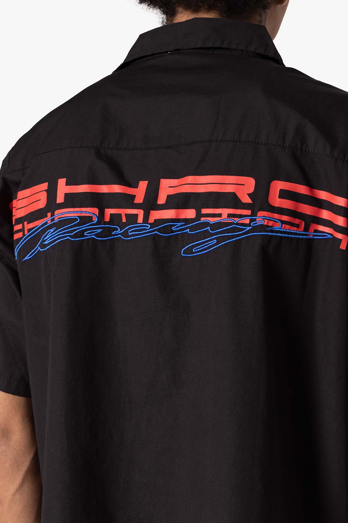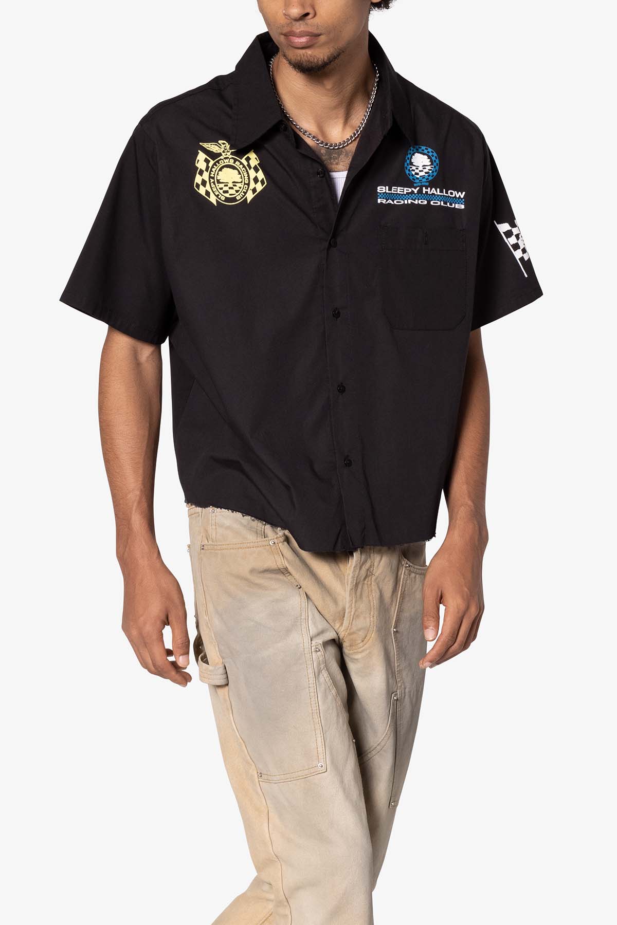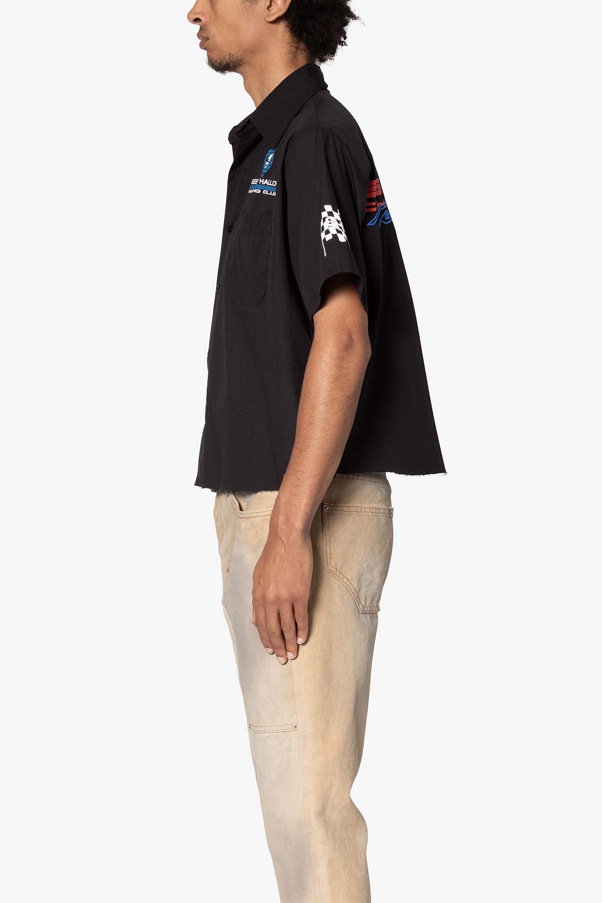 the SHRC Pit Crew Cropped Shirt is made from a lightweight cotton fabric. The relaxed-fit shirt features a button placket. screen prints. embroidery. and patch details throughout. and is finished with a pocket on the chest.