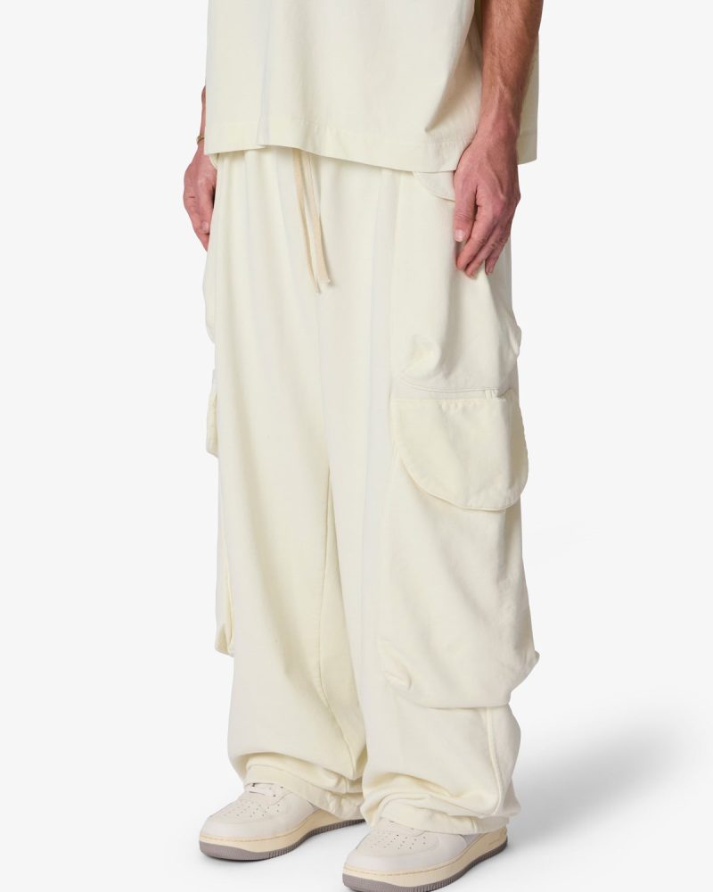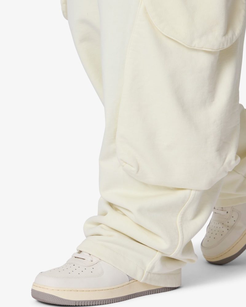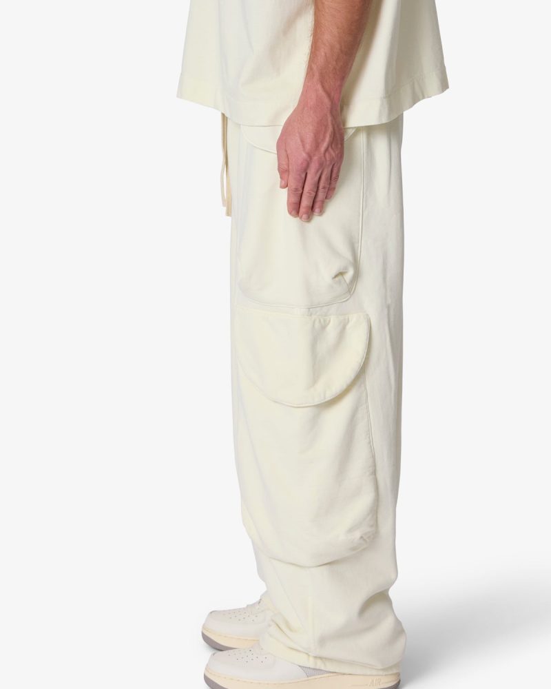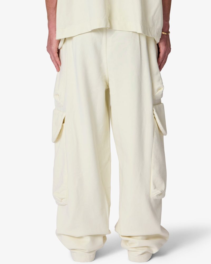 the Side Cargo Pocket Sweatpants are designed with a relaxed fit throughout with exaggerated cargo pockets at the outseam. welt pockets at the hip. contrasting cotton drawcord. and finishing off with a garment wash.
