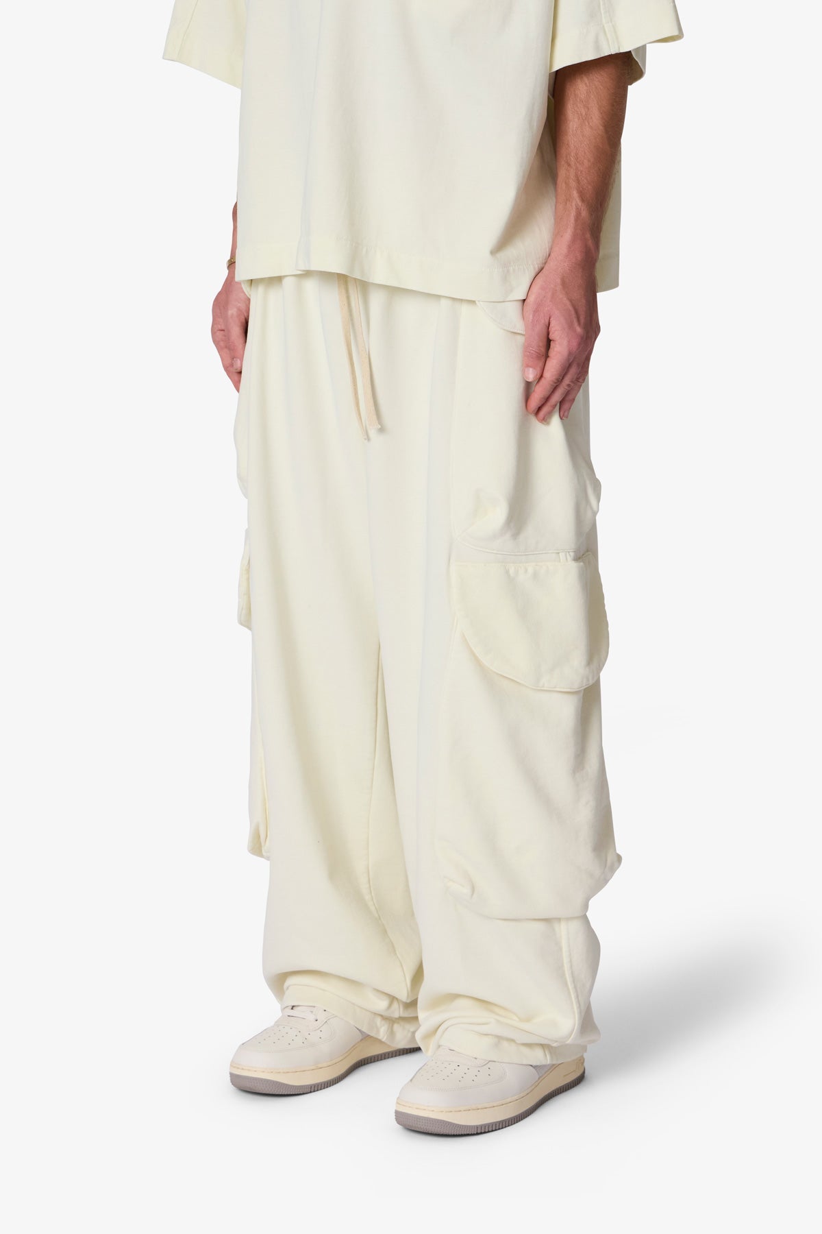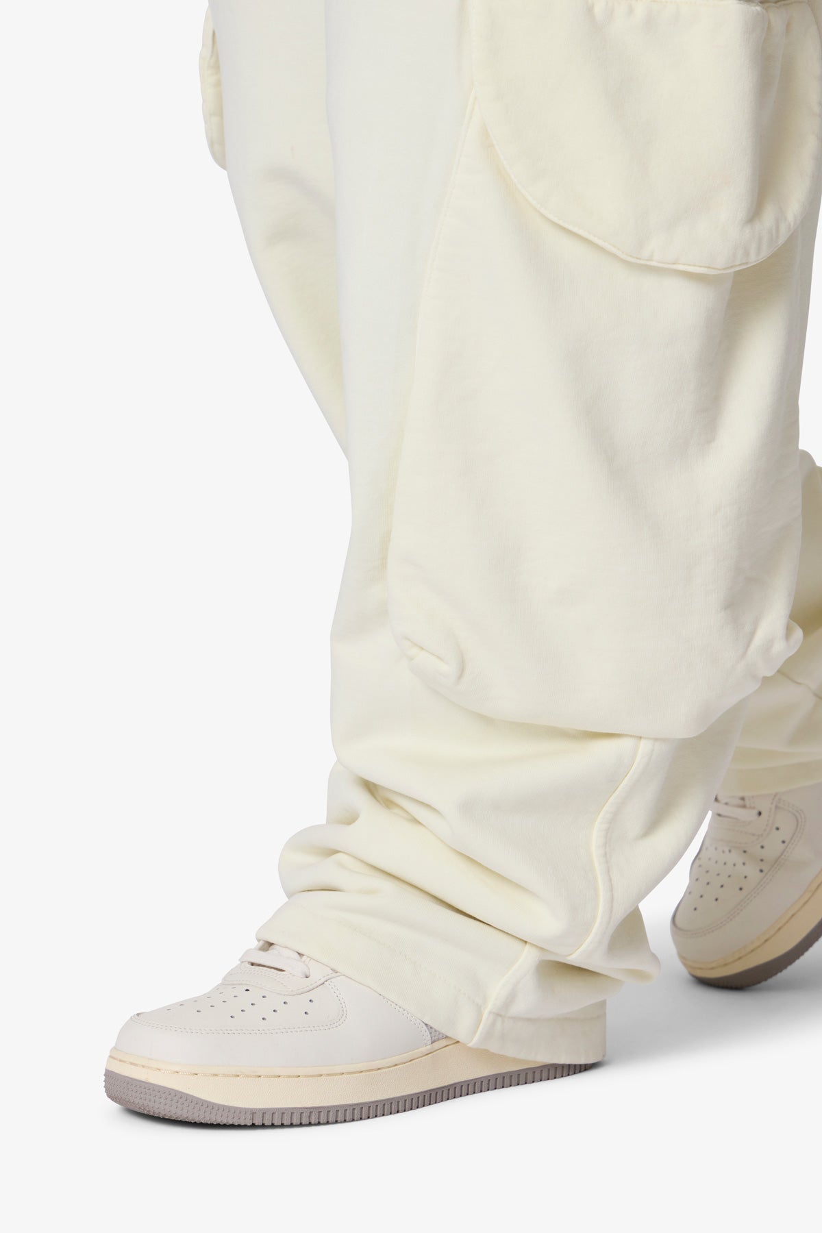 the Side Cargo Pocket Sweatpants are designed with a relaxed fit throughout with exaggerated cargo pockets at the outseam. welt pockets at the hip. contrasting cotton drawcord. and finishing off with a garment wash.