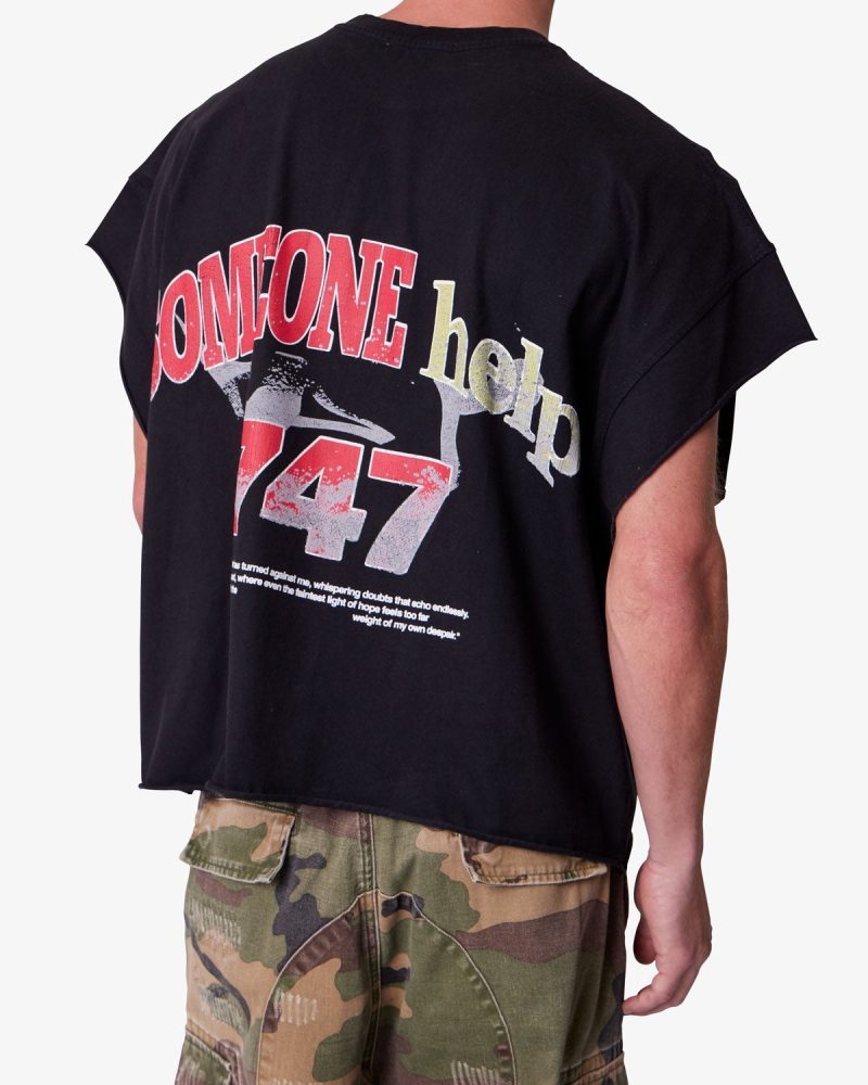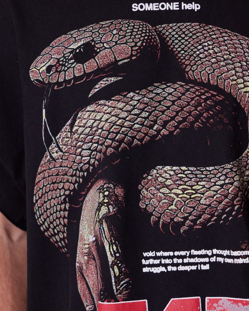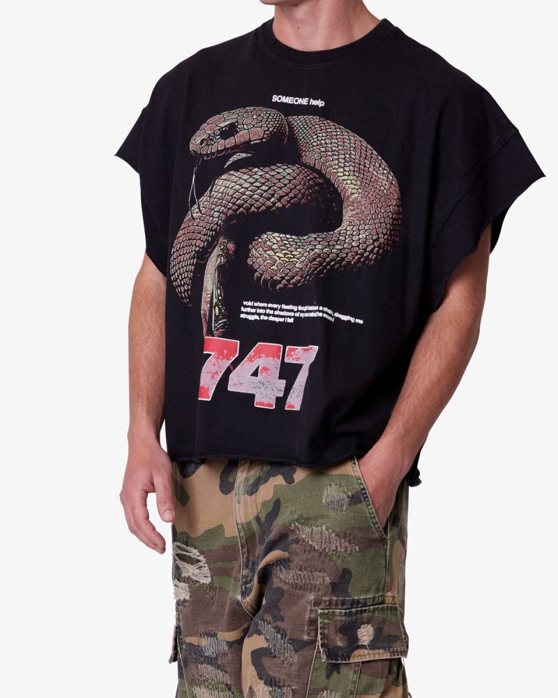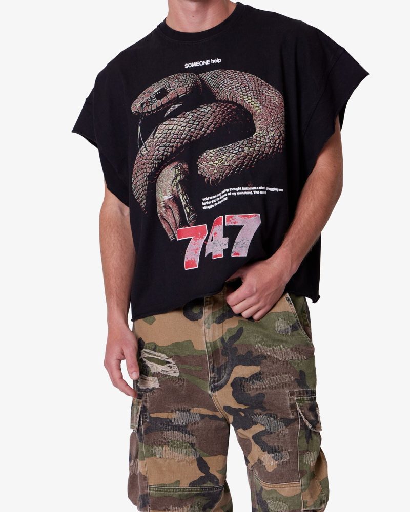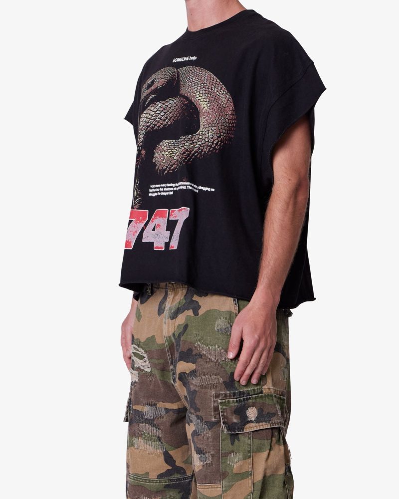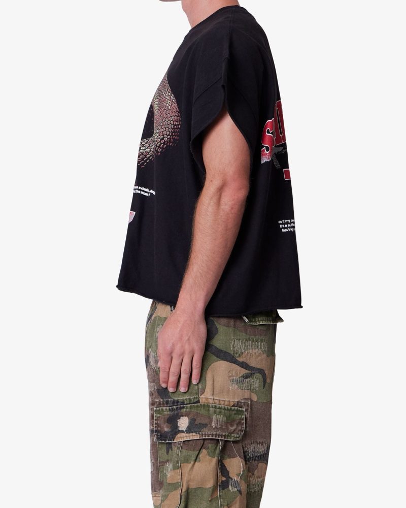 Constructed from 100% cotton with a vintage wash. this sleeveless tee features a cropped. boxy fit with raw cut arm holes and hem. Designed with snake screen print graphics on the front and back. the artwork features a cracked effect for a worn-in look. Finished with a ribbed neckline for structure.