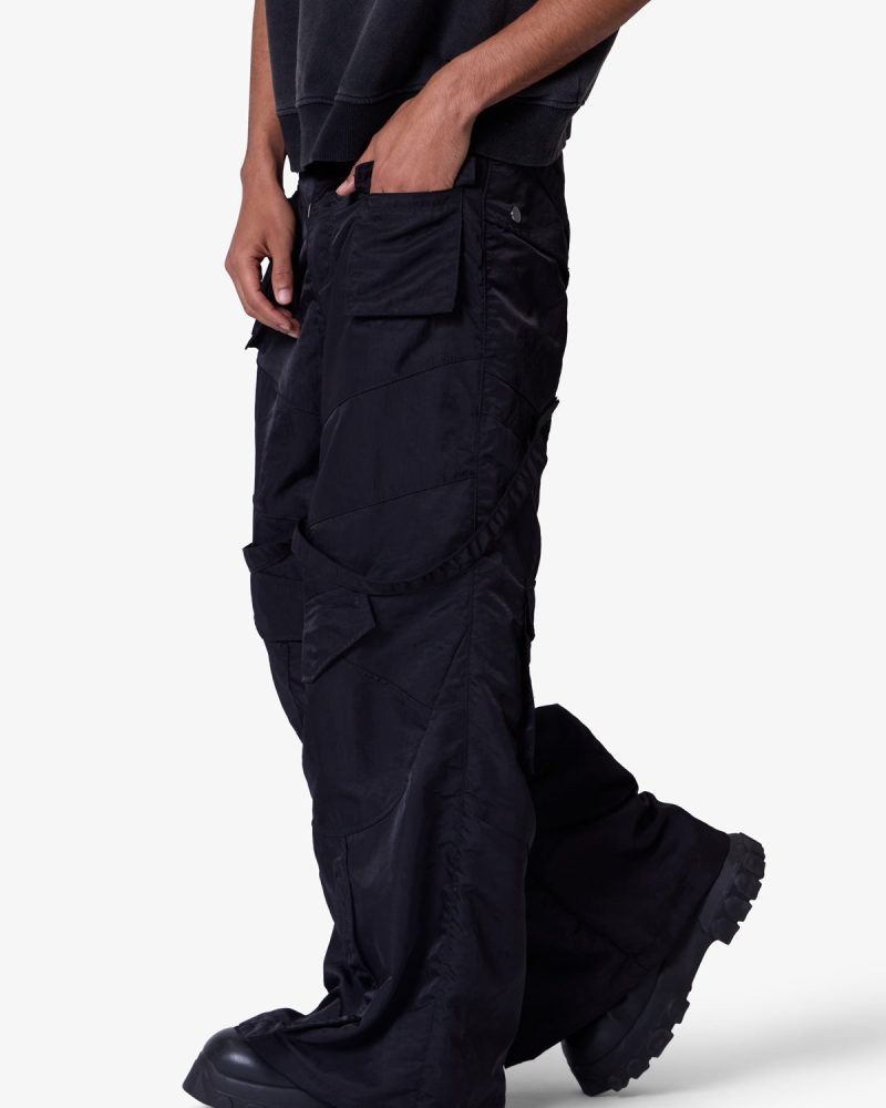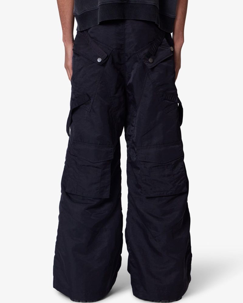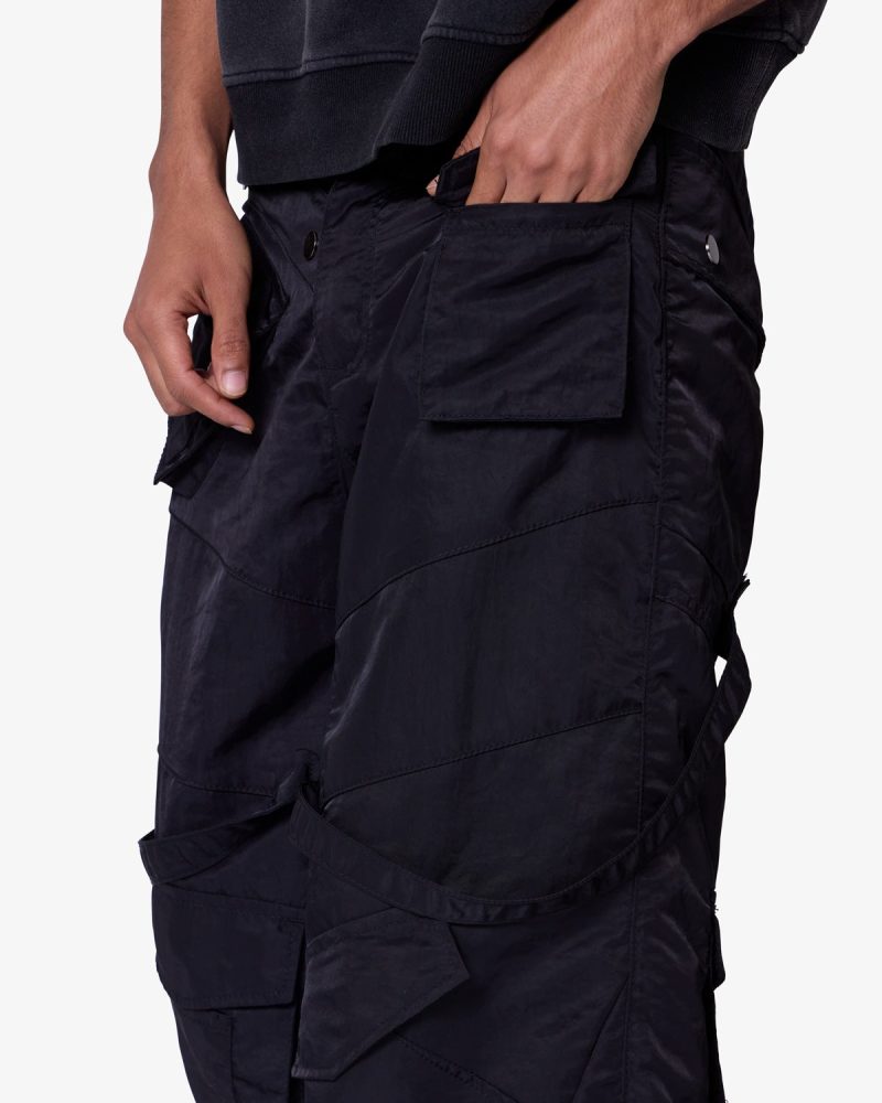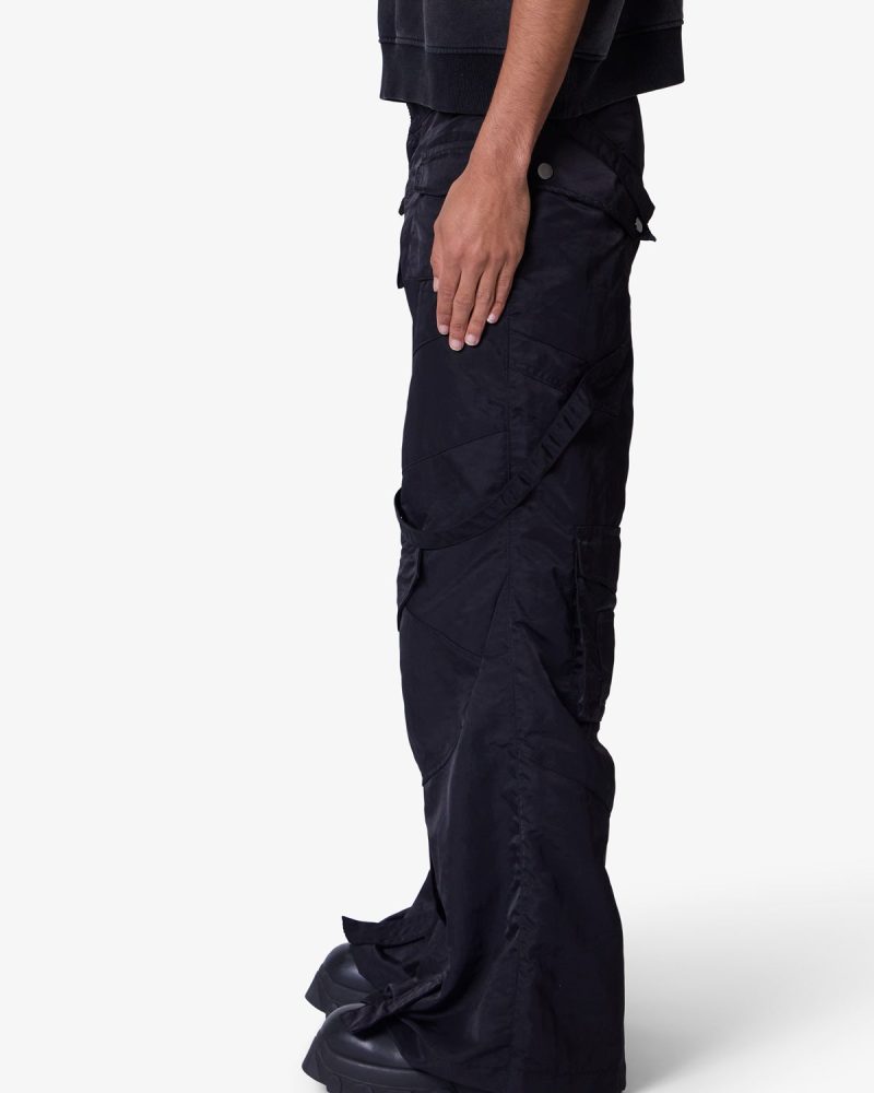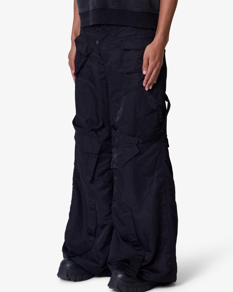 the Strapped Up Raver Double Cargo Pants are designed with a new oversized rave fit. constructed from a polyester fabric with a rinse wash. contrast drawcord. strapping details throughout. and finished with cargo pockets throughout.