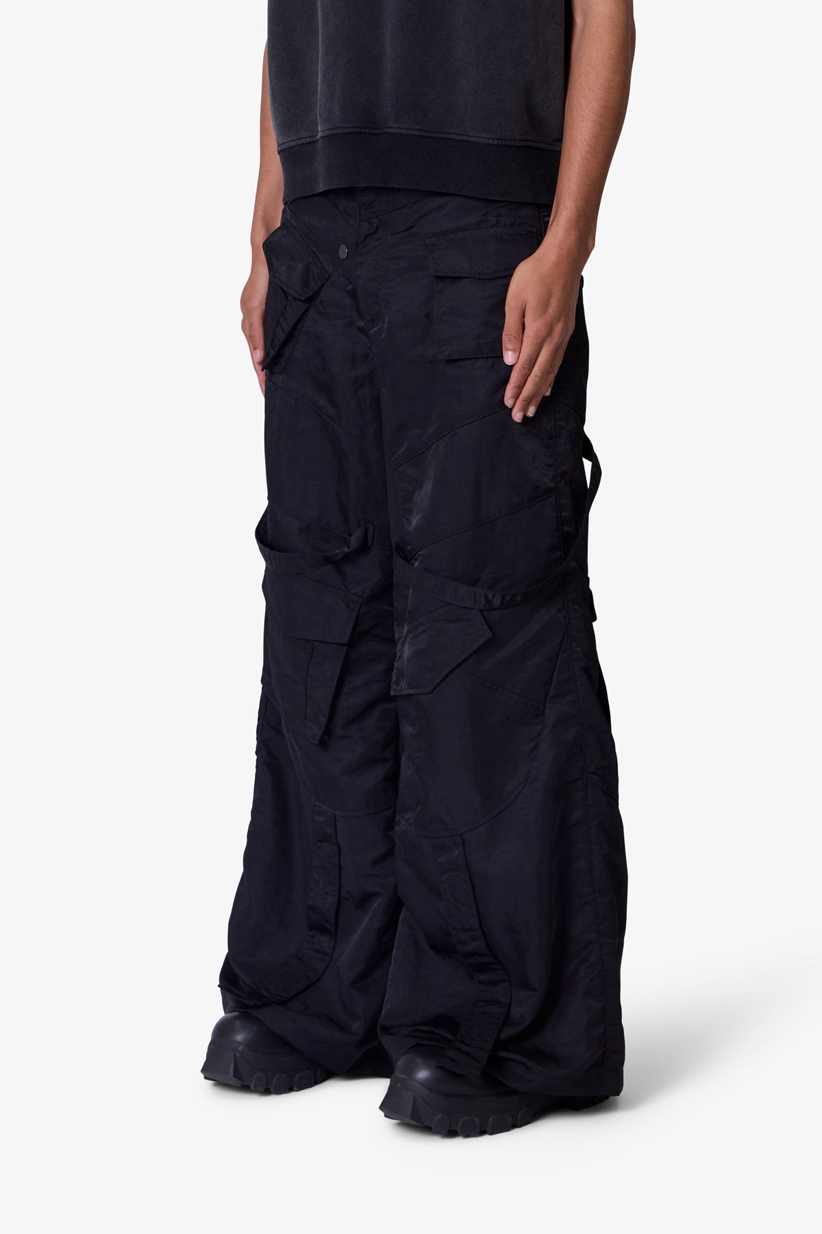 the Strapped Up Raver Double Cargo Pants are designed with a new oversized rave fit. constructed from a polyester fabric with a rinse wash. contrast drawcord. strapping details throughout. and finished with cargo pockets throughout.