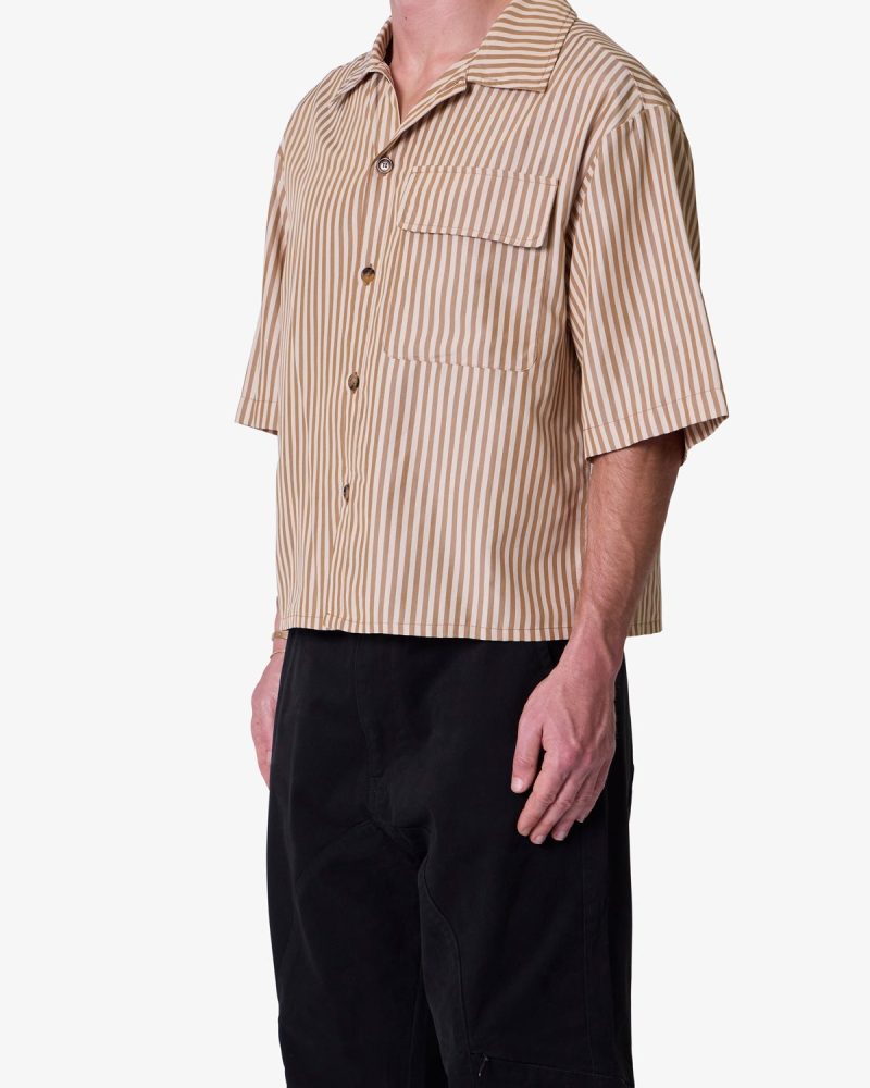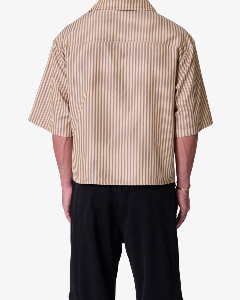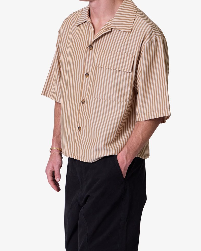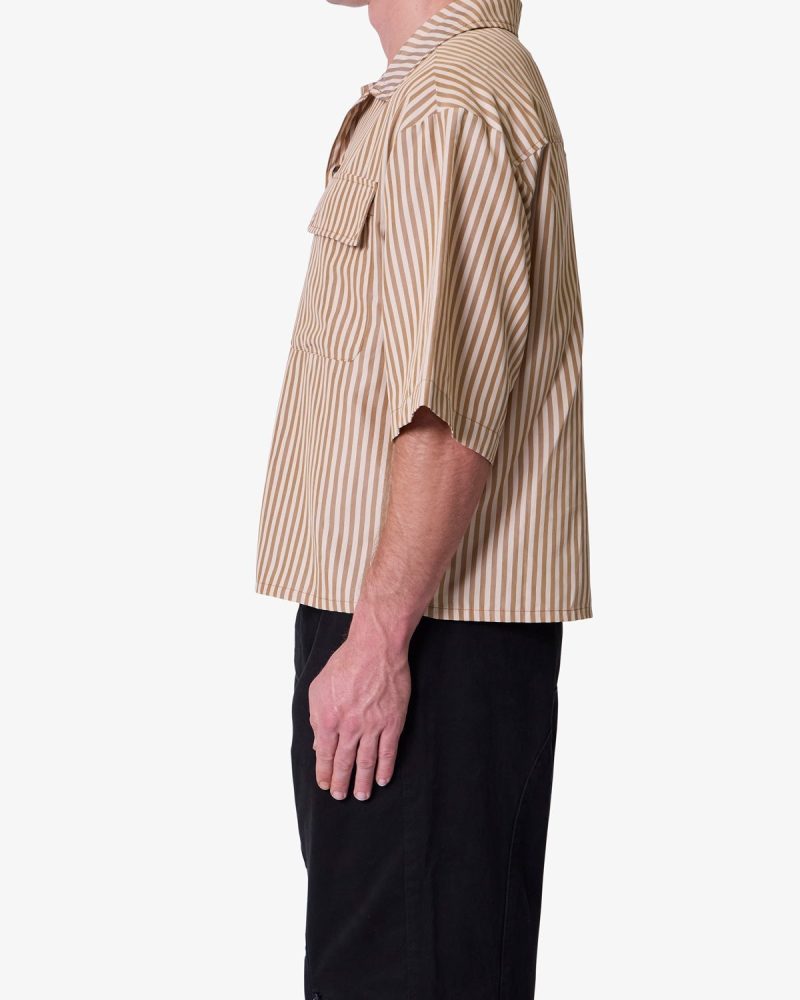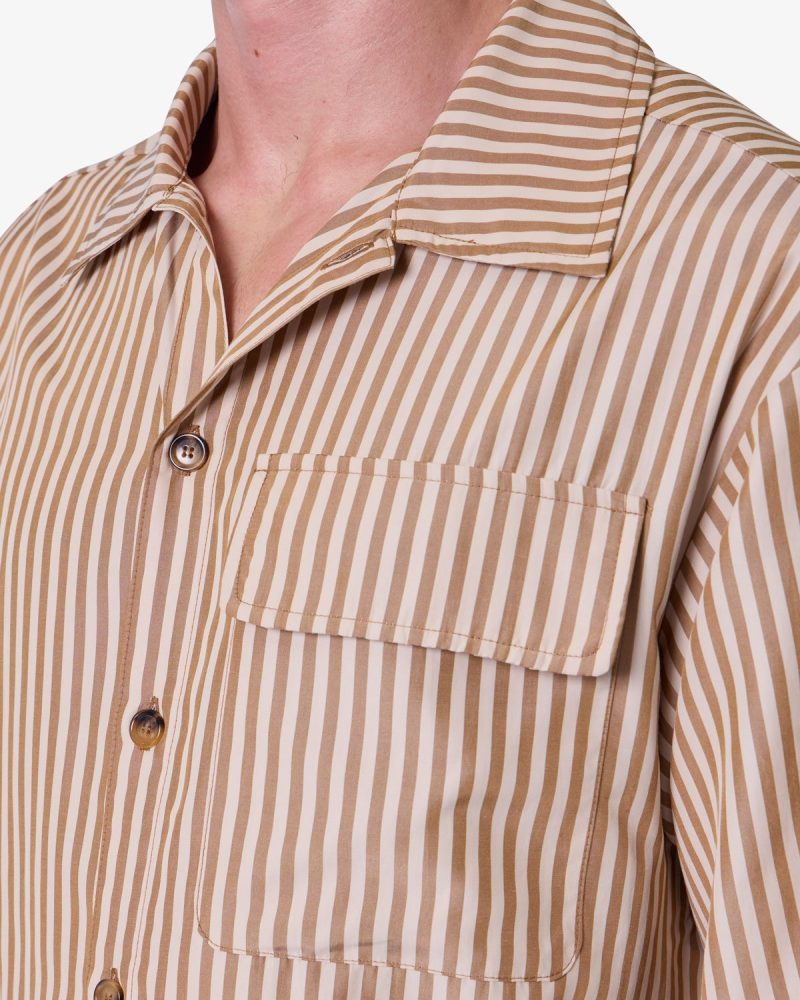 the Striped One Pocket Pajama Shirt is made from cotton/poly blend fabric with contrasting pinstripe pattern throughout. The relaxed-fit shirt features tortoise buttons. chest pocket. flat hem. and finished with a cropped length.