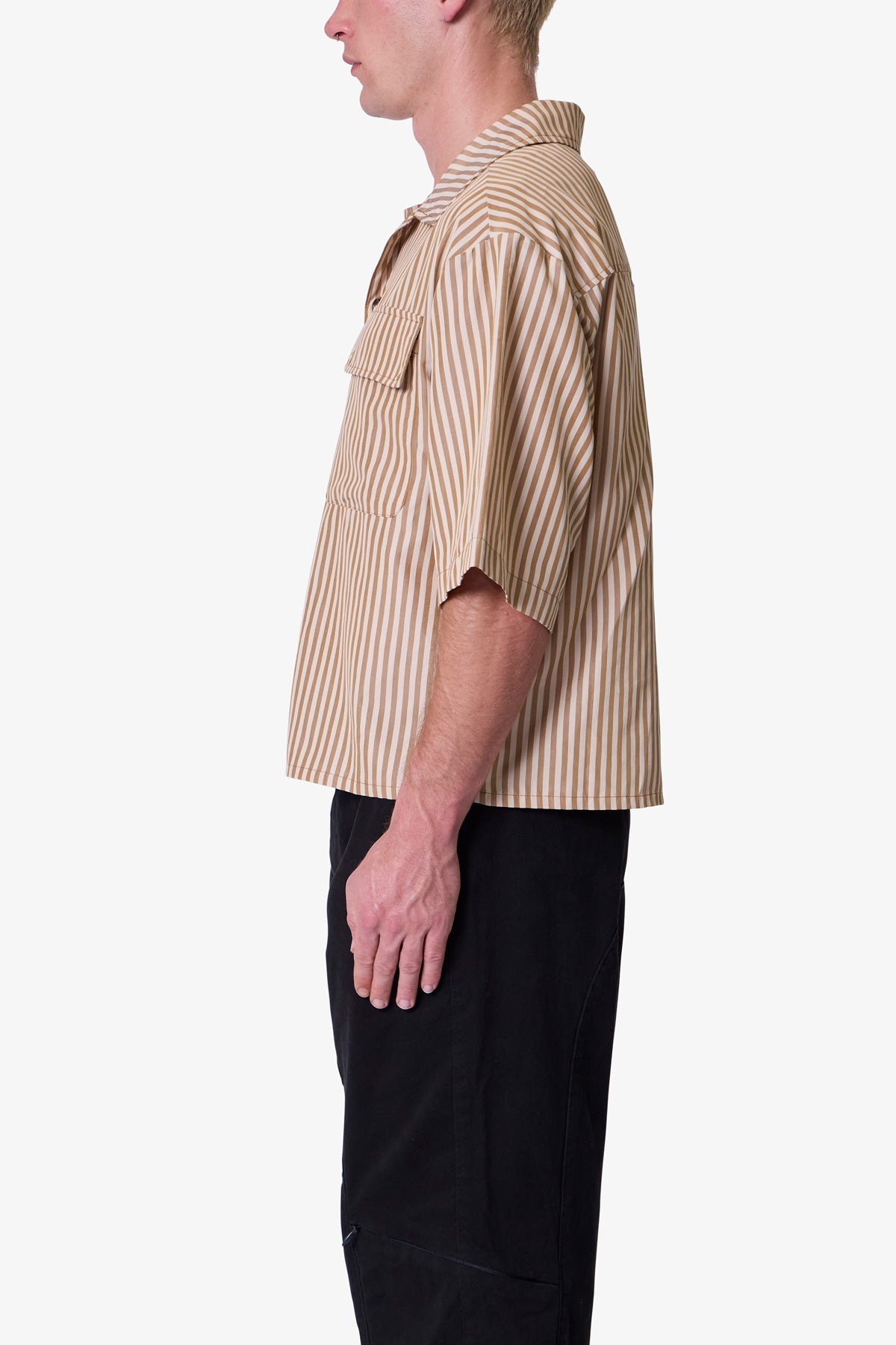 the Striped One Pocket Pajama Shirt is made from cotton/poly blend fabric with contrasting pinstripe pattern throughout. The relaxed-fit shirt features tortoise buttons. chest pocket. flat hem. and finished with a cropped length.