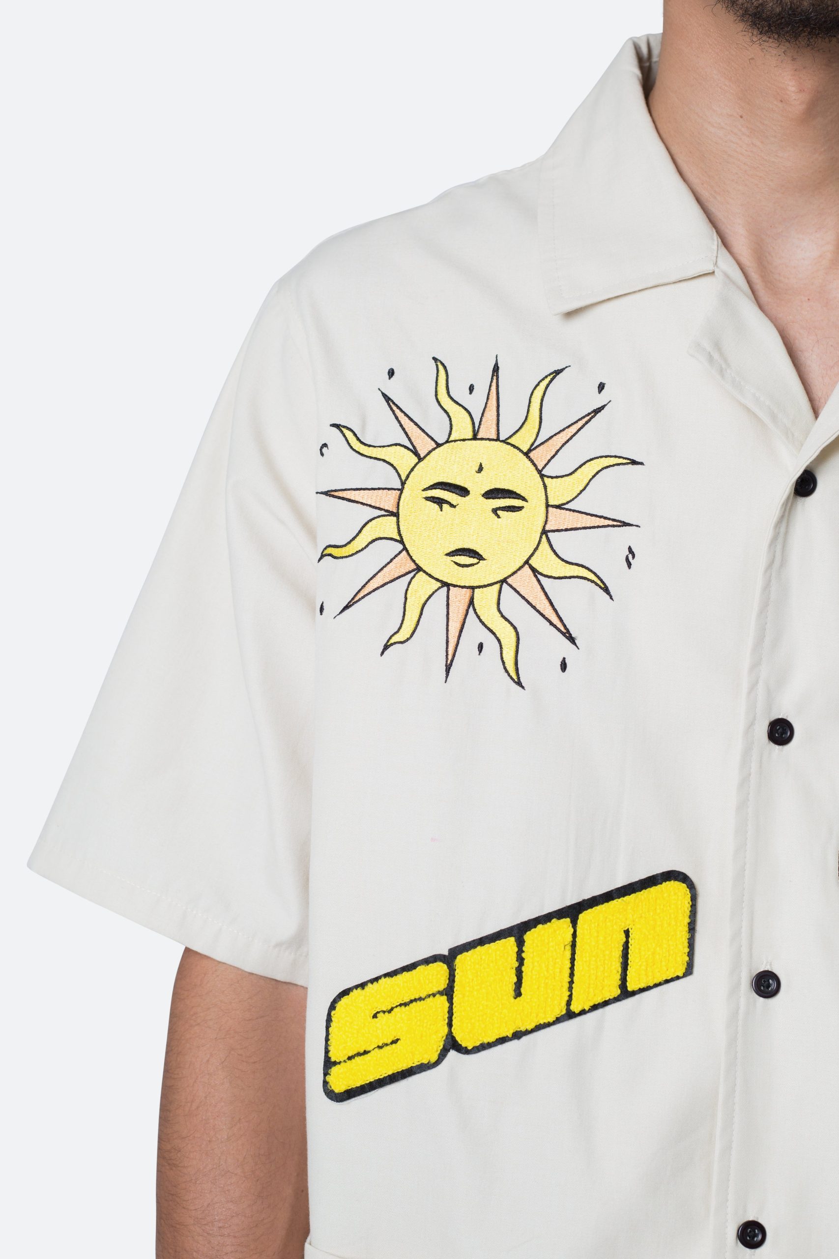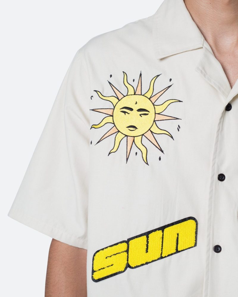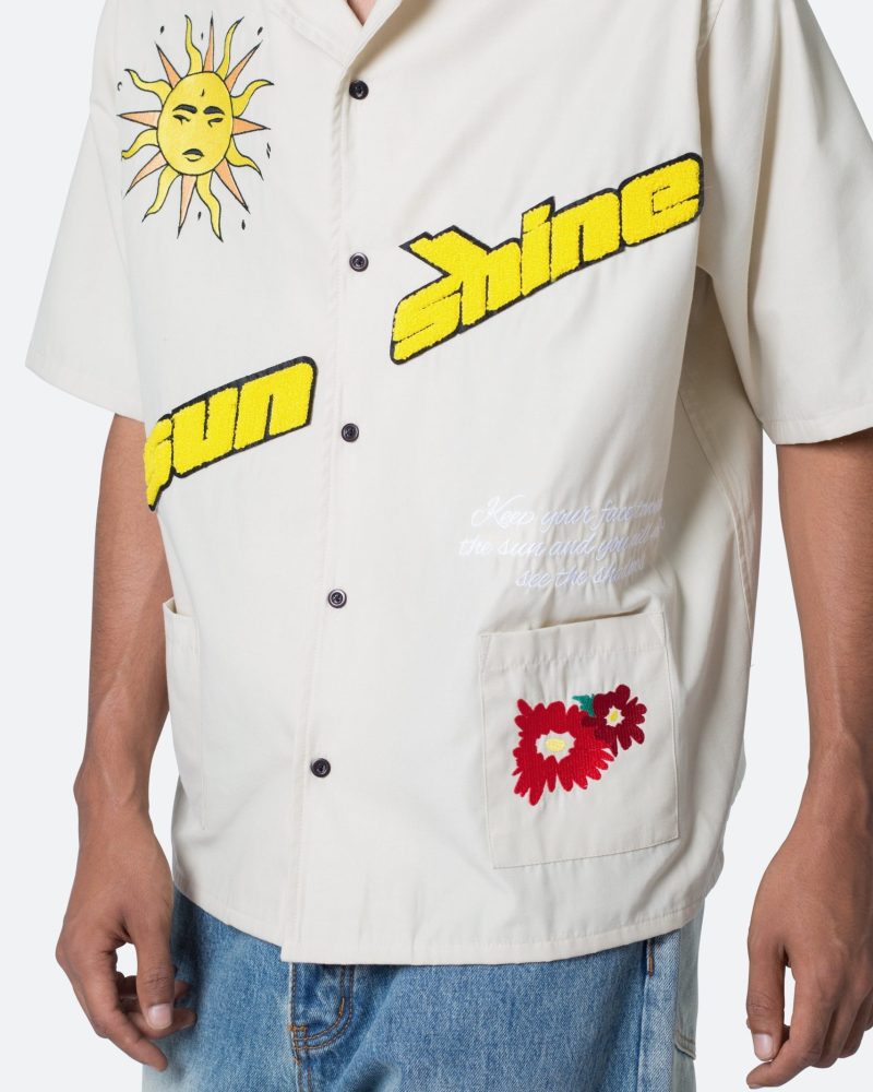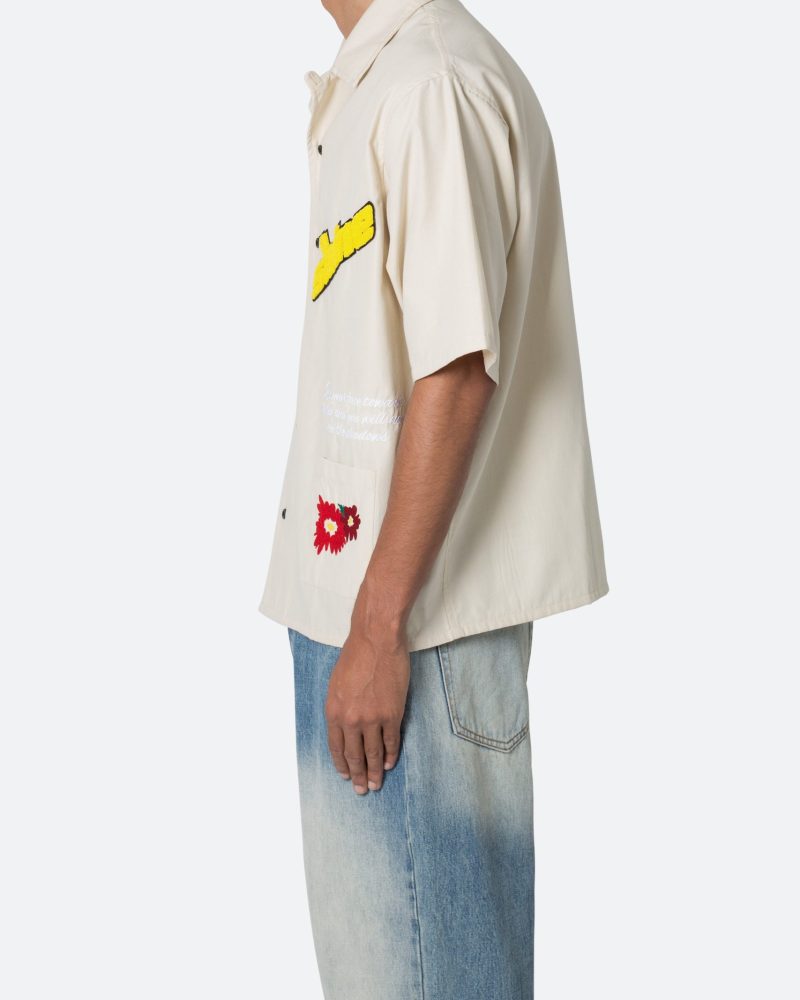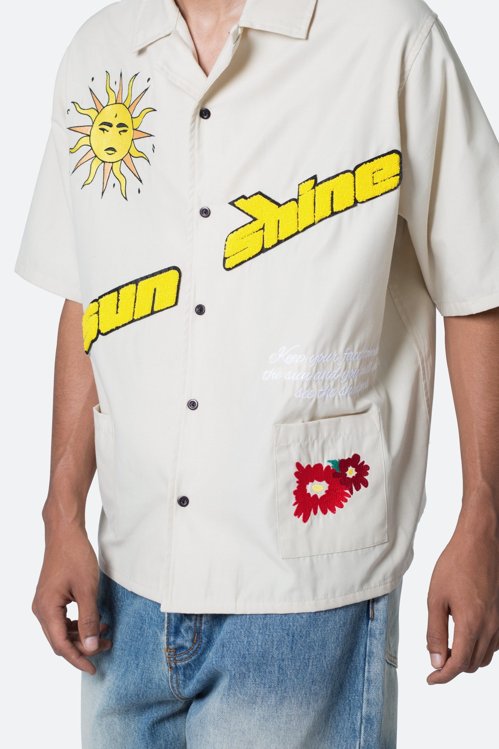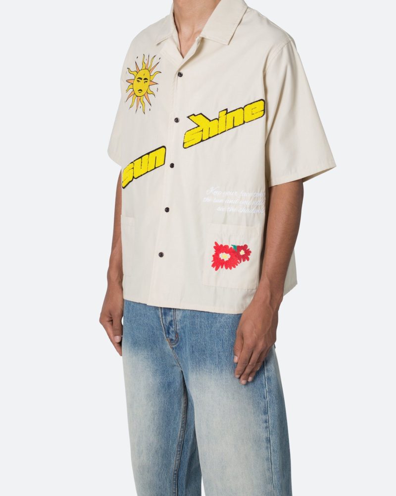 the Sunshine S/S Shirt is designed with a relax fit. and is made from a cotton poplin fabric with embroidery and chenile patch details throughout. and finished with a silicon wash for a softer hand feel.