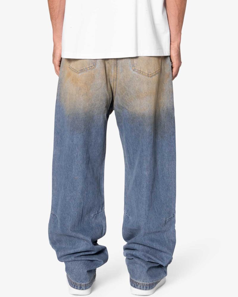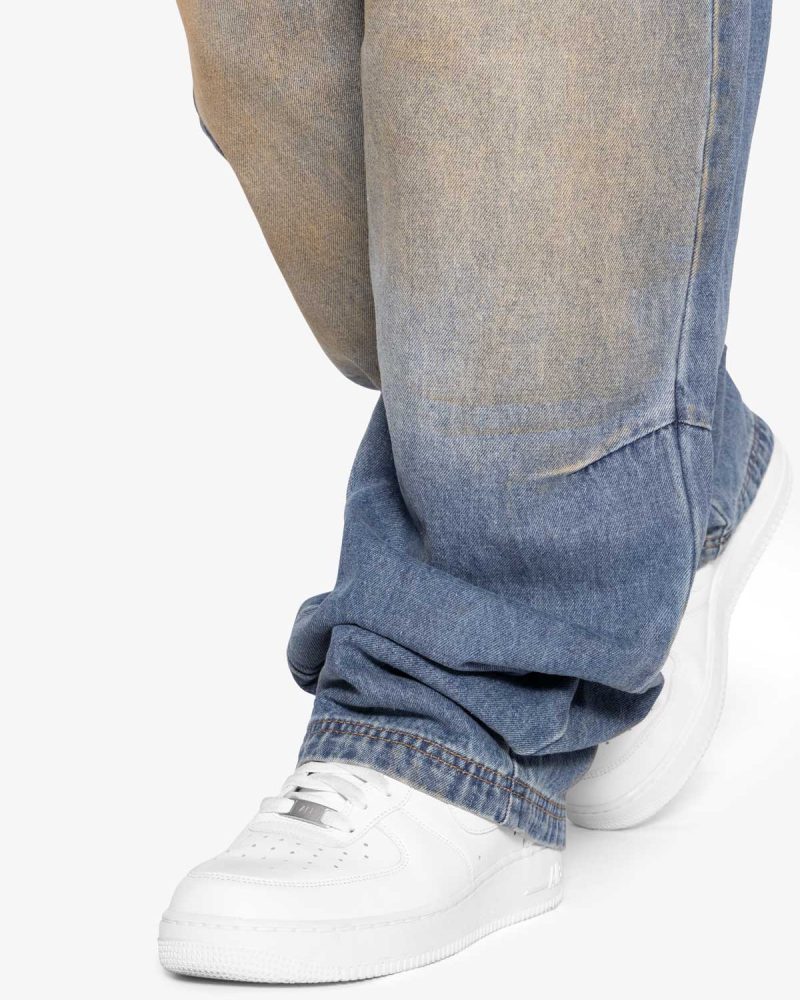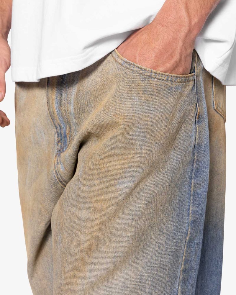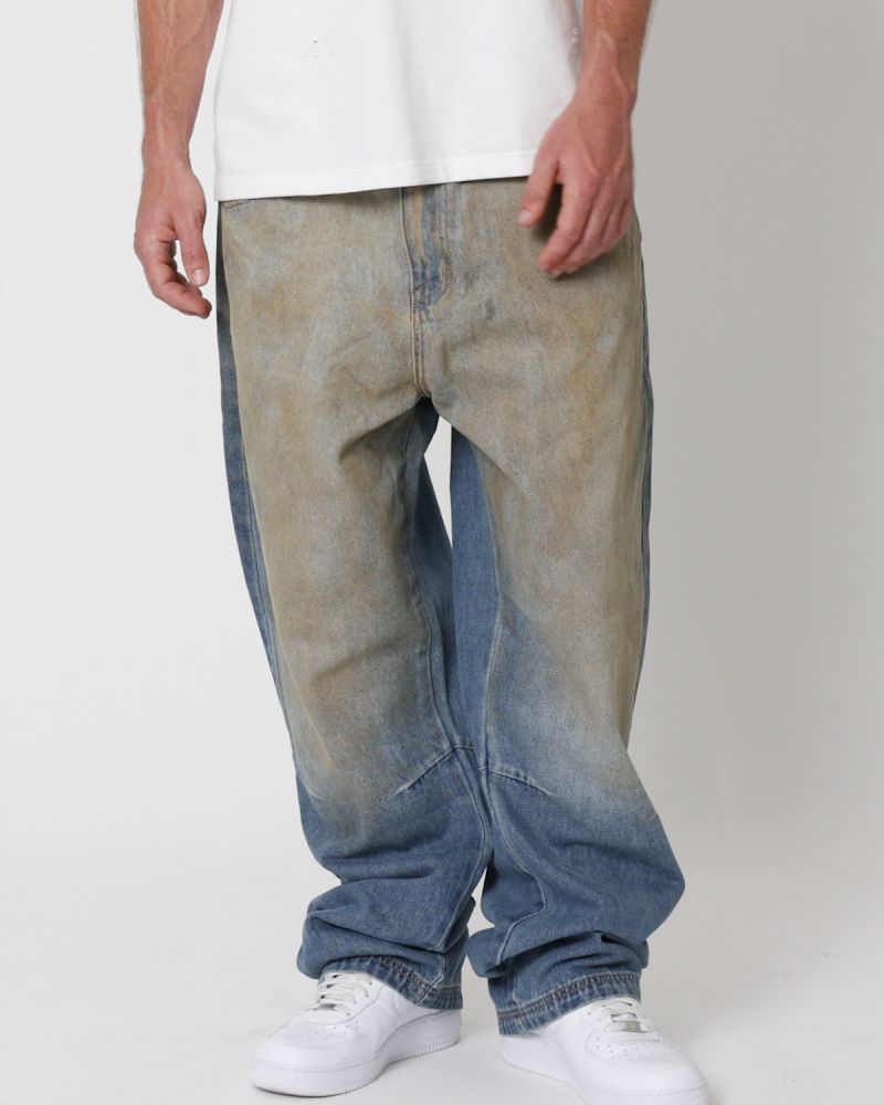the Ultra Baggy Barn Vintage Denim are designed with a new oversized ultra baggy fit. constructed from 100% cotton denim with a medium base wash. featuring a purposeful gradient effect to convey a dirty effect. and finished with brown ‘mud’ remarks.