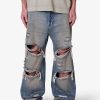the Ultra Baggy Denim Cargo Pants are designed with a new oversized ultra baggy fit. constructed from an olive colored denim with a rinse wash. featuring cargo pockets throughout with snap closures. gusseting at the knees. and finished with a button placket.