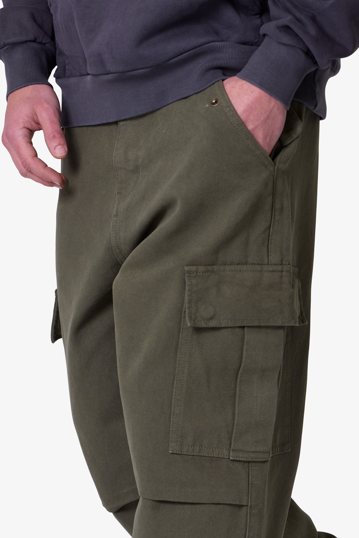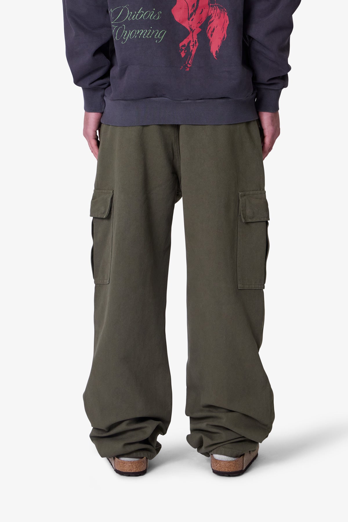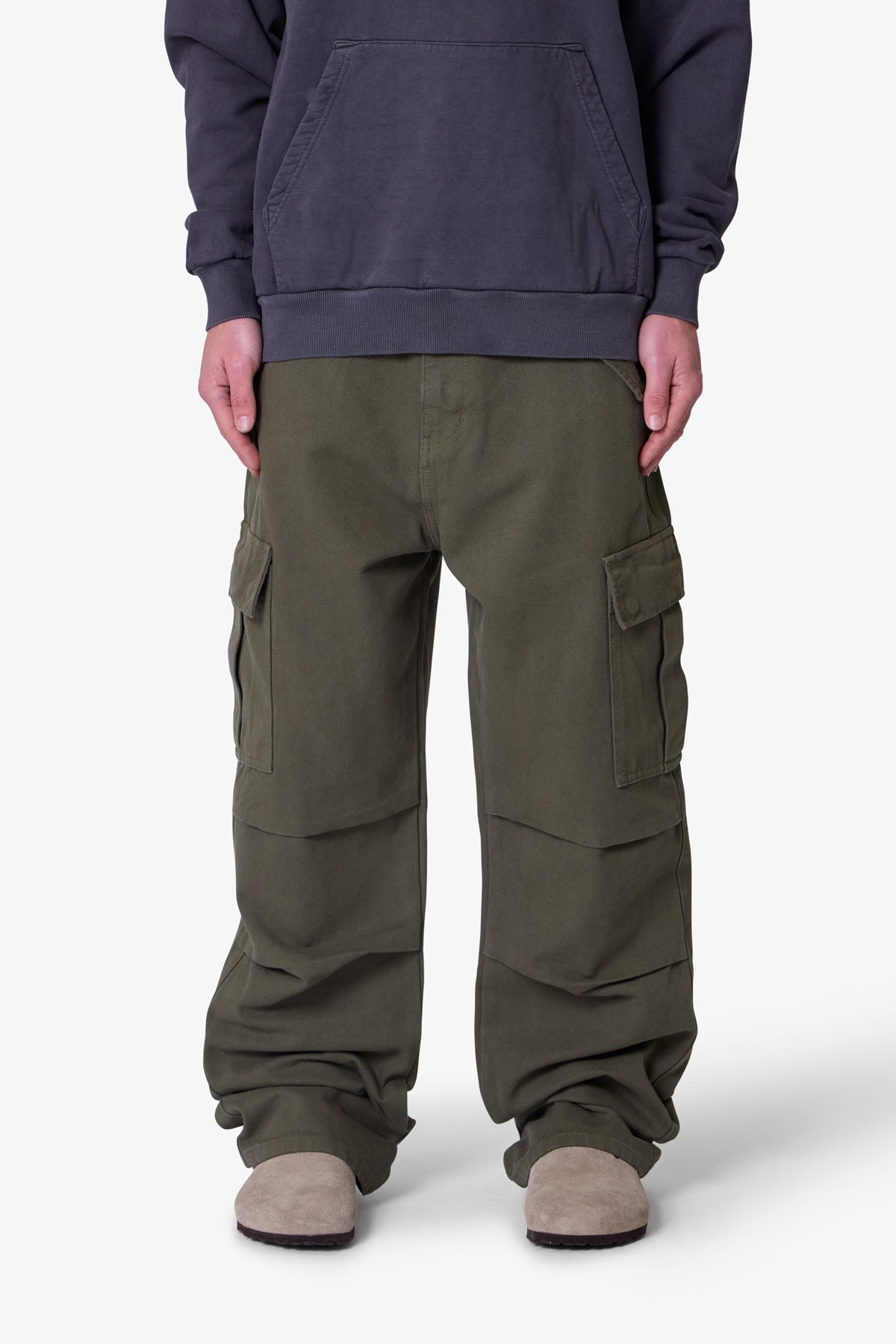 the Ultra Baggy Denim Cargo Pants are designed with a new oversized ultra baggy fit. constructed from an olive colored denim with a rinse wash. featuring cargo pockets throughout with snap closures. gusseting at the knees. and finished with a button placket.