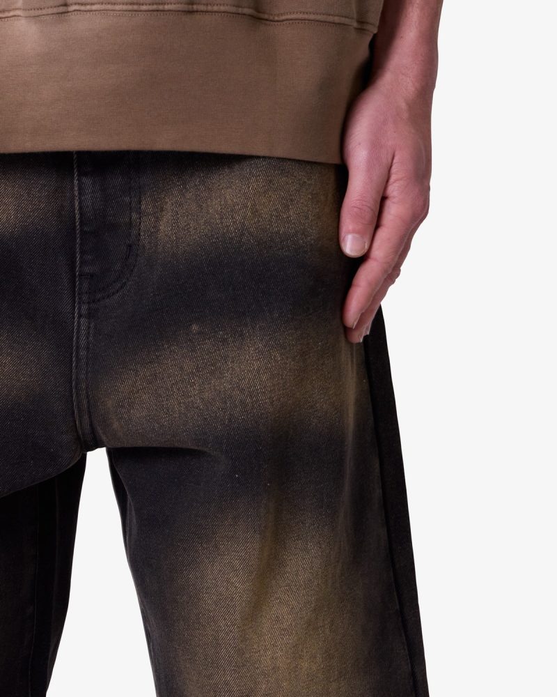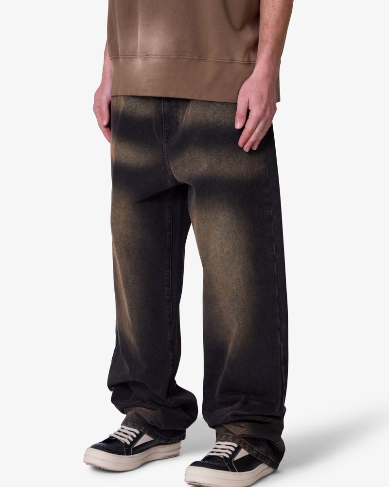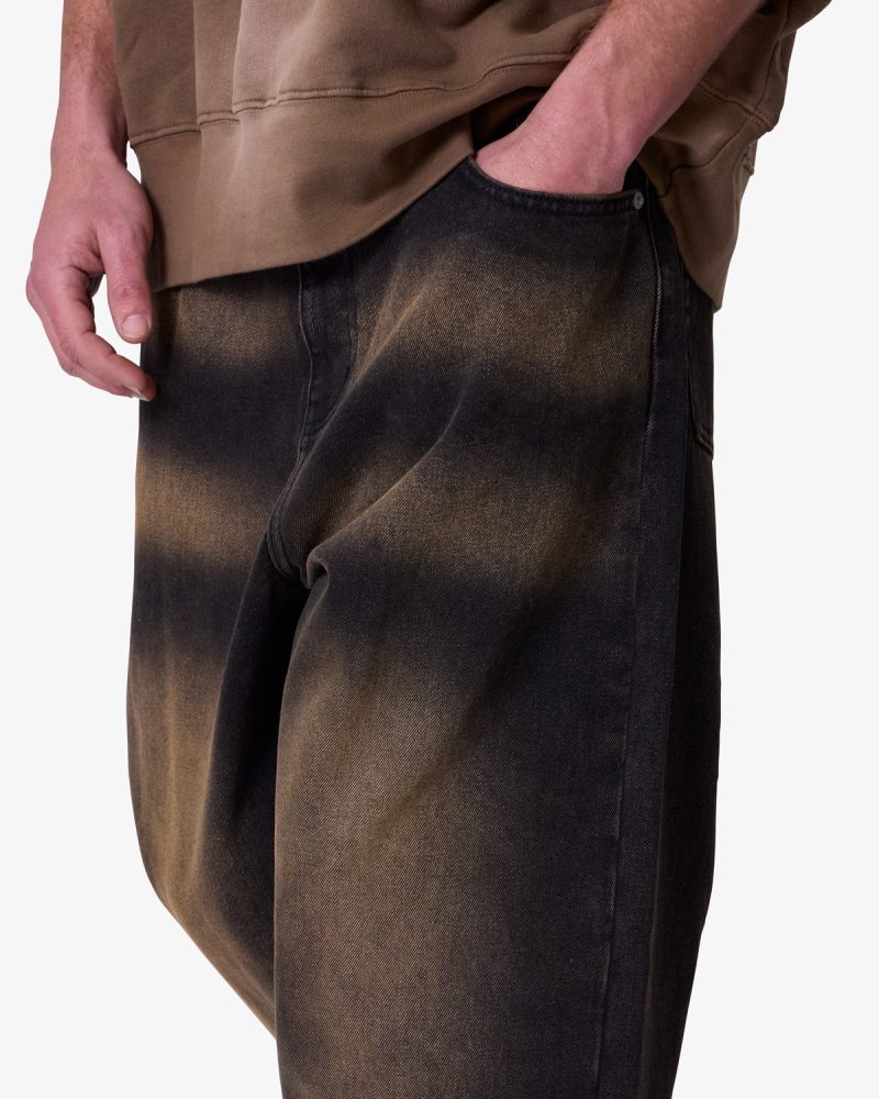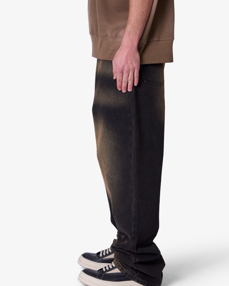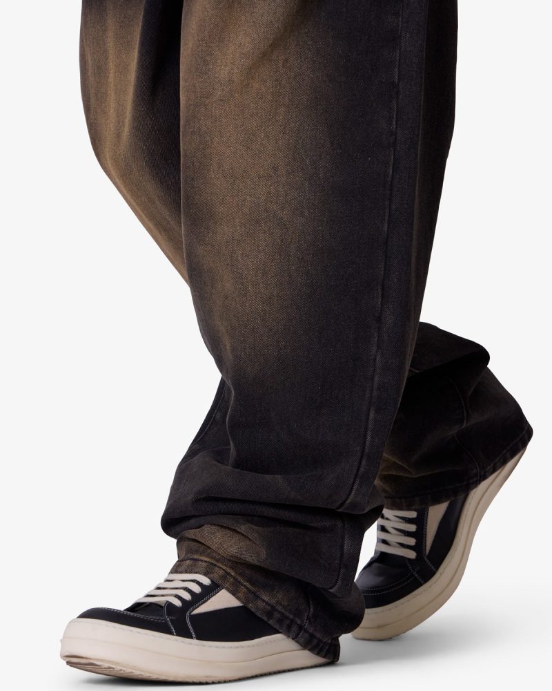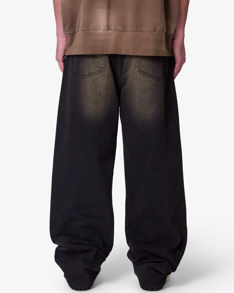 the Ultra Baggy Dried Denim are designed with a new oversized ultra baggy fit. constructed from black denim with a vintage wash with sanding throughout. featuring standard five pocket denim details. and finished with a button placket.