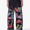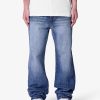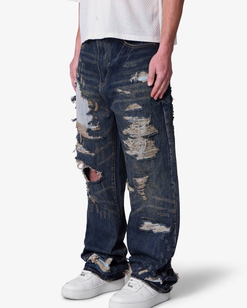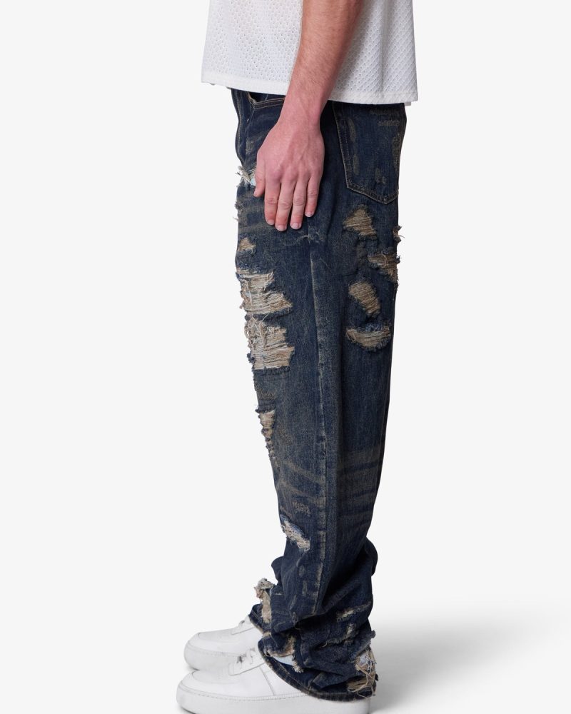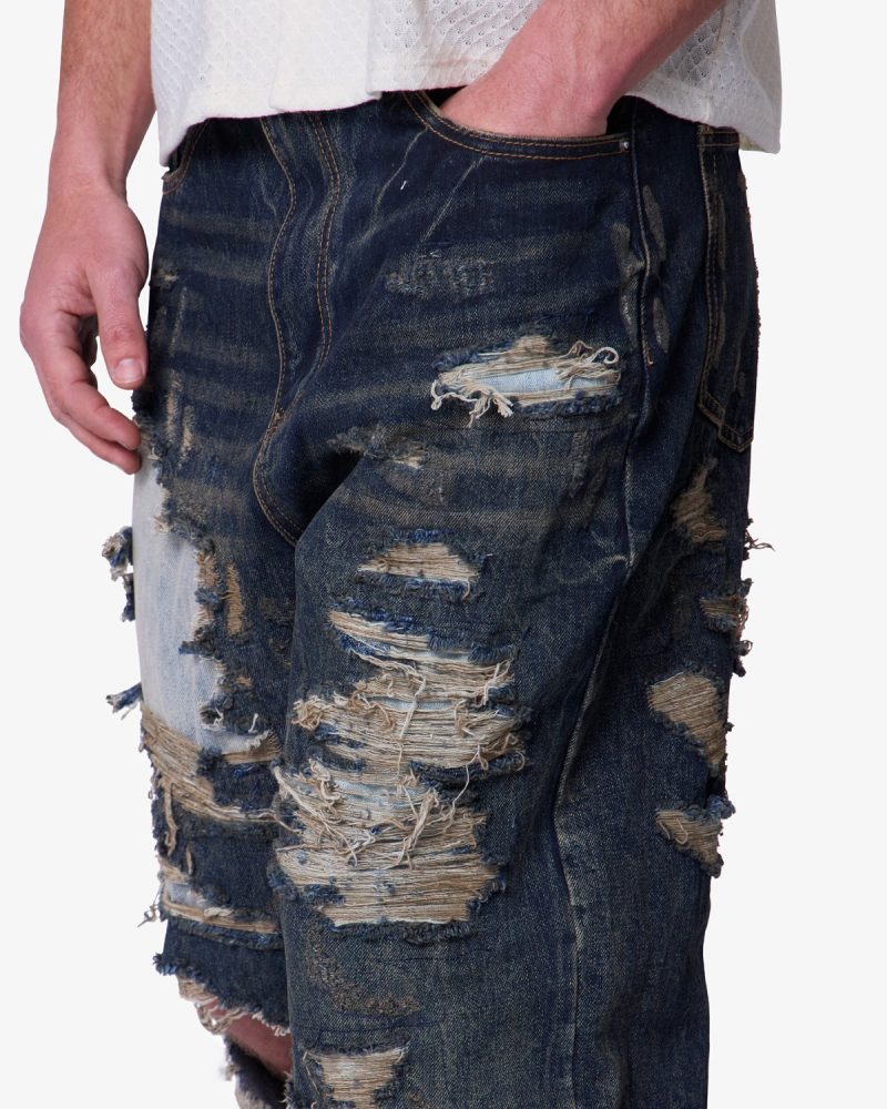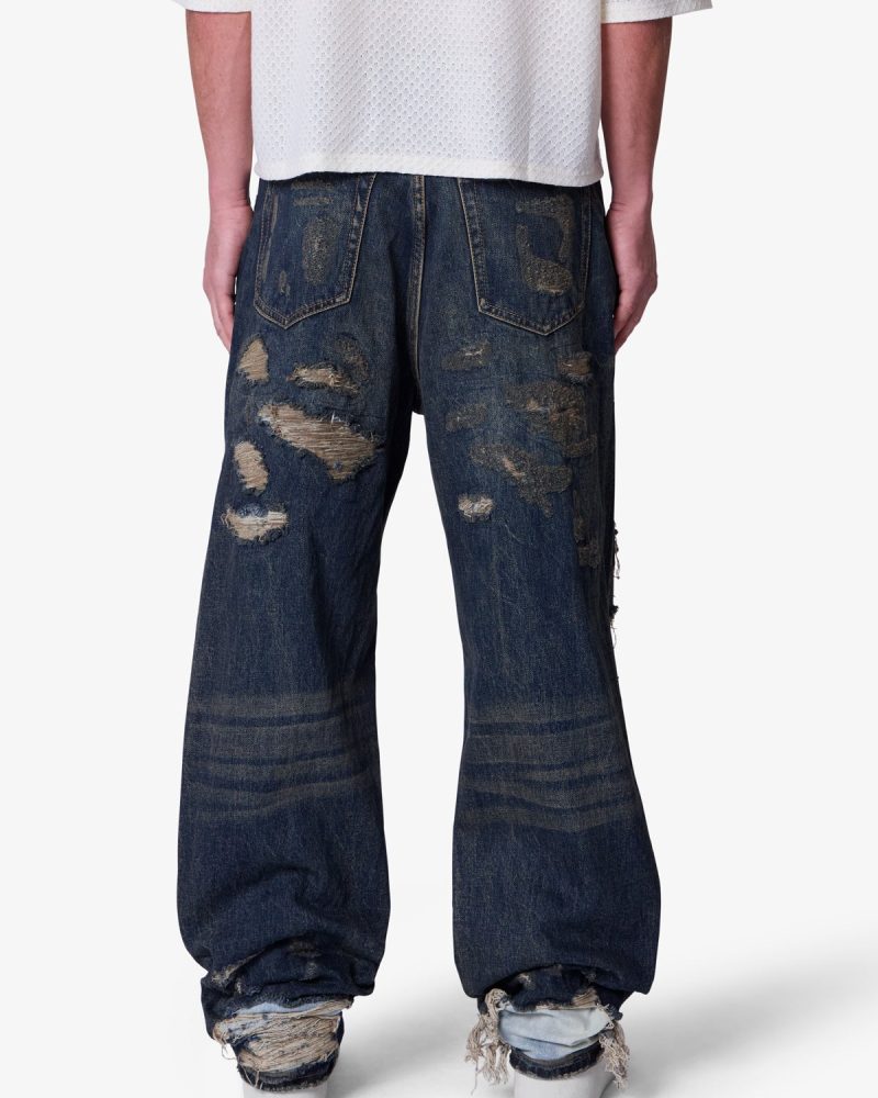 The Ultra Baggy Gashed Denim is constructed from 100% cotton 13 oz denim and finished in a dark vintage blue wash. Designed with an ultra baggy fit and an extended front rise. the silhouette draws inspiration from vintage repaired Japanese denim. Heavy distressing. repaired blow outs. and contrast denim patches are reinforced with sashiko-inspired stitching. Finished with five functional pockets and a zip fly closure.