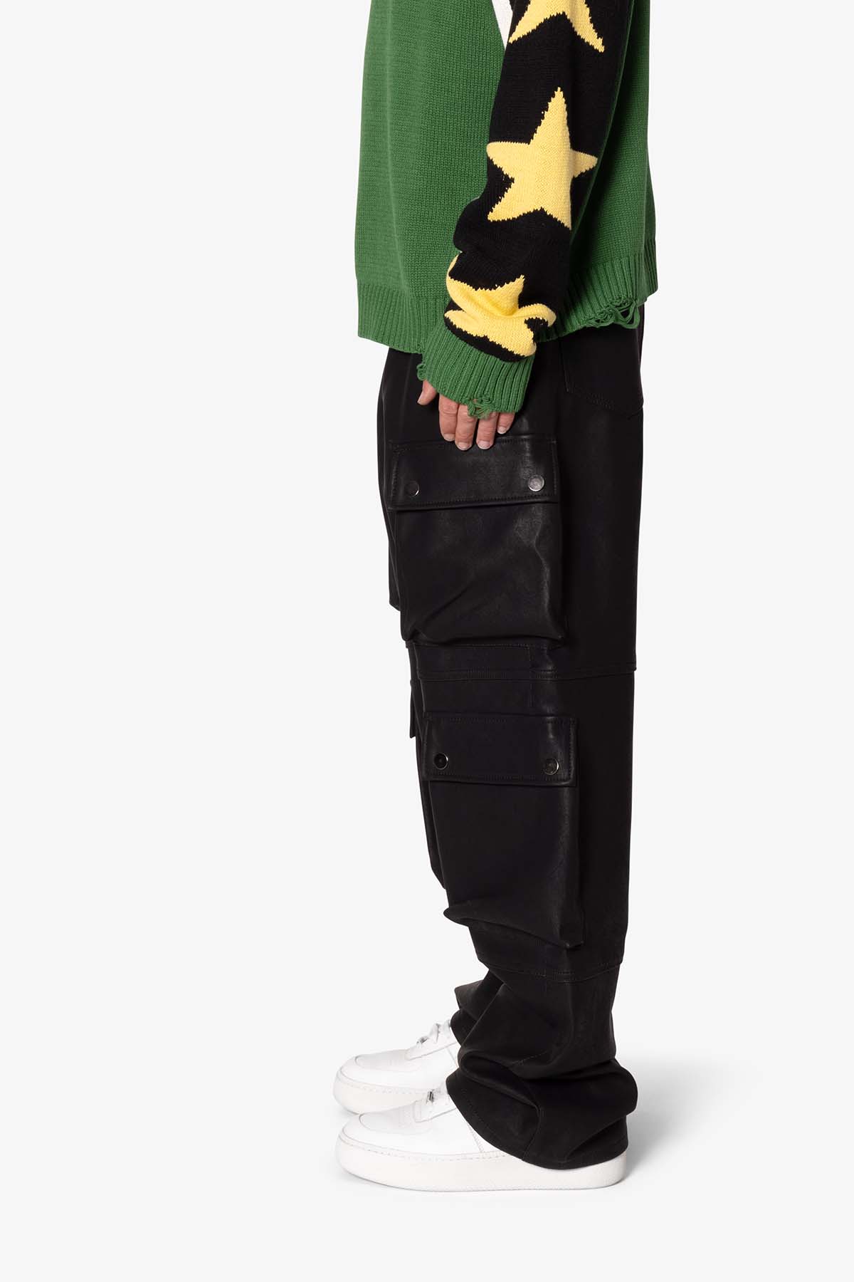 the Ultra Baggy Leather Cargo Pants is designed with our new oversized ultra baggy fit. constructed from a synthetic leather fabric. gloss silver snap closures on the cargo pockets throughout. and finished with a zipper fly.