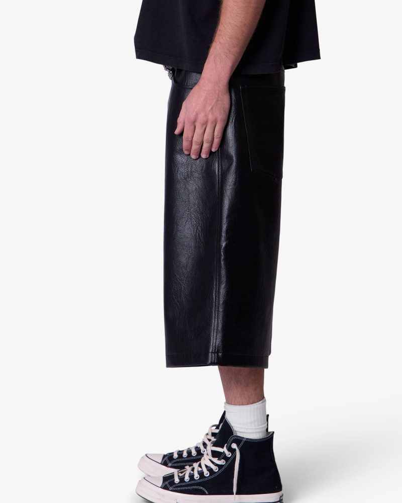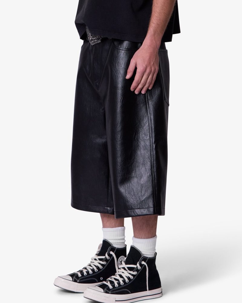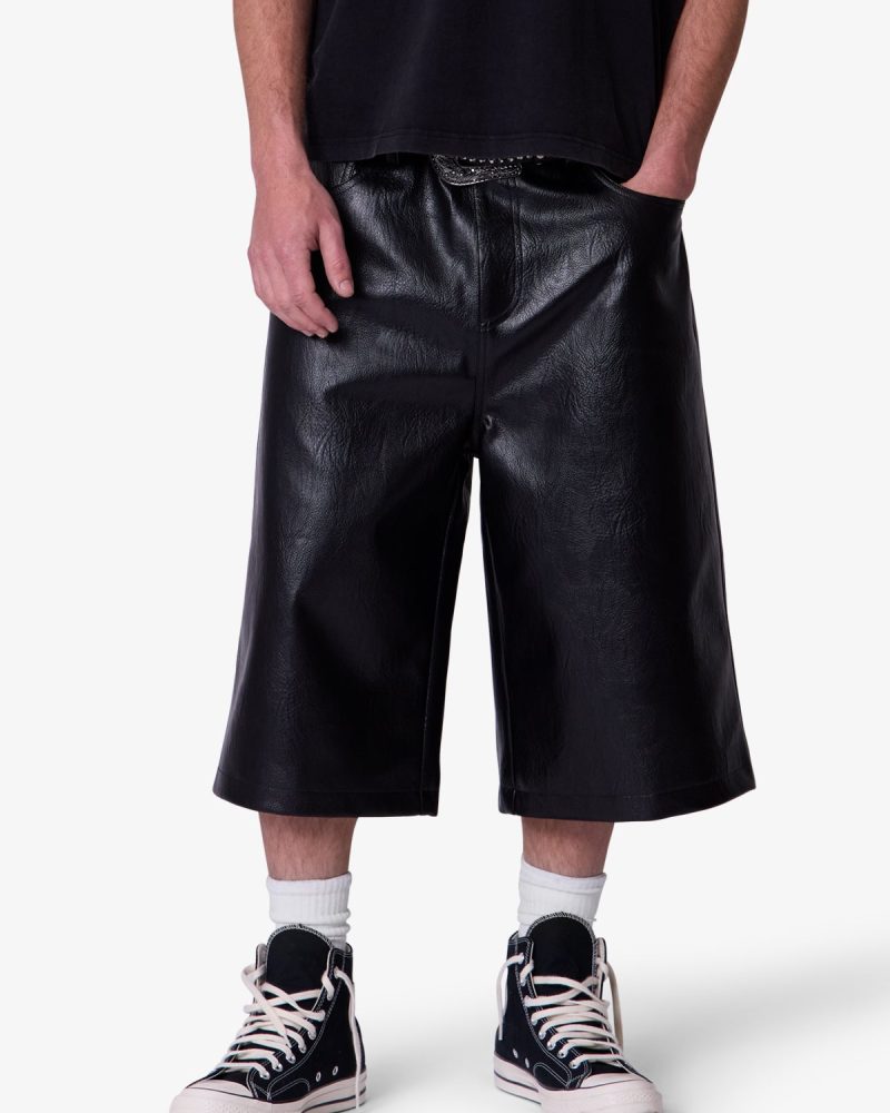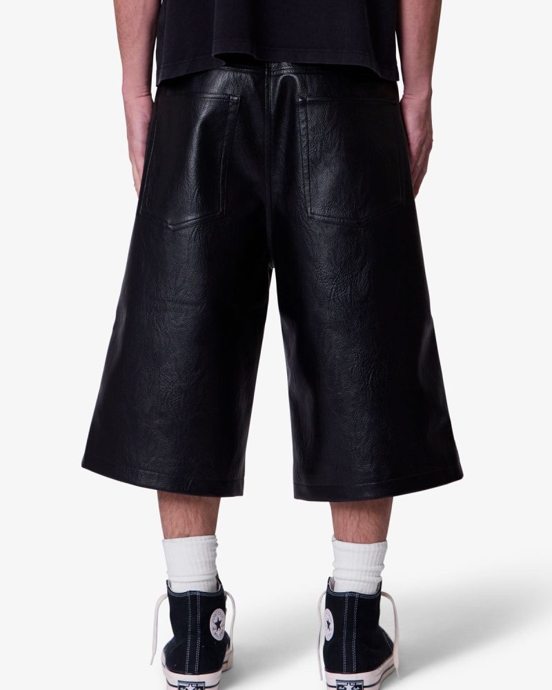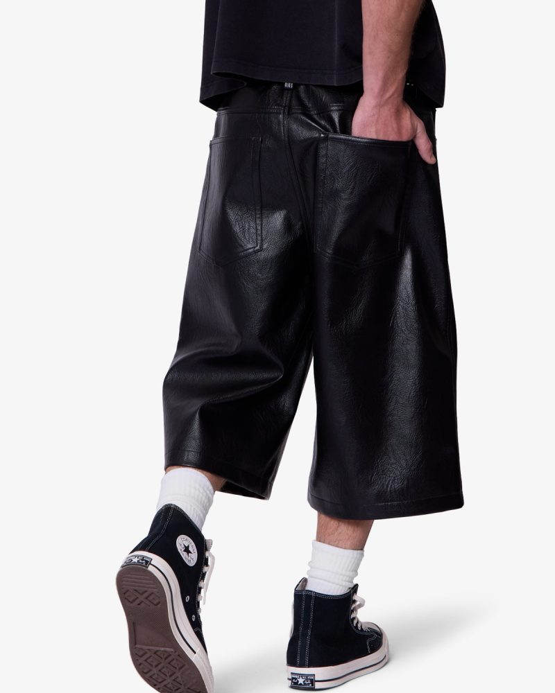 Constructed from textured faux leather. these shorts feature an ultra baggy fit with a wide leg silhouette. Designed with five pockets. standard belt loops. and finished with a front zip fly and button closure.