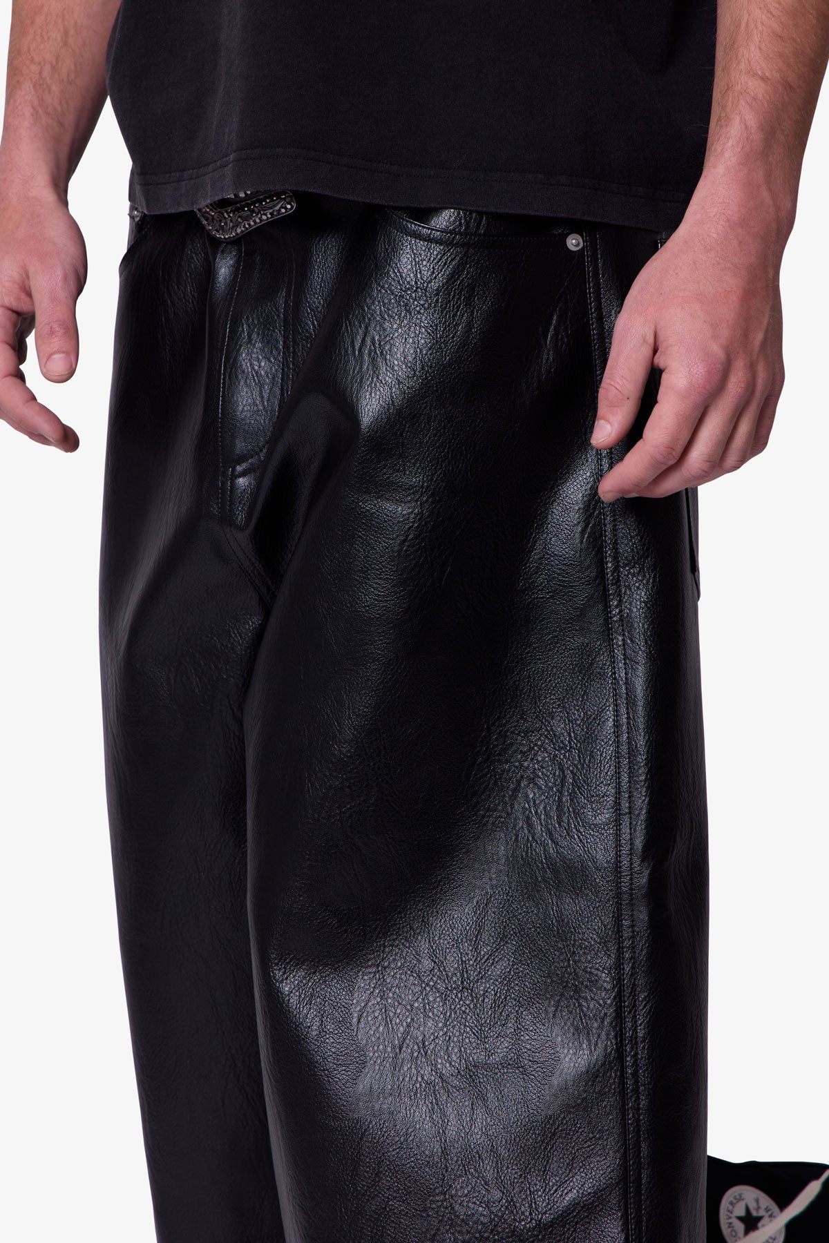 Constructed from textured faux leather. these shorts feature an ultra baggy fit with a wide leg silhouette. Designed with five pockets. standard belt loops. and finished with a front zip fly and button closure.