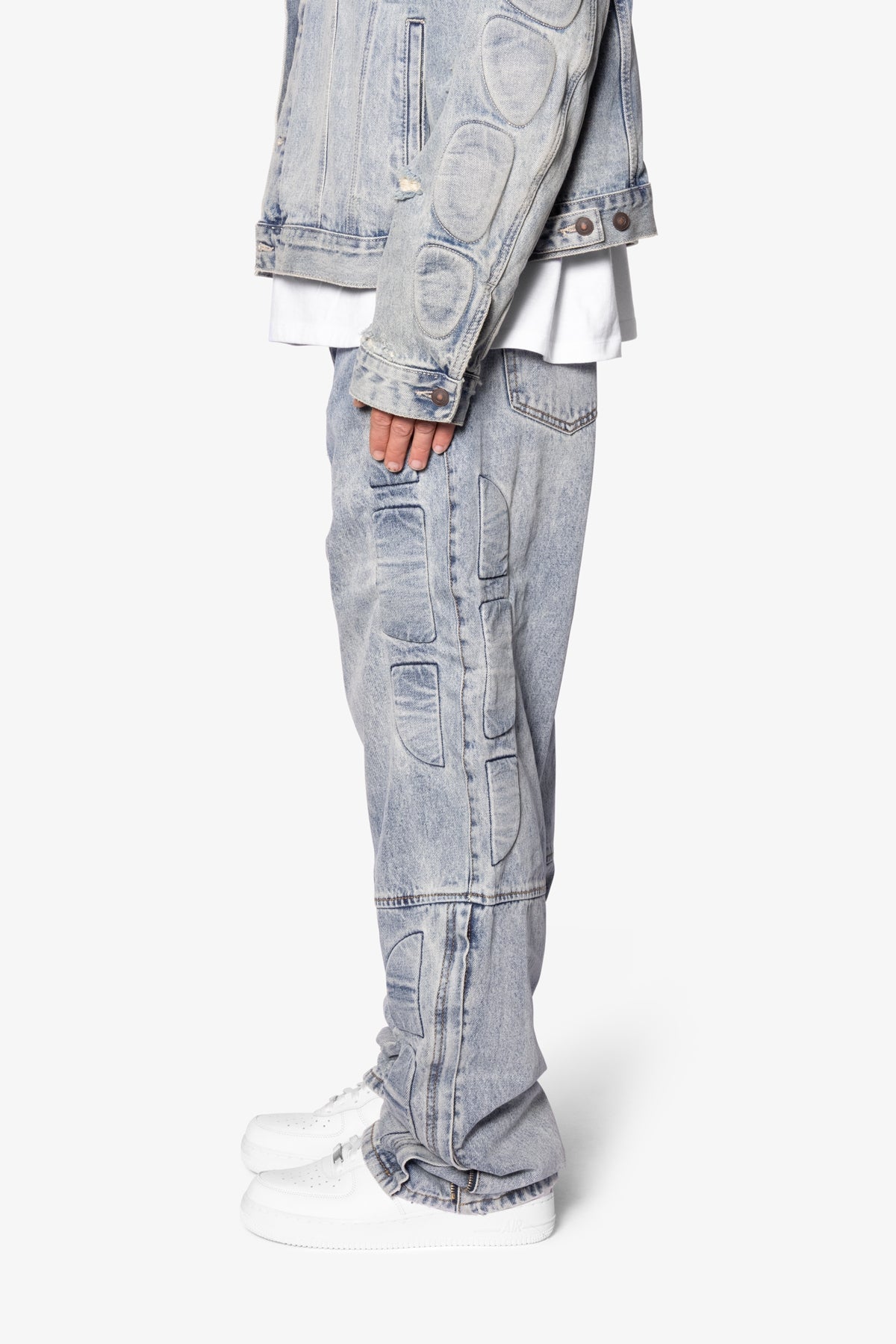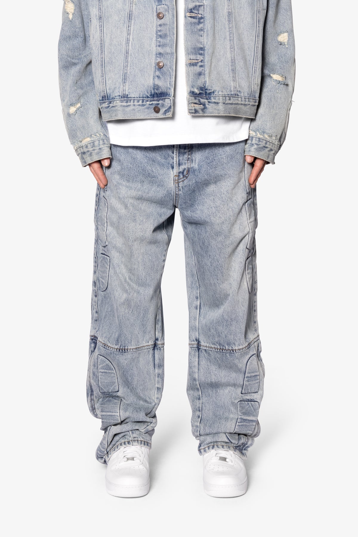 the Ultra Baggy Moto Denim are designed with a new oversized ultra baggy fit. constructed from denim with a vintage wash. padded moto inspired details at the outseam. featuring standard five pocket denim details. and finished with a button placket.