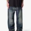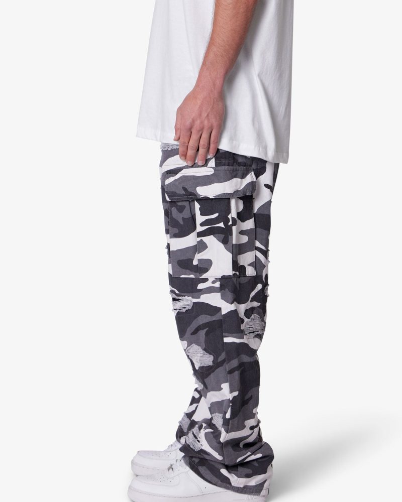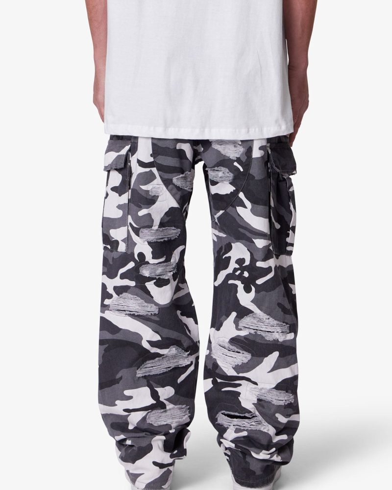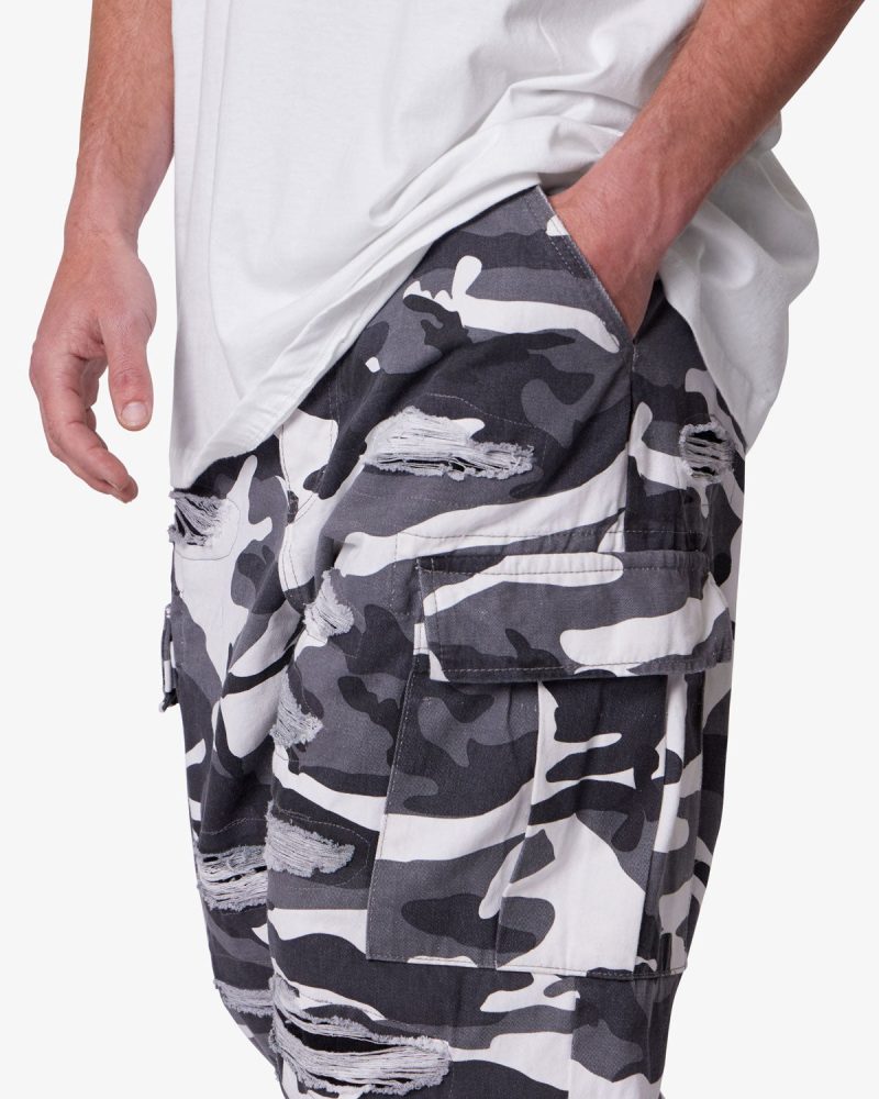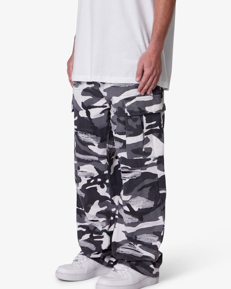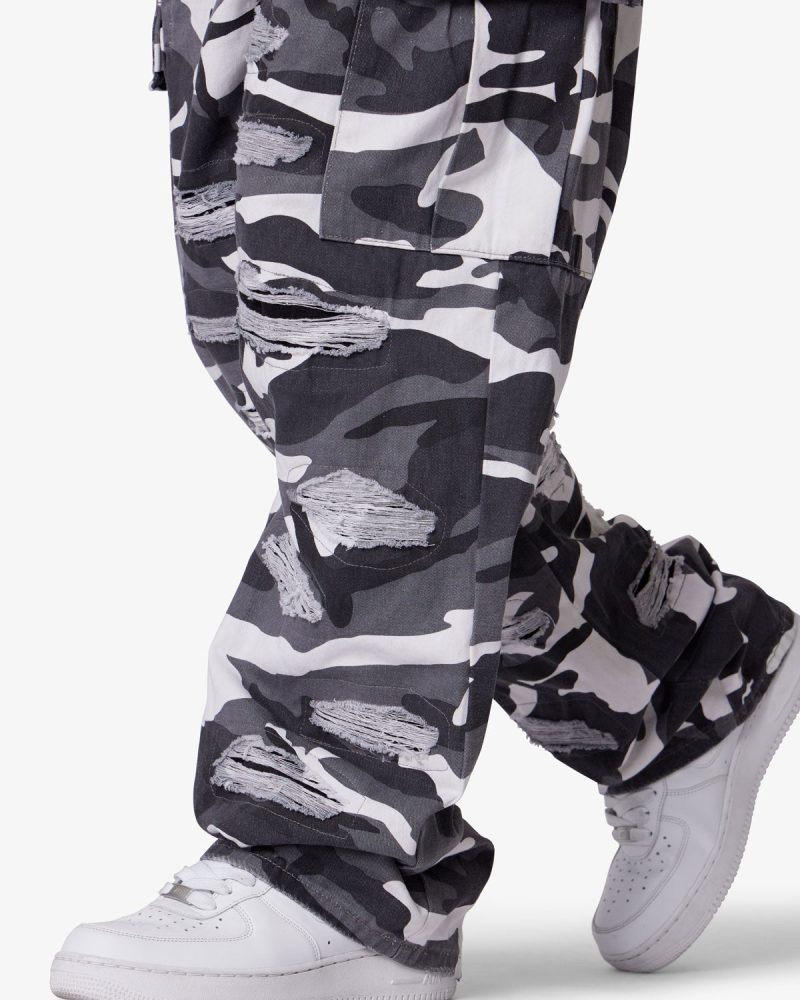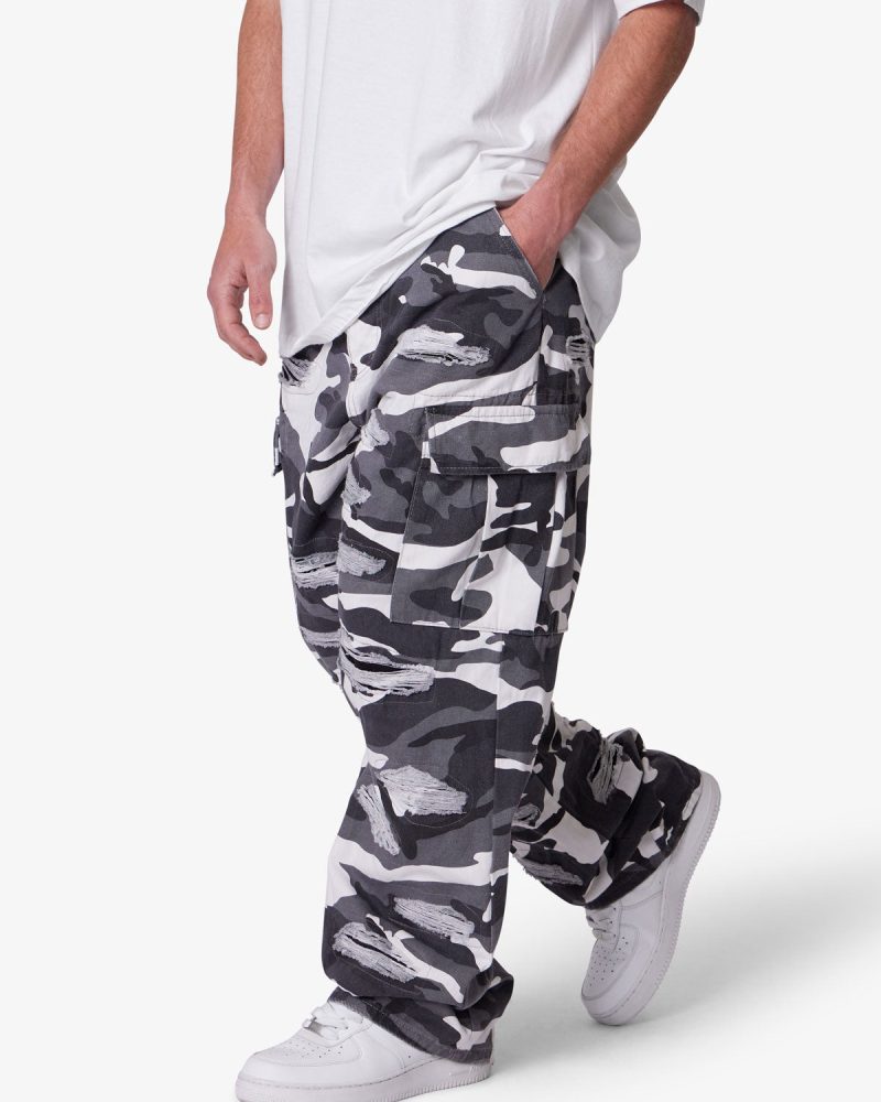 the Ultra Baggy Skated Cargo Pants are designed with a new oversized ultra baggy fit. constructed from a urban camo printed denim with a rinse wash and distressing details throughout. featuring cargo pockets throughout with snap closures. and finished with a button placket.
