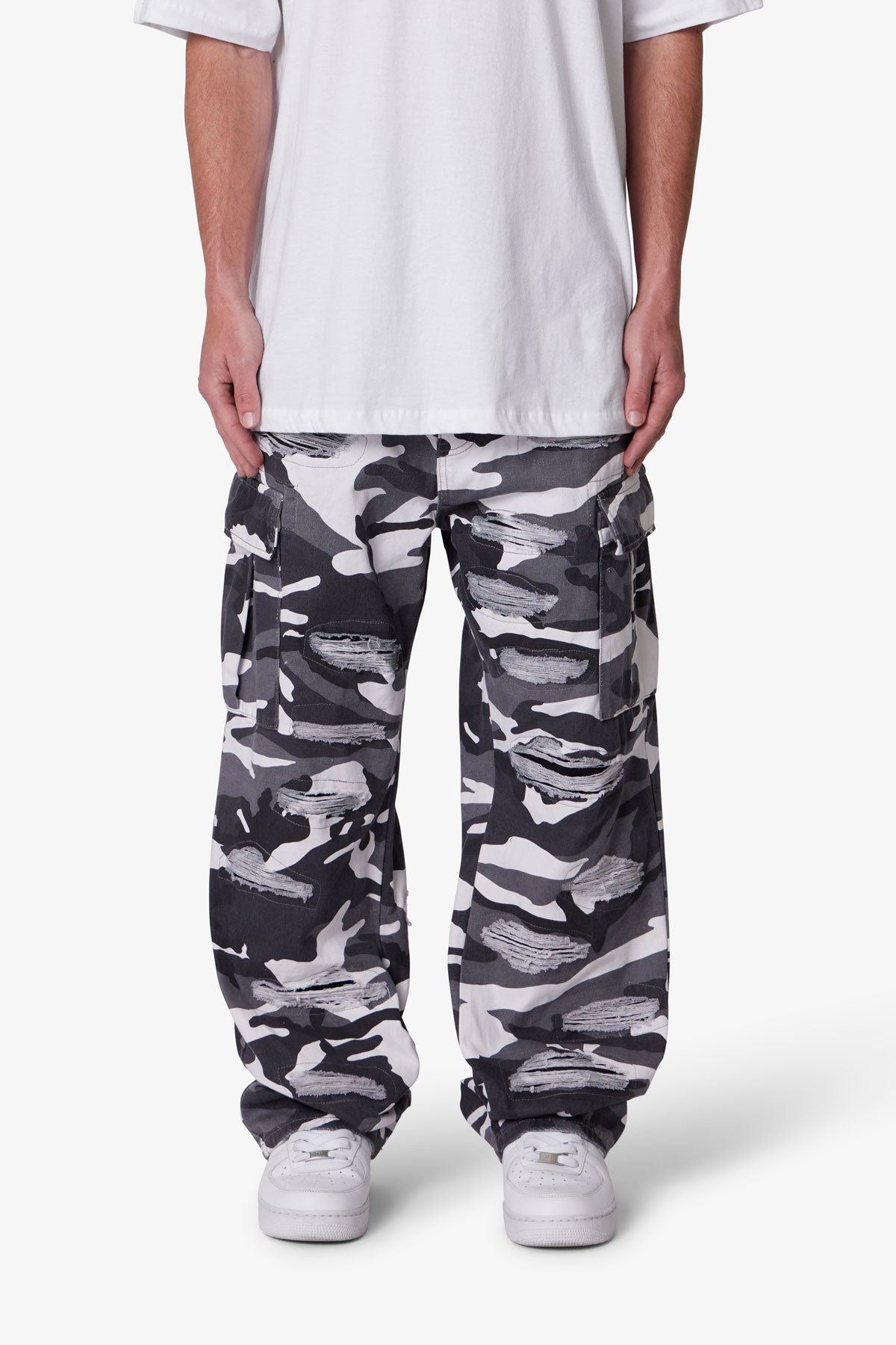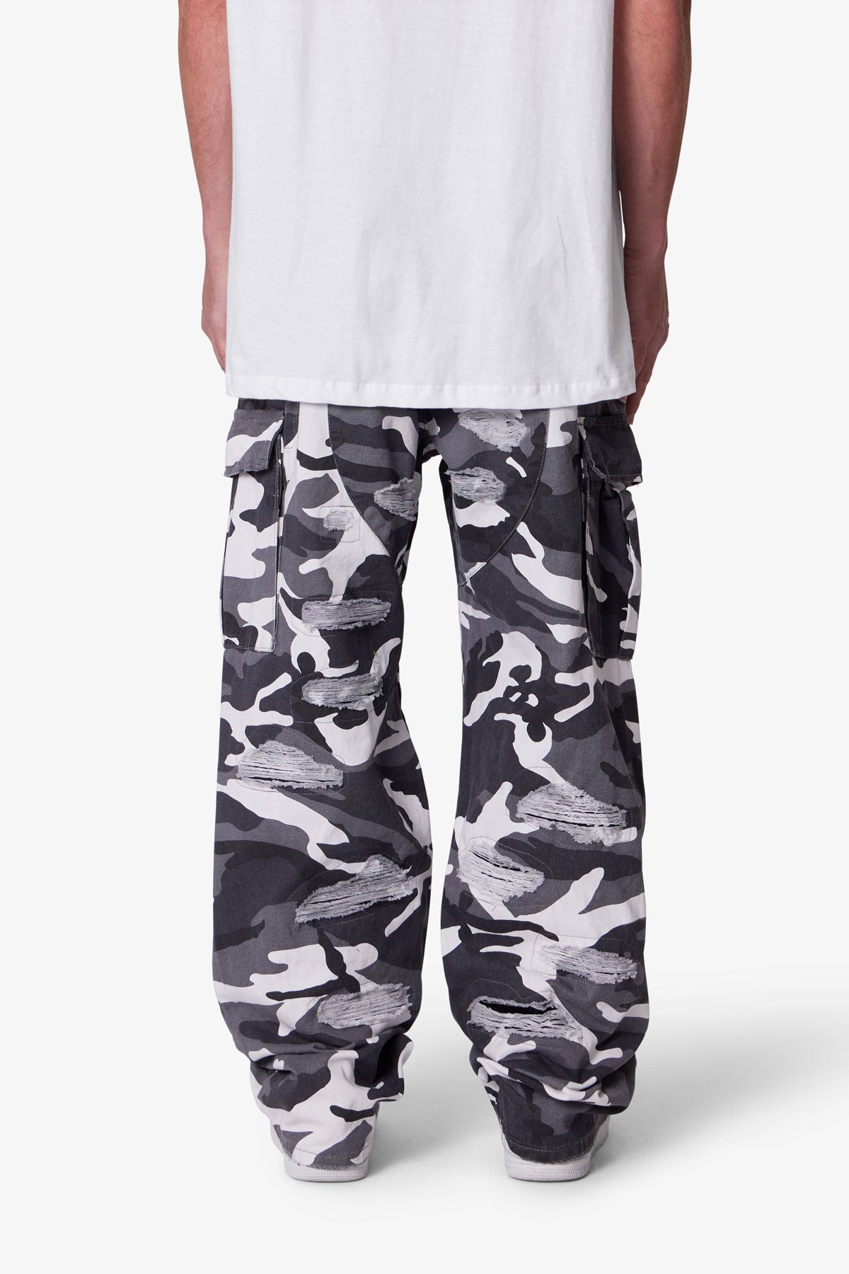 the Ultra Baggy Skated Cargo Pants are designed with a new oversized ultra baggy fit. constructed from a urban camo printed denim with a rinse wash and distressing details throughout. featuring cargo pockets throughout with snap closures. and finished with a button placket.