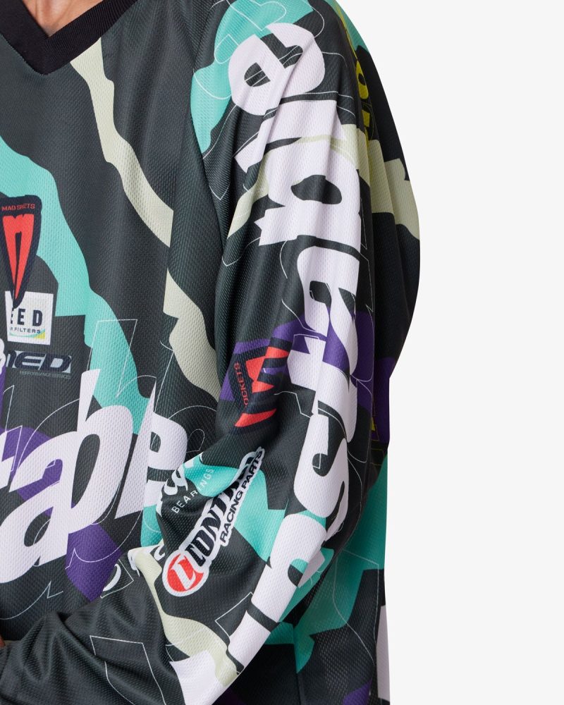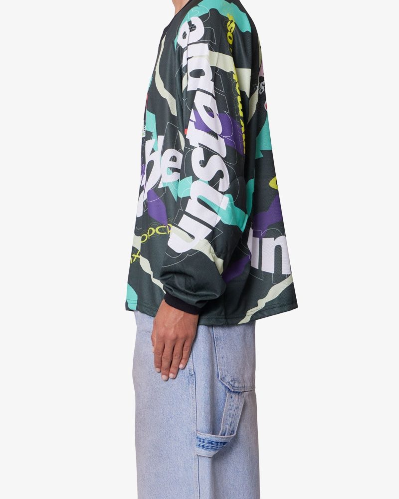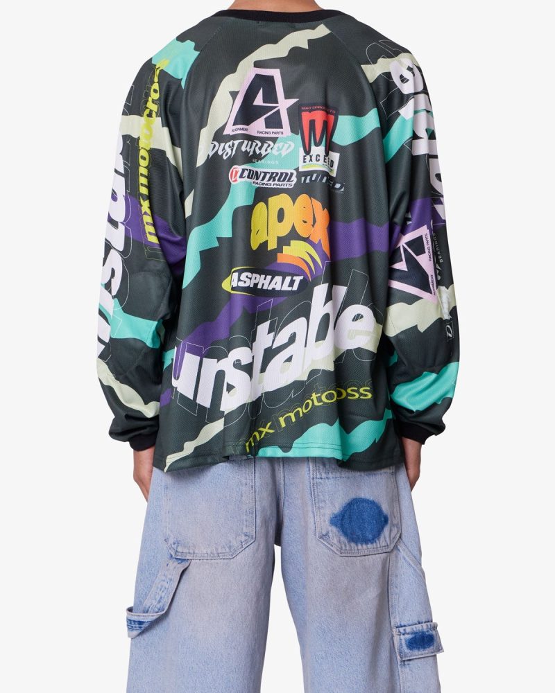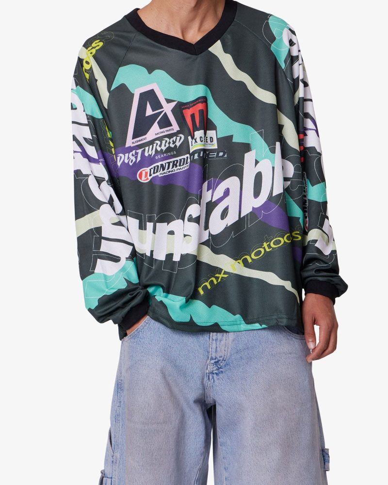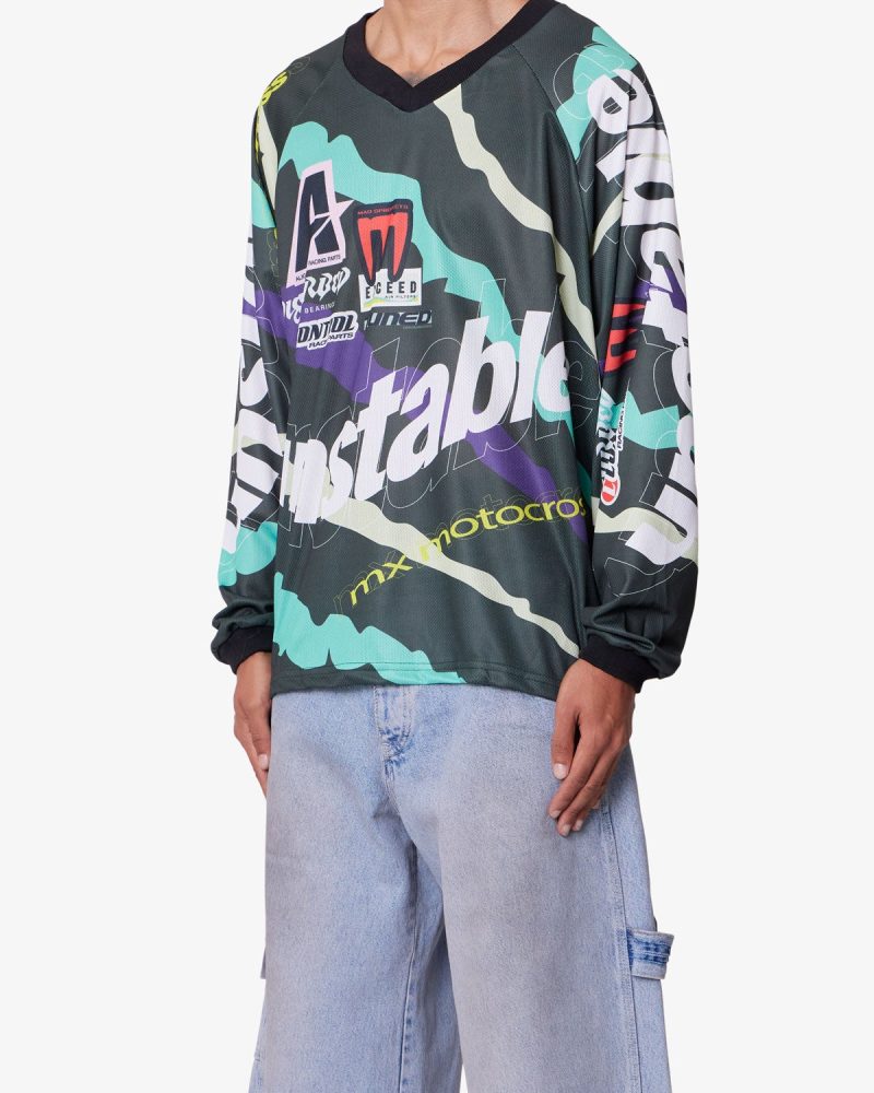 Constructed from 100% polyester. this motocross-inspired jersey features roll-printed artwork with graphic multicolored motifs. Designed with a V neck and raglan sleeves for increased mobility. it includes ribbed trim at the neckline and sleeve cuffs. Finished with a chest logo graphic and unstable text across the front.