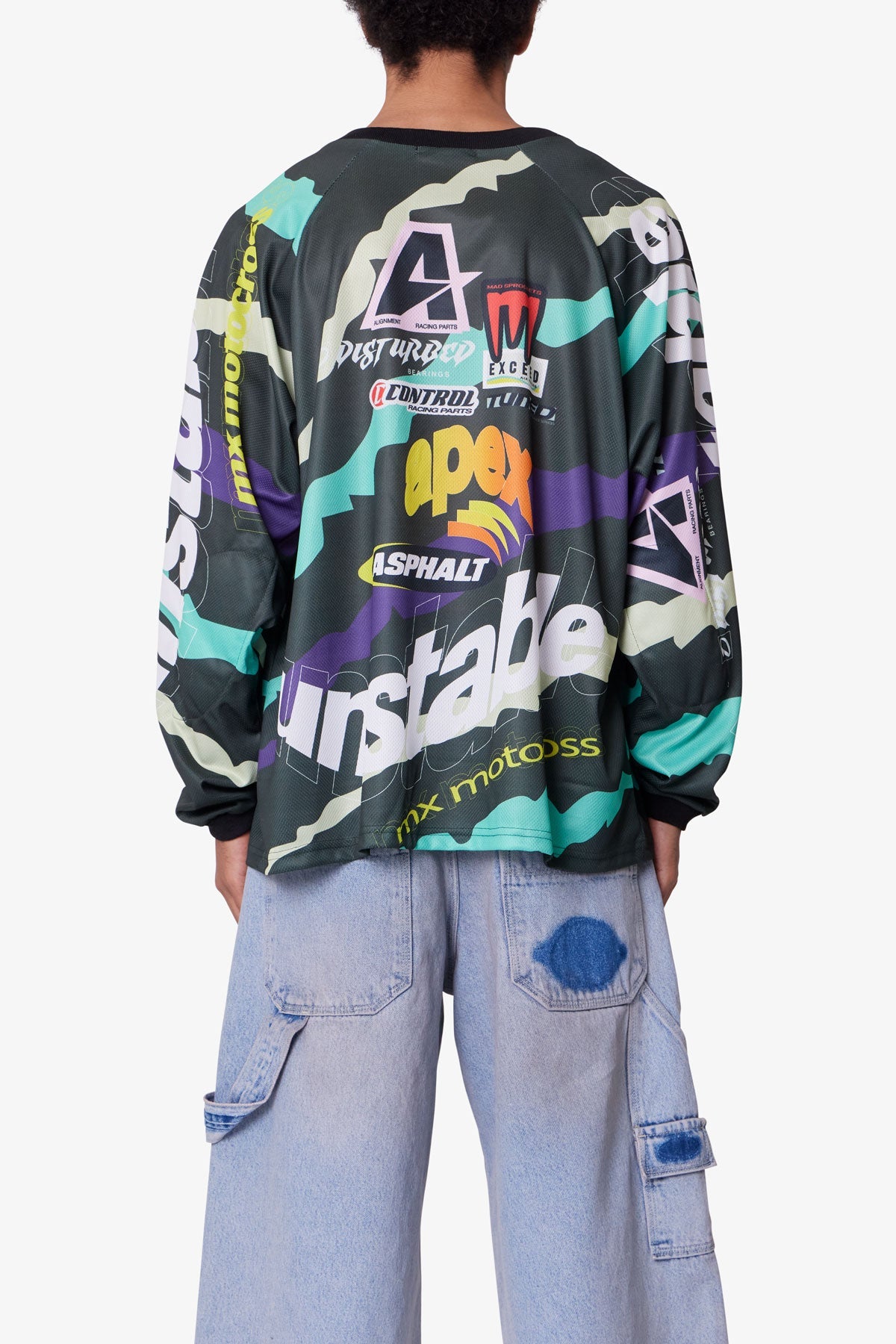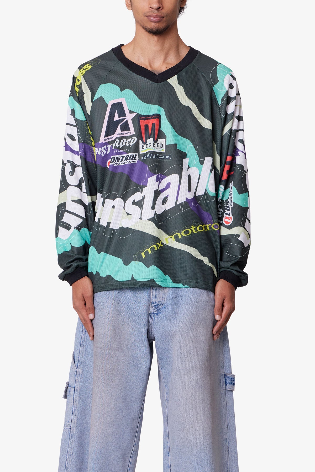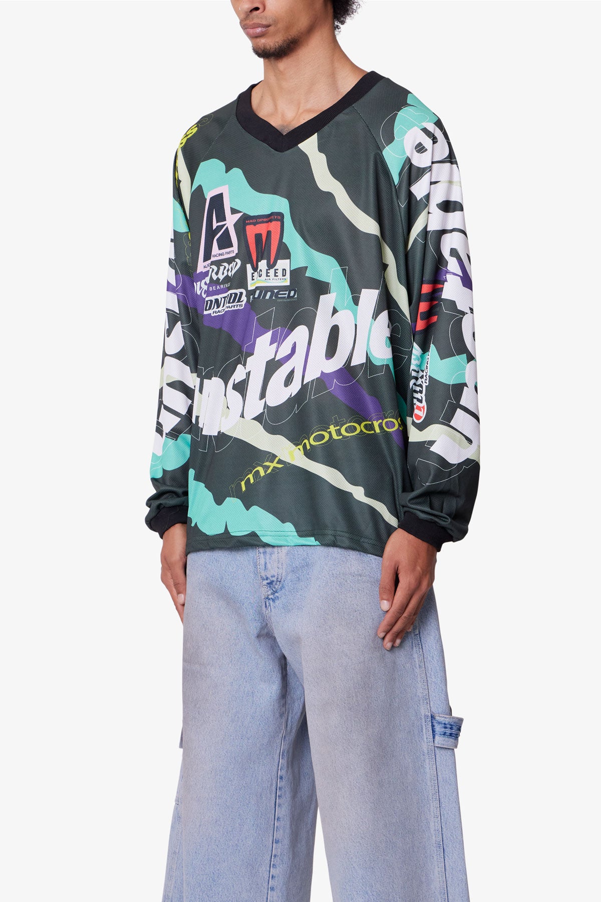 Constructed from 100% polyester. this motocross-inspired jersey features roll-printed artwork with graphic multicolored motifs. Designed with a V neck and raglan sleeves for increased mobility. it includes ribbed trim at the neckline and sleeve cuffs. Finished with a chest logo graphic and unstable text across the front.
