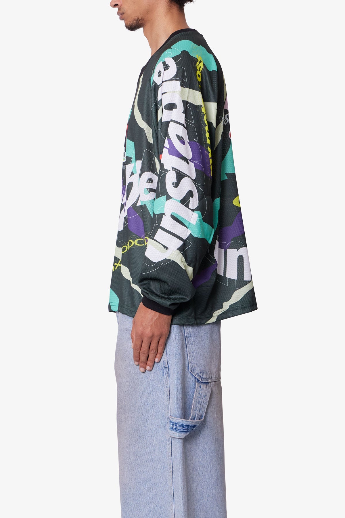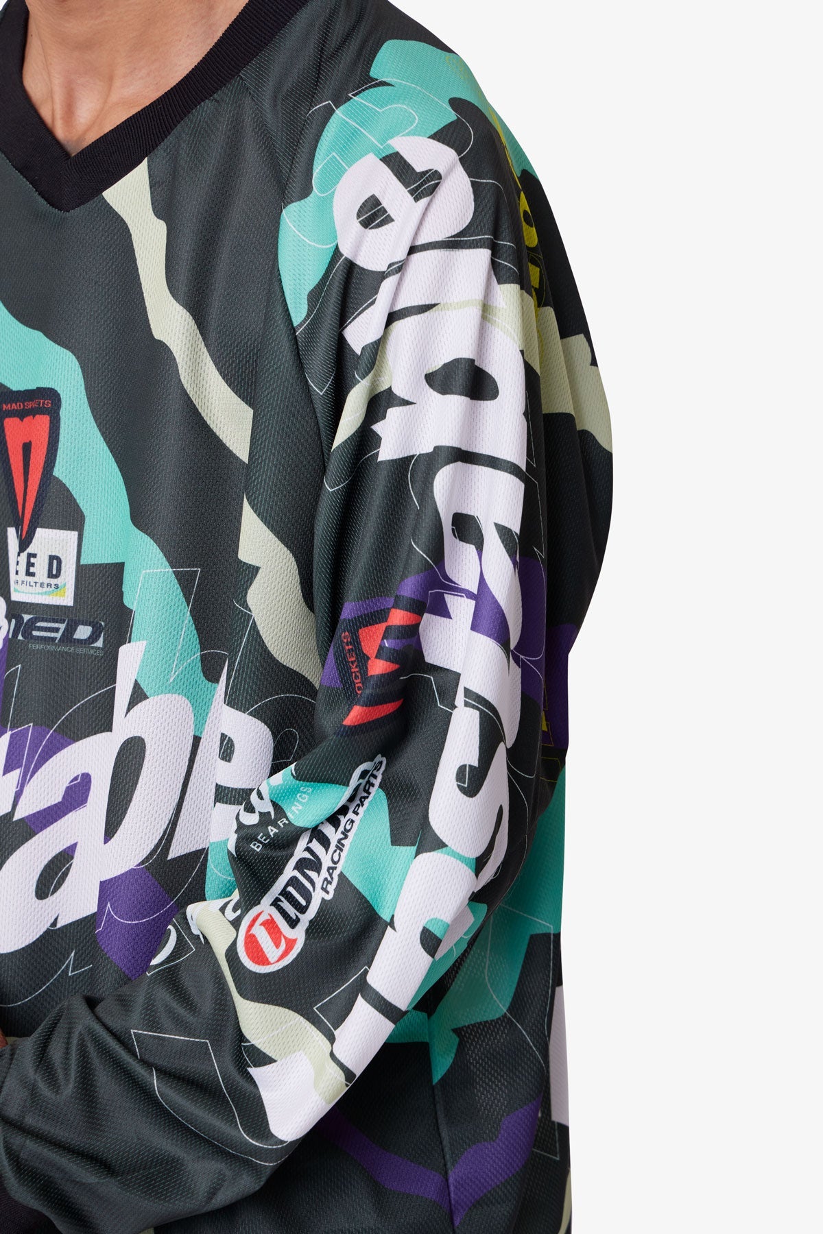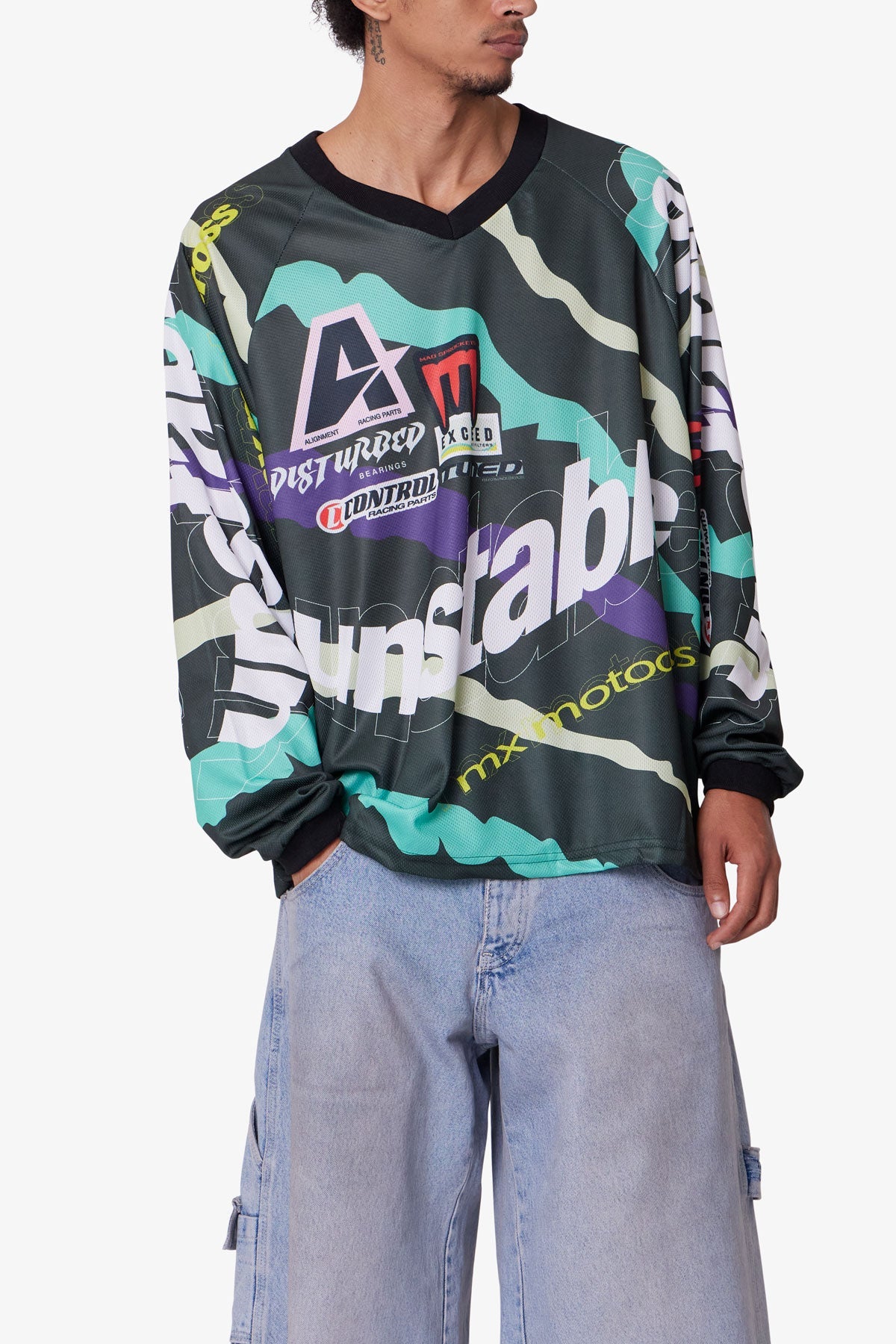 Constructed from 100% polyester. this motocross-inspired jersey features roll-printed artwork with graphic multicolored motifs. Designed with a V neck and raglan sleeves for increased mobility. it includes ribbed trim at the neckline and sleeve cuffs. Finished with a chest logo graphic and unstable text across the front.