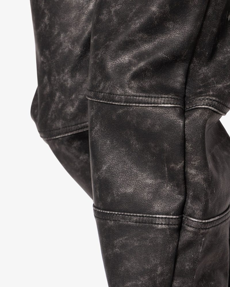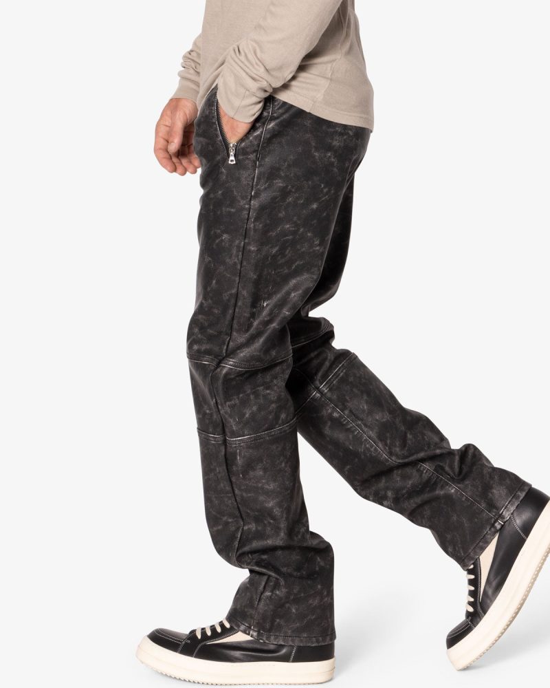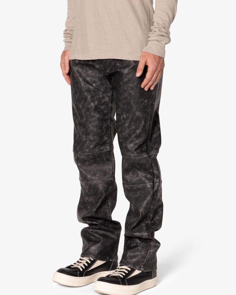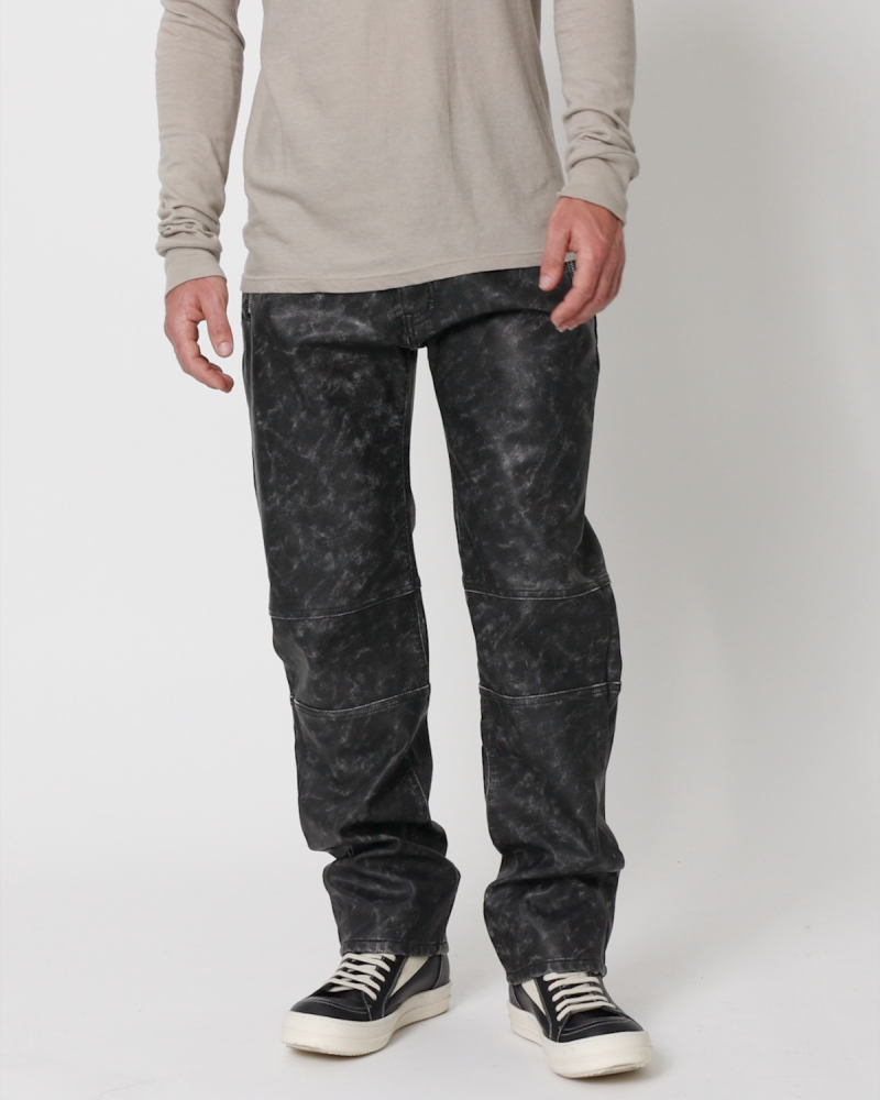 the V706 Washed Leather Pants is designed with our new V fit which is relaxed throughout. has a black gradient faux leather fabric made of 100% cotton. panel stitching along the knees. and charming zipper lined pockets.
