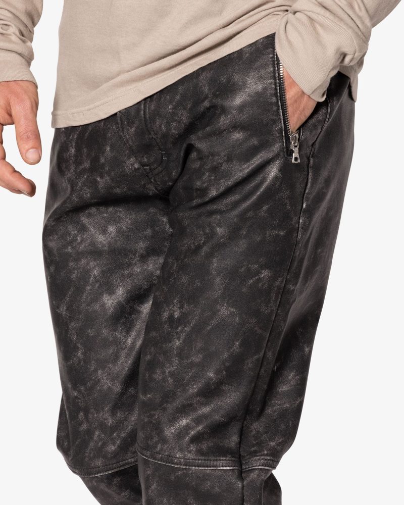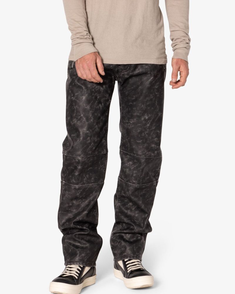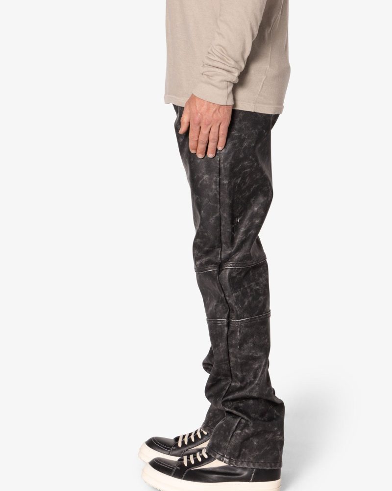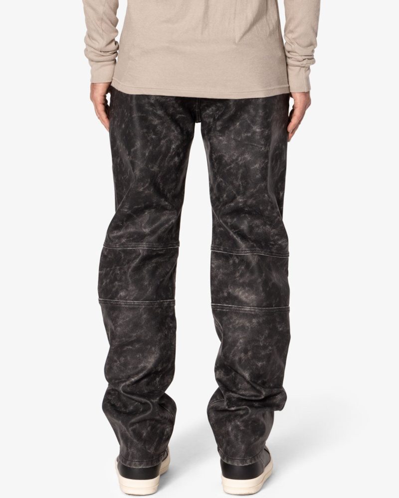 the V706 Washed Leather Pants is designed with our new V fit which is relaxed throughout. has a black gradient faux leather fabric made of 100% cotton. panel stitching along the knees. and charming zipper lined pockets.