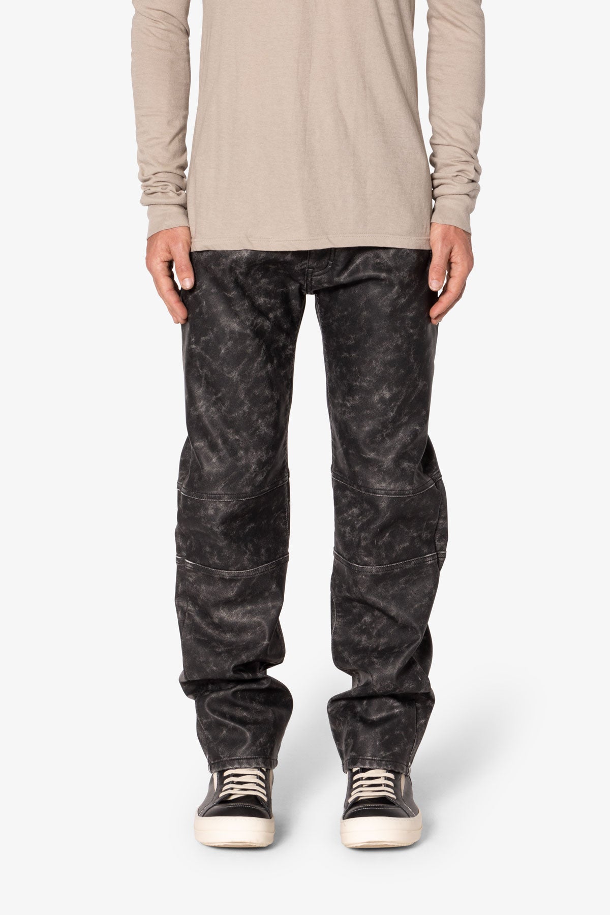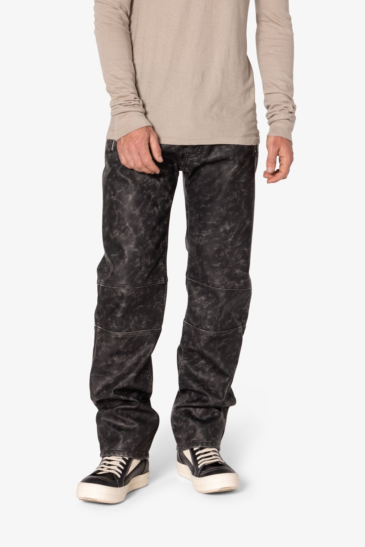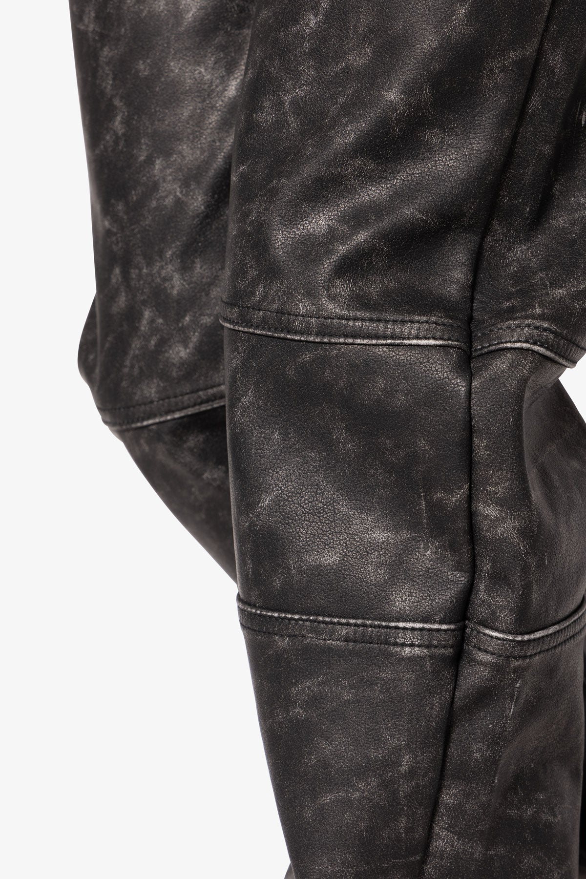 the V706 Washed Leather Pants is designed with our new V fit which is relaxed throughout. has a black gradient faux leather fabric made of 100% cotton. panel stitching along the knees. and charming zipper lined pockets.