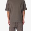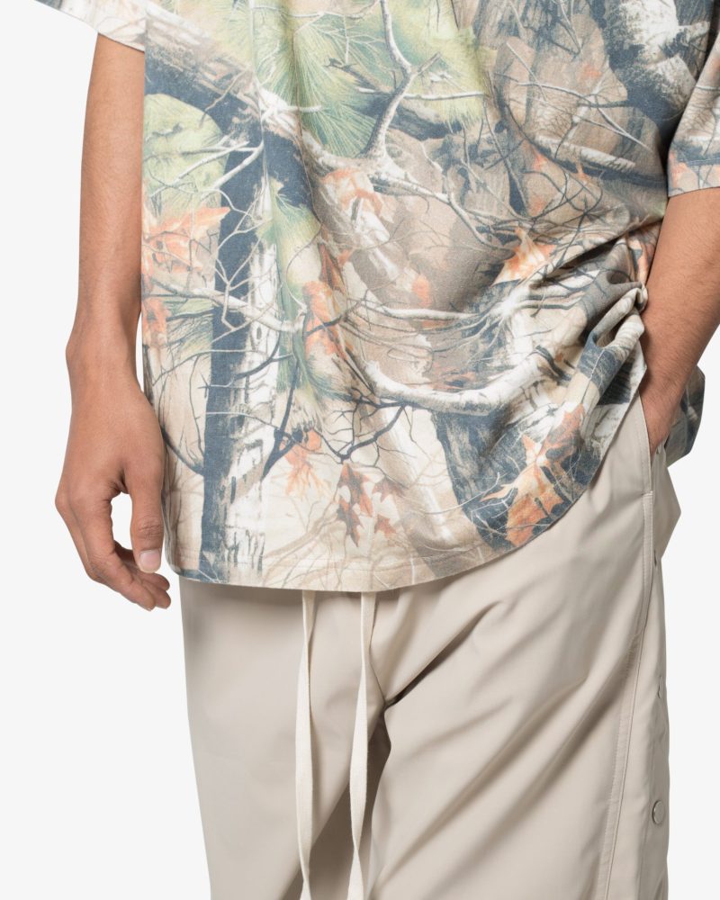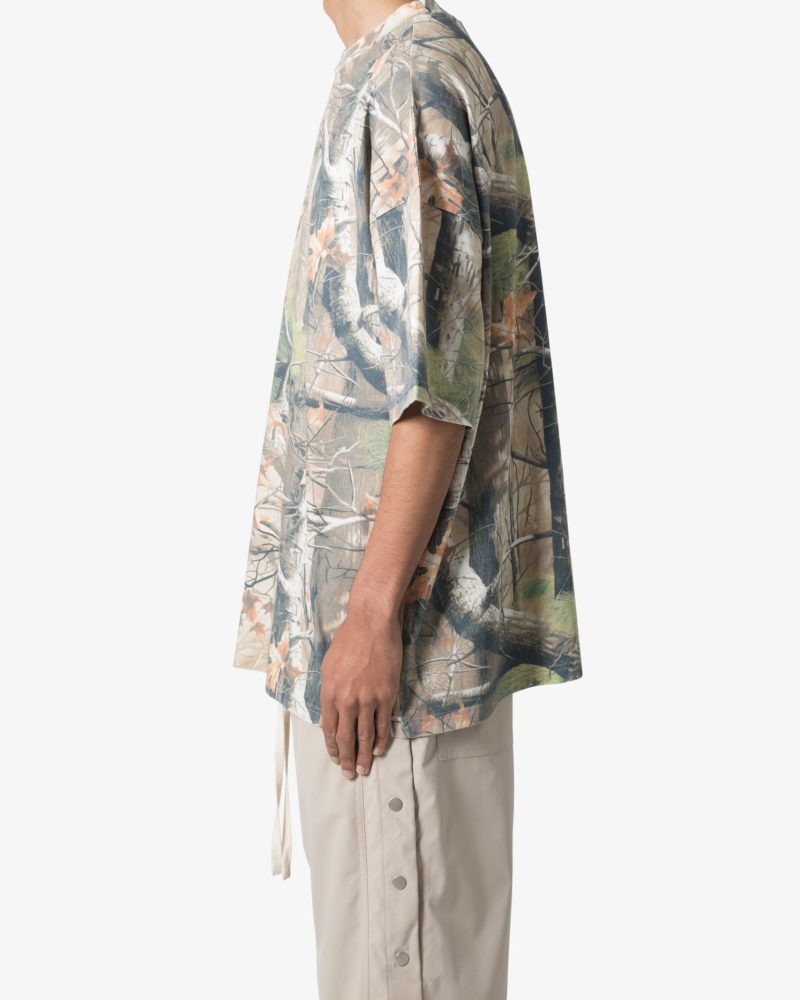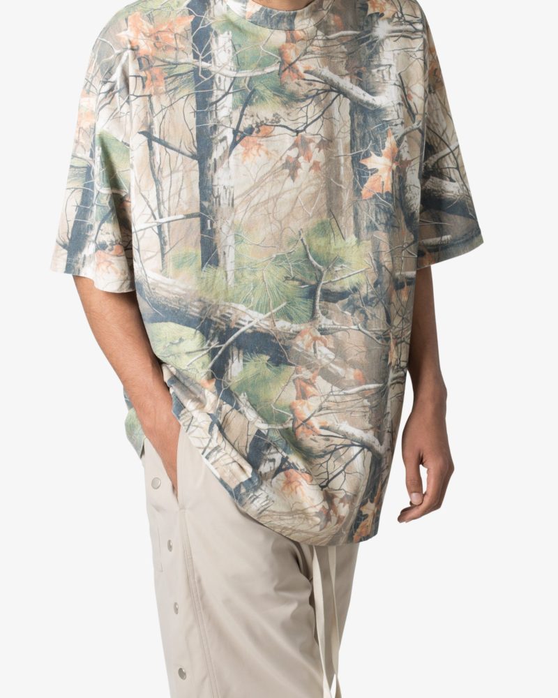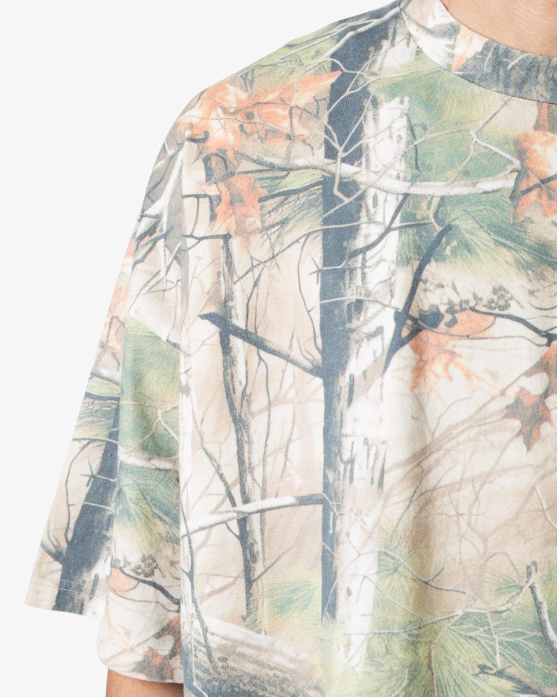the Vintage Camo Tee features a flat hem line and an extended shoulder seam for a relaxed. dropped shoulder fit. constructed from a washed roll printed camo cotton fabric. and finished with a higher collar.