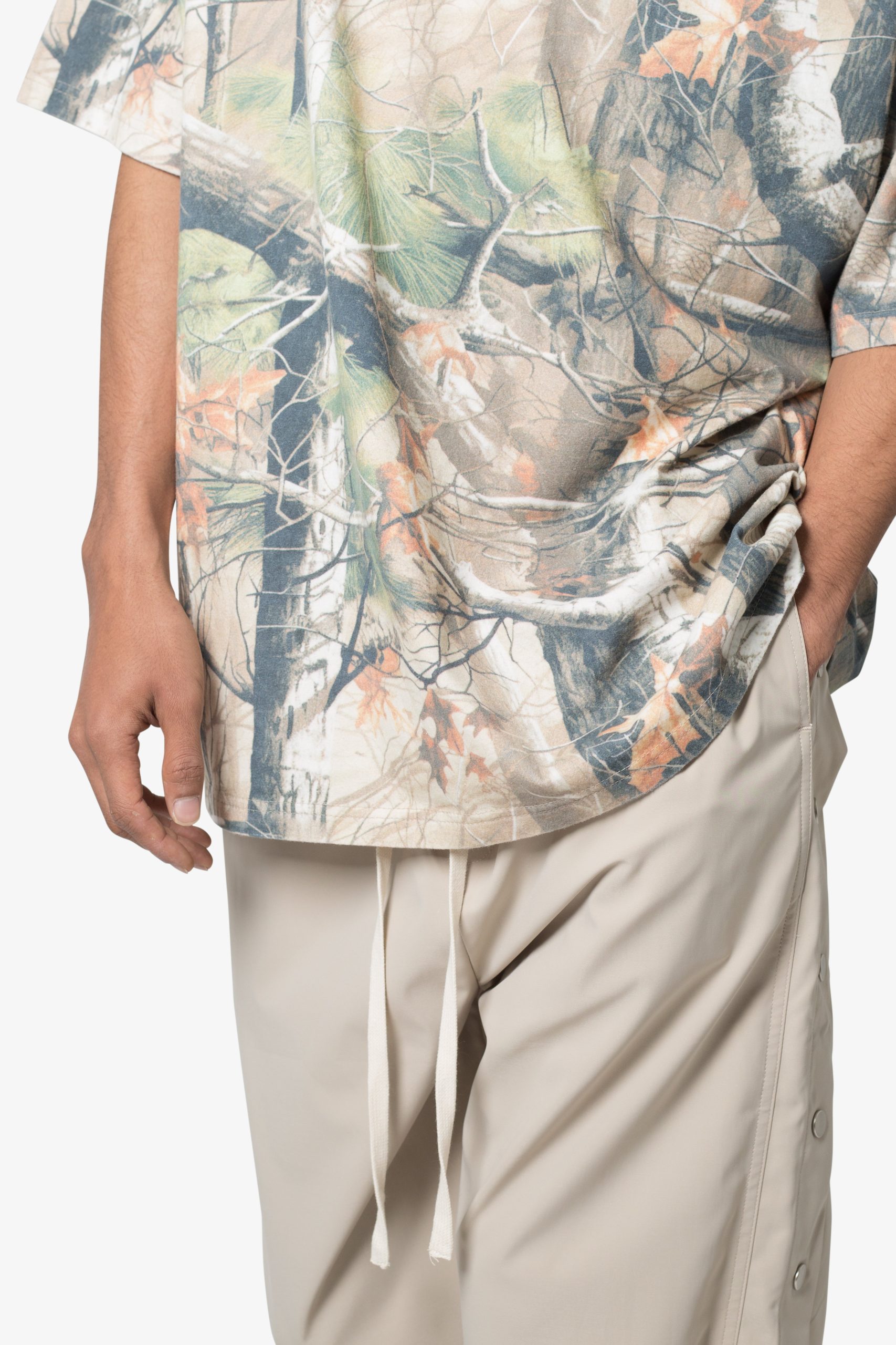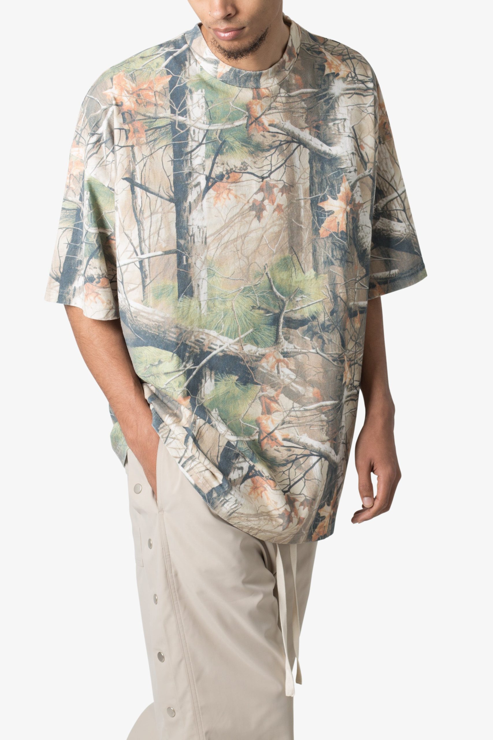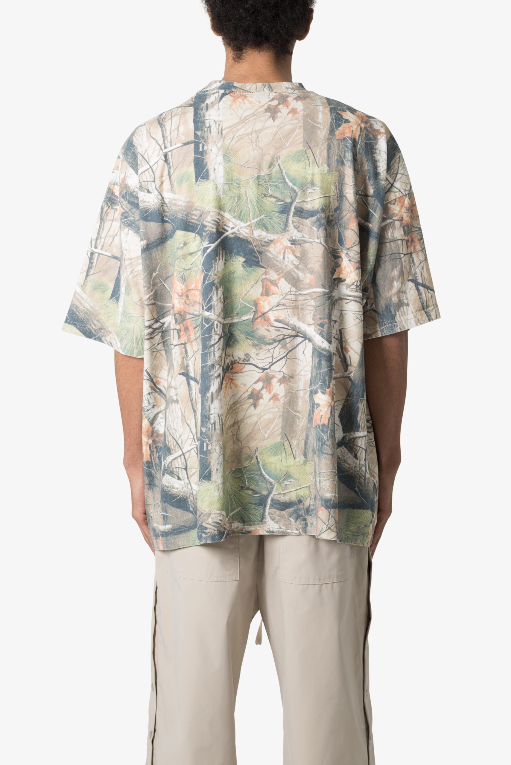 the Vintage Camo Tee features a flat hem line and an extended shoulder seam for a relaxed. dropped shoulder fit. constructed from a washed roll printed camo cotton fabric. and finished with a higher collar.